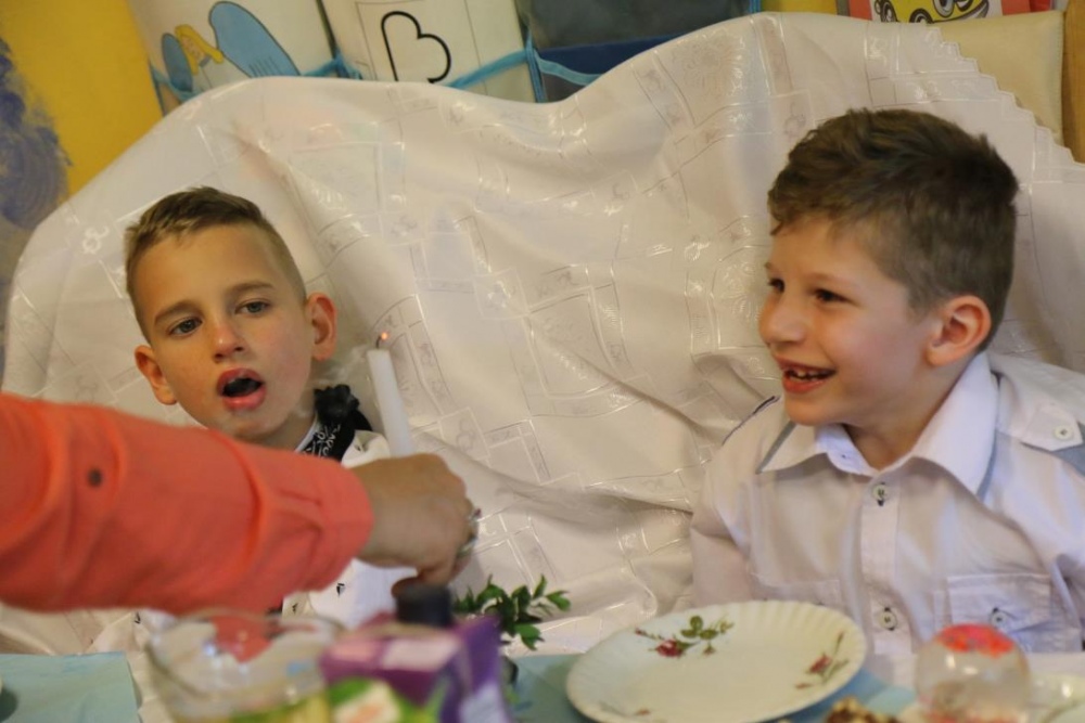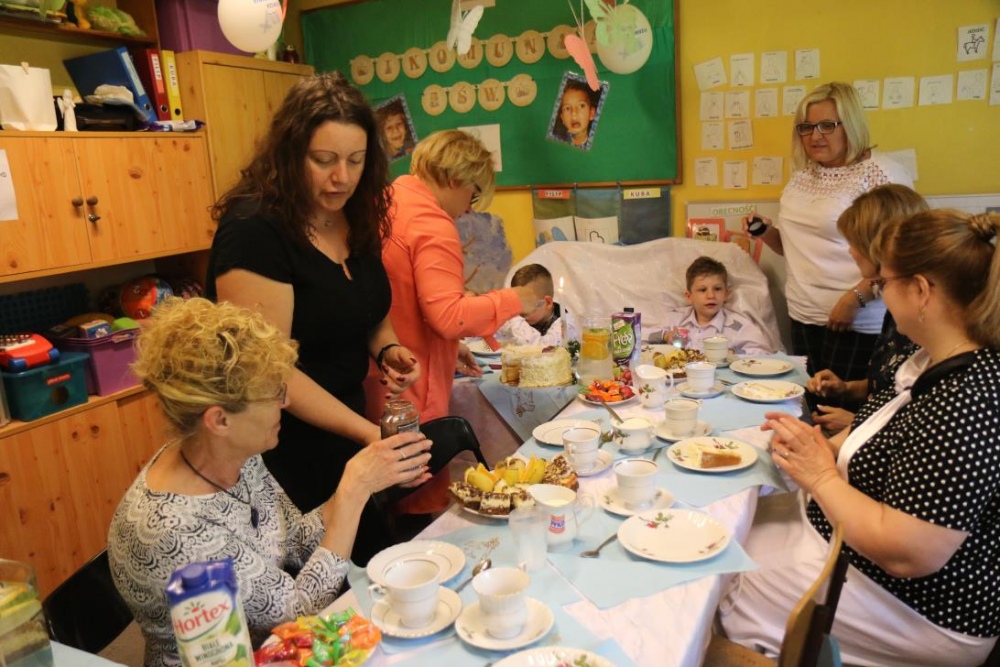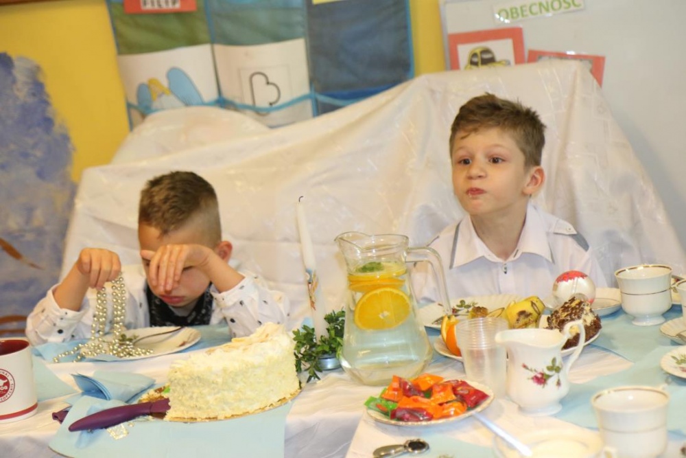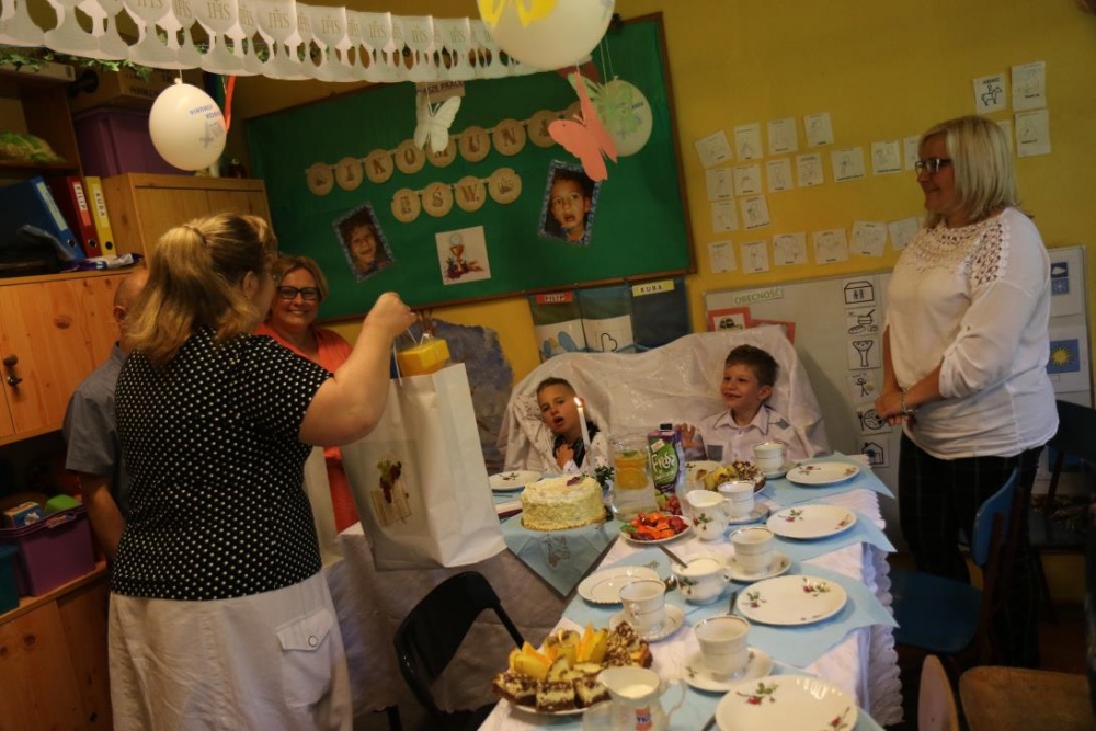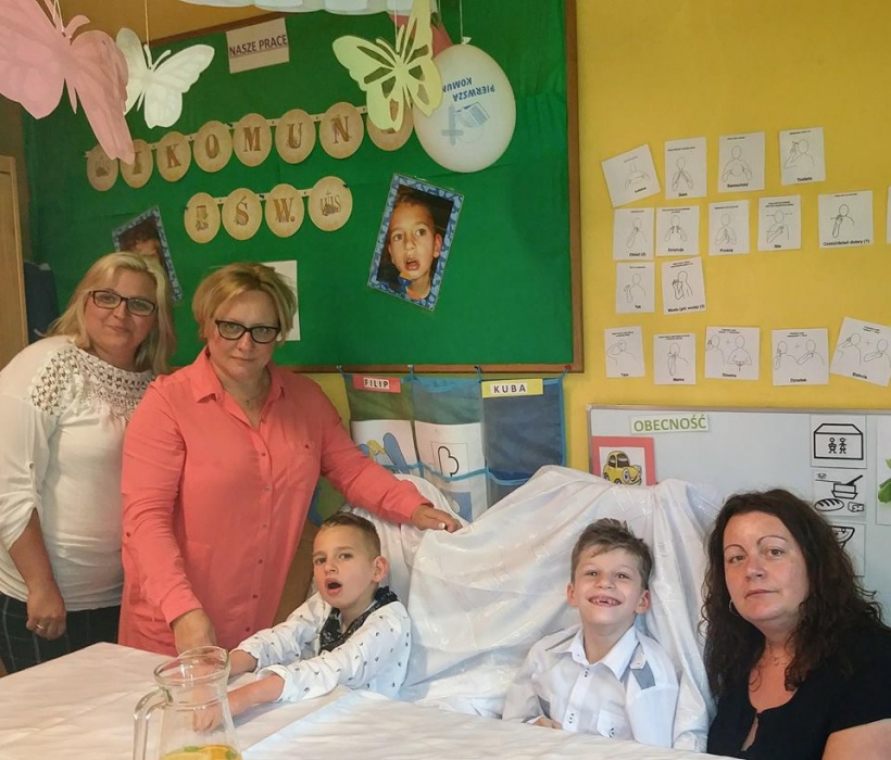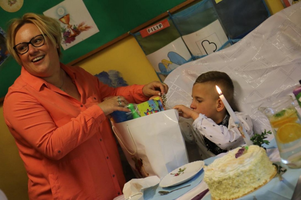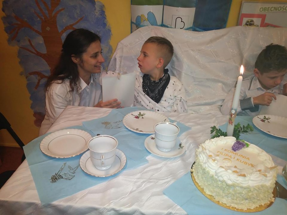 Dnia 15 maja 2018 r., między innymi, chłopcy z naszego oddziału przedszkolnego Filip i Kuba przyjęli I Komunię Świętą. Z tej okazji dzień później panie z przedszkola: Monika,Beata i Bernatka, przygotowały jeszcze jeden prezent „PRZYJĘCIE POKOMUNIJNE”, na które zaproszeni byli goście: nauczyciele prowadzący z chłopcami zajęcia rewalidacyjne oraz obie panie dyrektor. Uśmiechów ,życzeń i radości było co niemiara :).