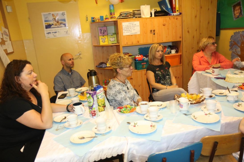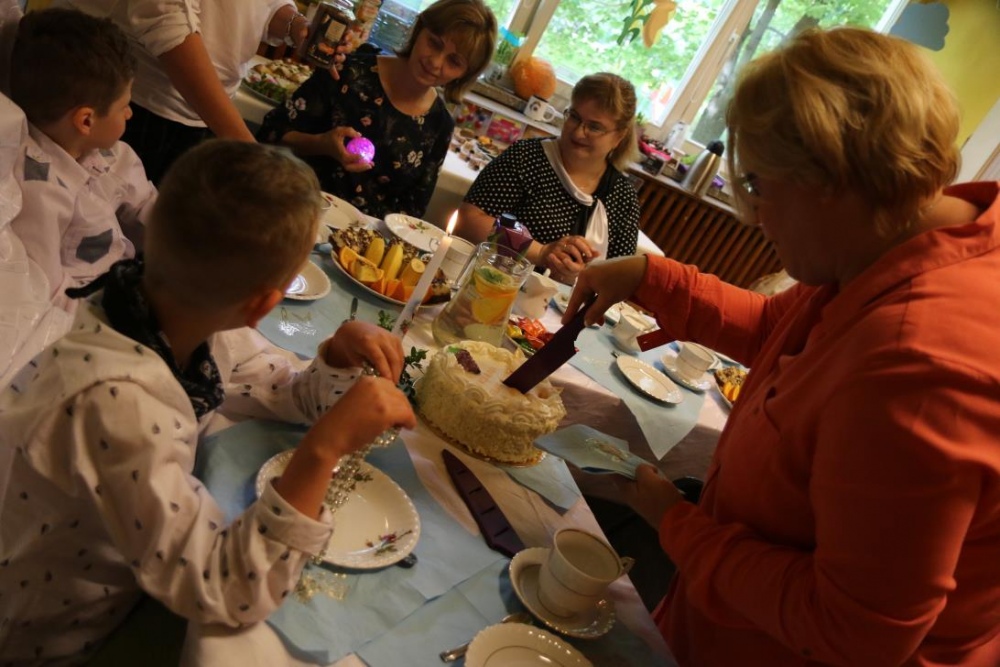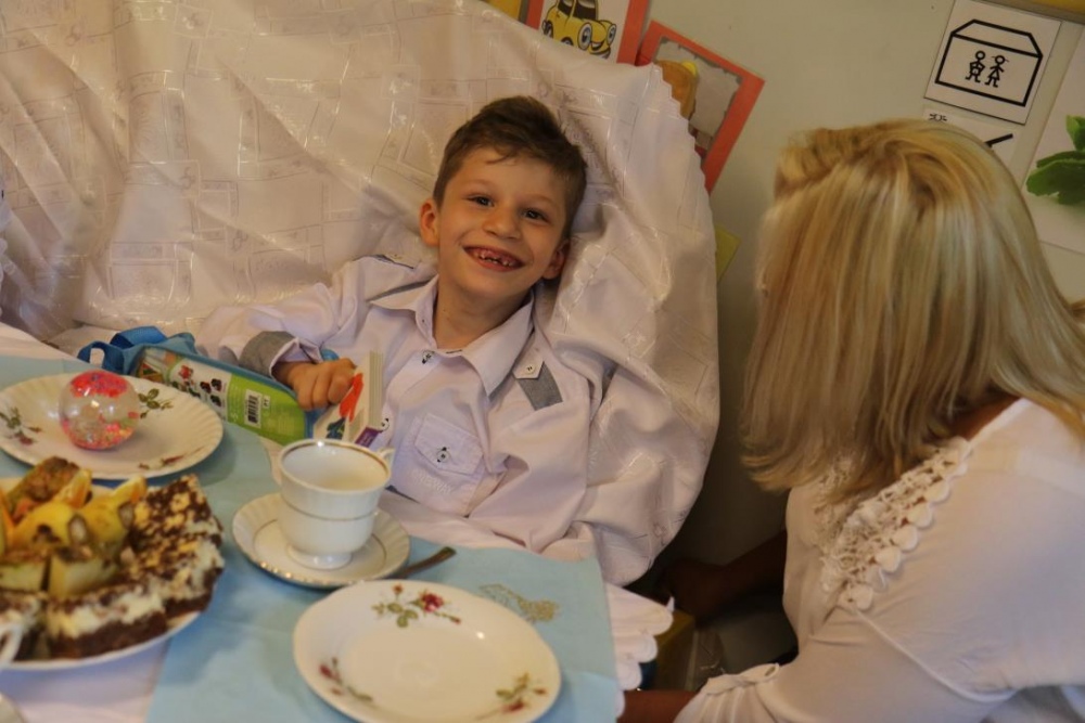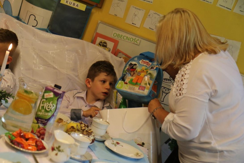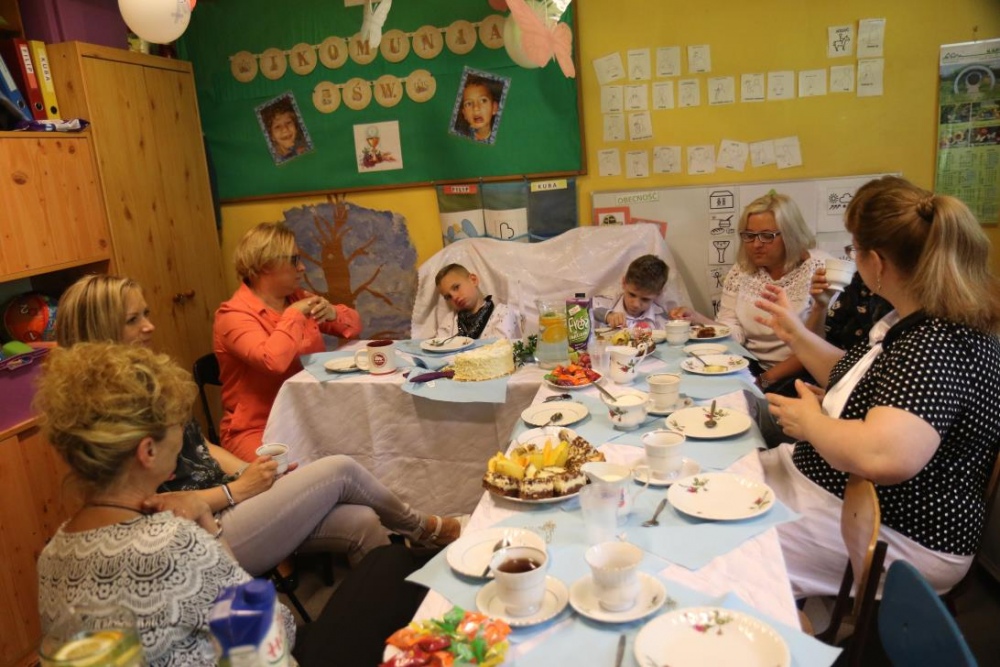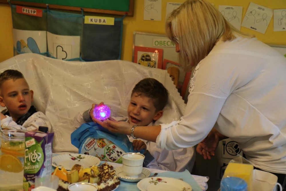 Dnia 15 maja 2018 r., między innymi, chłopcy z naszego oddziału przedszkolnego Filip i Kuba przyjęli I Komunię Świętą. Z tej okazji dzień później panie z przedszkola: Monika,Beata i Bernatka, przygotowały jeszcze jeden prezent „PRZYJĘCIE POKOMUNIJNE”, na które zaproszeni byli goście: nauczyciele prowadzący z chłopcami zajęcia rewalidacyjne oraz obie panie dyrektor. Uśmiechów ,życzeń i radości było co niemiara :).