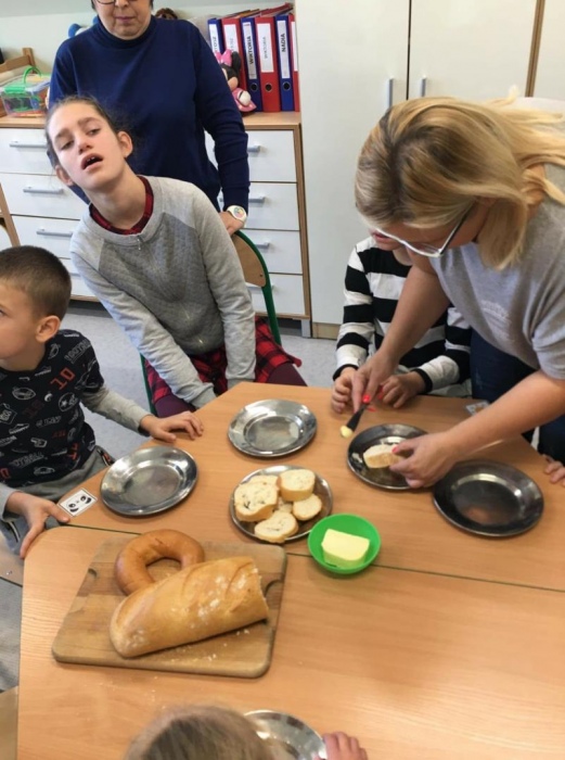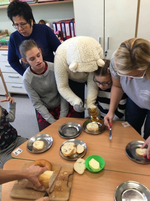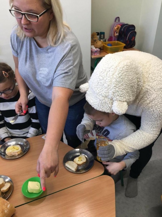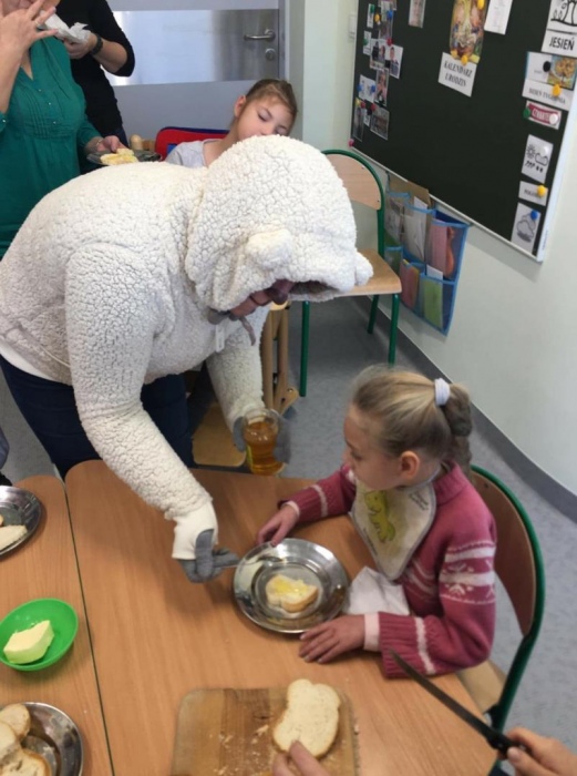 Prócz pluszaków do szkoły przyszedł gość specjalny Duży Pluszowy Miś, który razem z dziećmi bawił się, śpiewał oraz wspólnie z nimi zjadł bardzo zdrowe śniadanko , czyli bagietki, rogaliki i herbatkę z MIODKIEM - mniam. Do zobaczenia Misiu za rok.