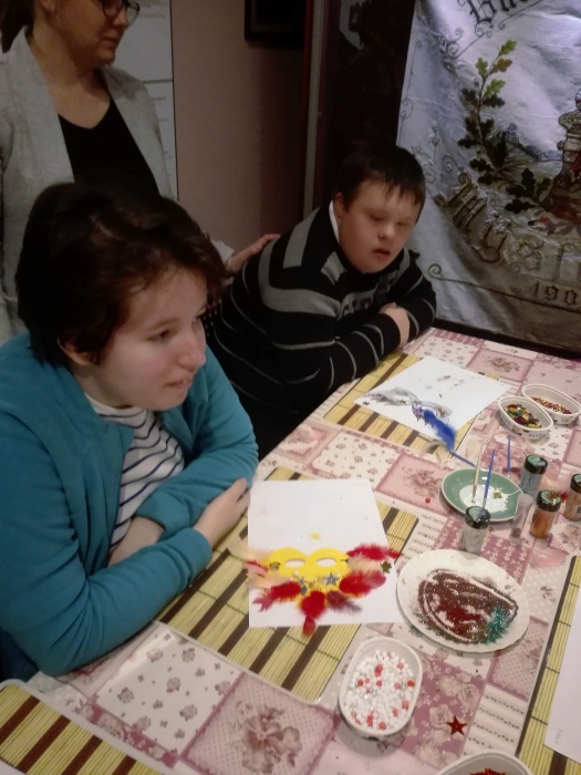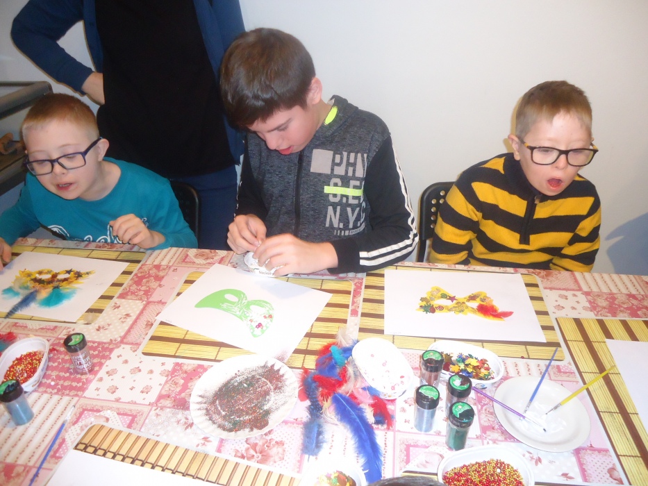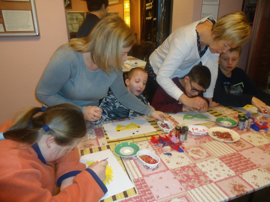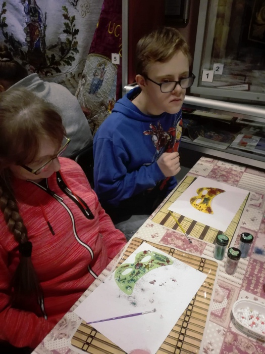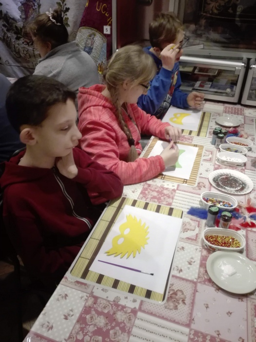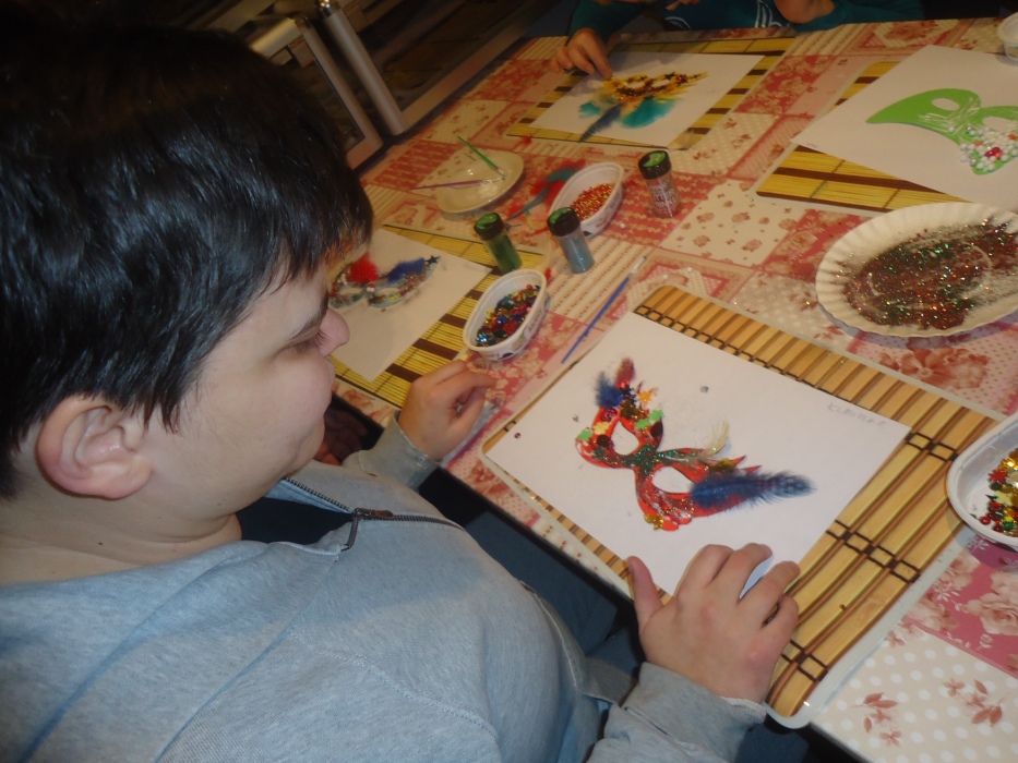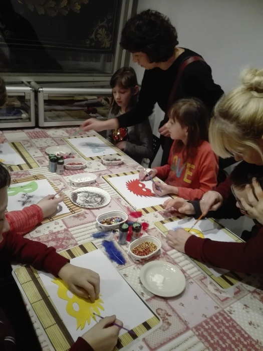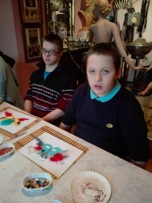 Tym razem warsztay poświęcone były tematyce karnawałowej. Na początku pani prowadząca nawiązała do historii bali karnawałowych, prezentując uczniom ilustracje i stare maski karnawałowe. W dalszej części spotkania uczniowie pracowali już sami ozdabiając maski przy pomocy różnorodnych ozdób: koralików, cekinów, brokatu i piórek. Każda z powstalych masek byłą wyjątkowa i niezwykle kolorowa.