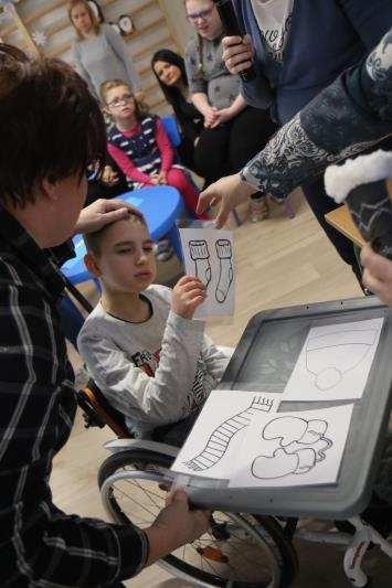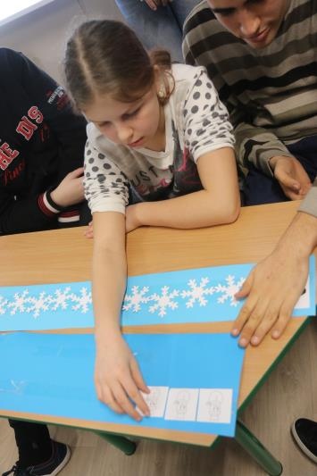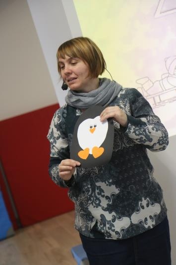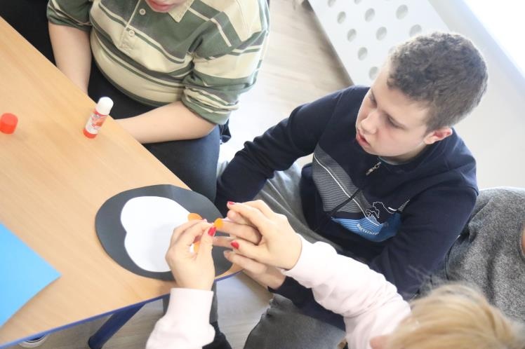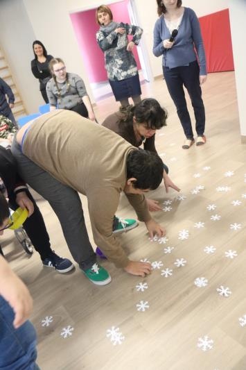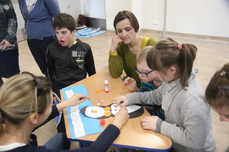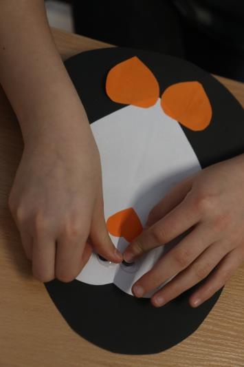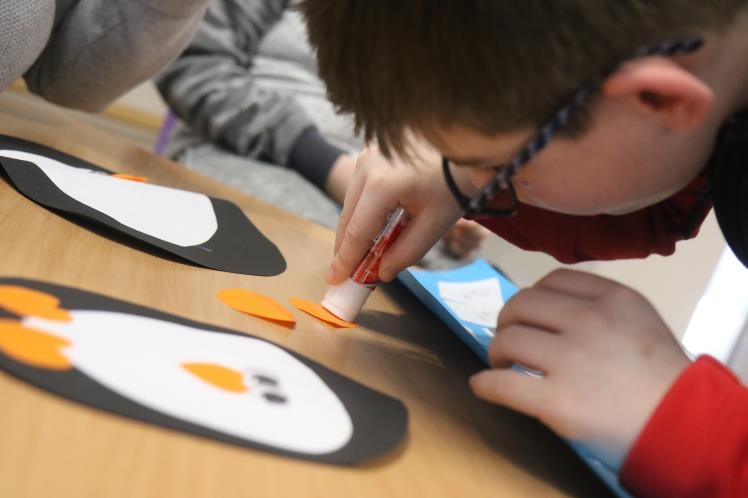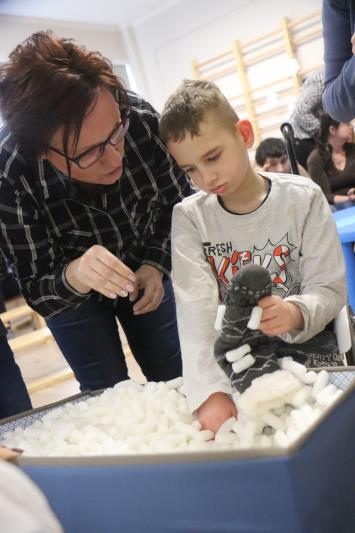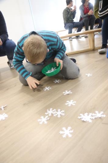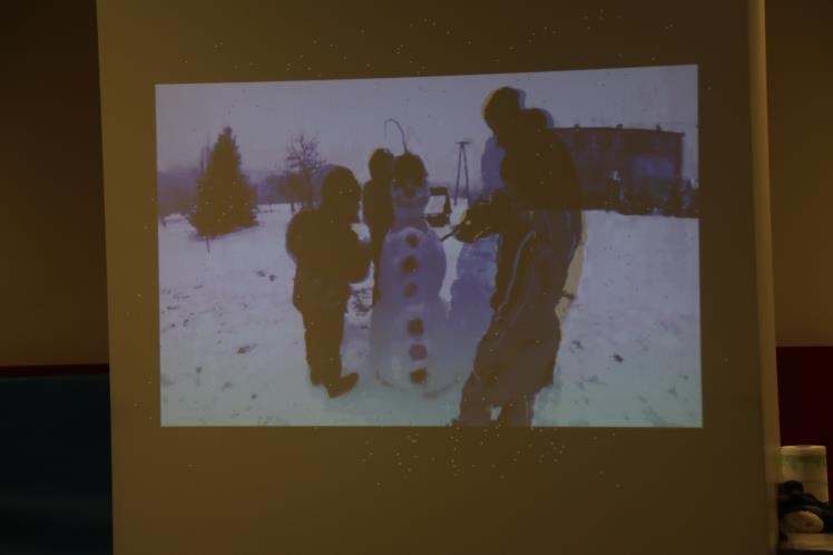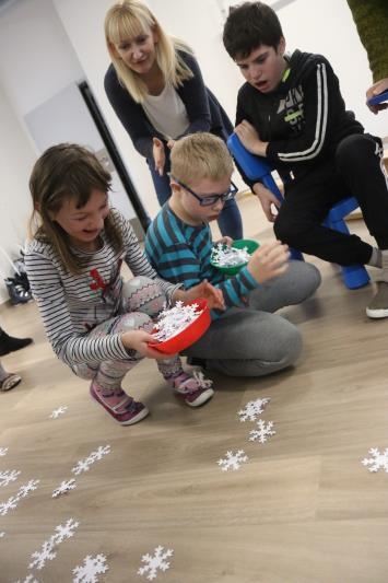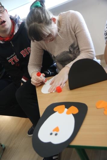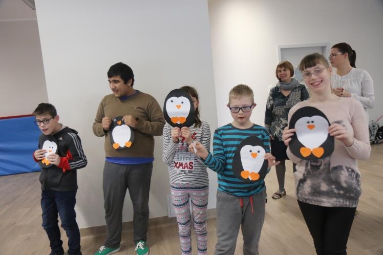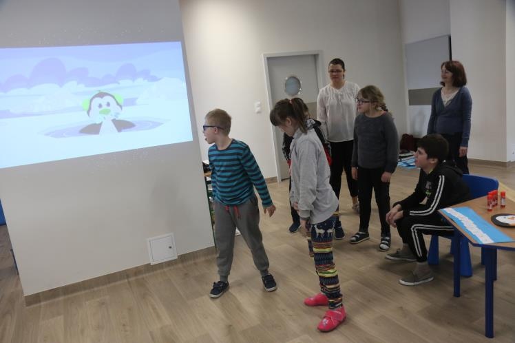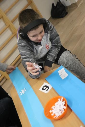 W zimową atmosferę wprowadziła nas zabawa kostkami lodu oraz zbieranie i liczenie papierowych śnieżynek. Przypomnieliśmy sobie jak należy się ubrać na zimowy spacer oraz jakie sprzęty przydają się podczas zabaw na śniegu. Było też zadanie związane z dokarmianiem zwierząt. Na koniec konkursu poznaliśmy zwierzęta ,które lubią śnieg i lód oraz zrobiliśmy pingwiny z kolorowego papieru. Zadaniom konkursowym towarzyszyły piosenki i zabawy ruchowe związane z porą roku.