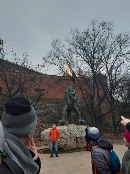 Potem pojechaliśmy do Krakowa na trzygodzinny spacer po jednym z najpiękniejszych polskich miast. Zwiedziliśmy Kościół Mariacki, Sukiennice i Wawel, gdzie mieliśmy okazję zobaczyć jak słynny wawelski smok…zieje ogniem.