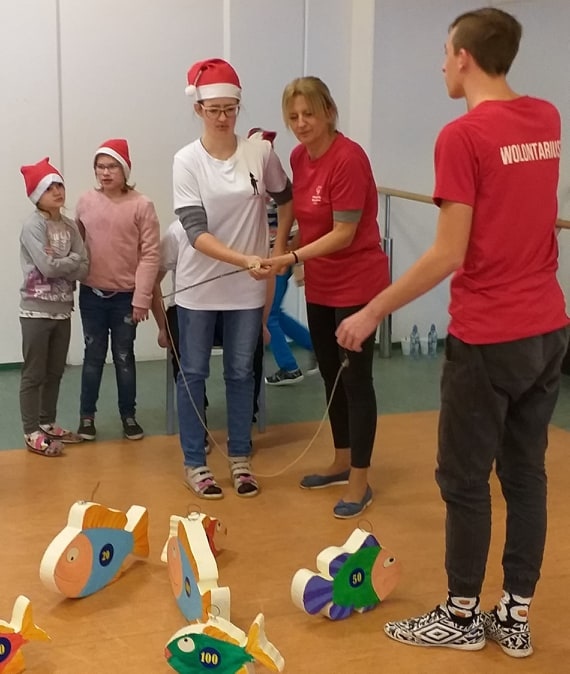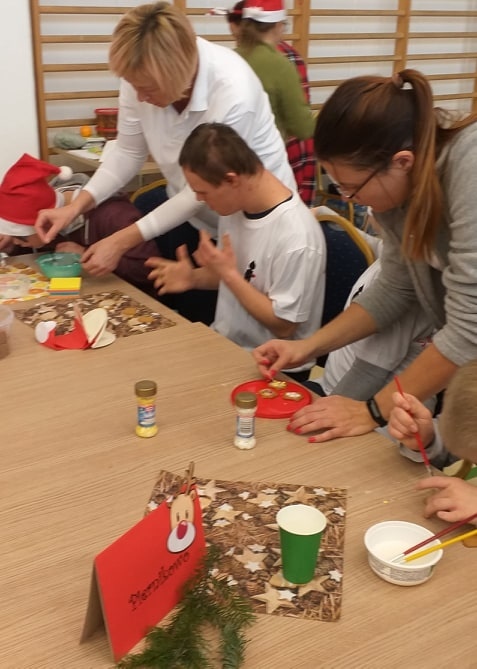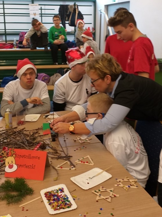 Spotkanie odbyło się w atmosferze bożonarodzeniowych świąt. Nasi uczniowie wzięli udział w warsztatach. Mieli możliwość samodzielnego wykonania świątecznych dekoracji, lukrowali i zdobili pierniczki oraz uczestniczyli w zabawach i konkursach sprawnościowych. Najwięcej emocji wywołało oczekiwanie na spotkanie ze Świętym Mikołajem, który kiedy w końcu dotarł, obdarował wszystkich uczestników prezentami i jeszcze znalazł czas na wspólne zdjęcie.