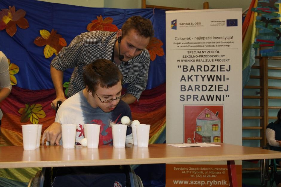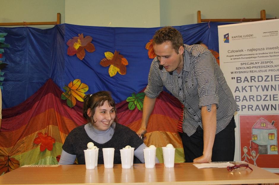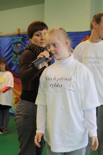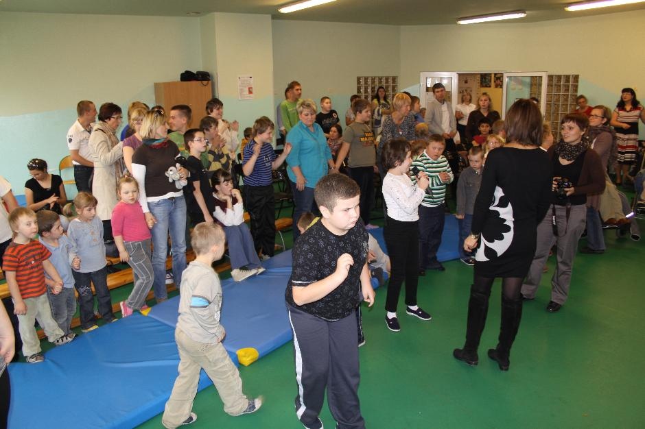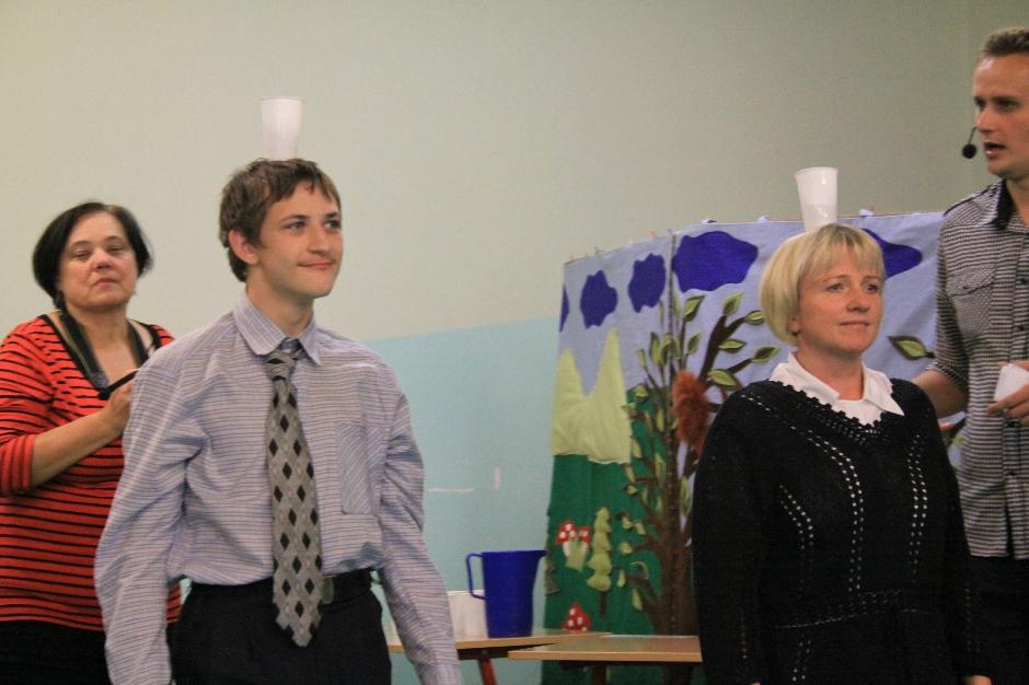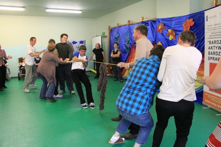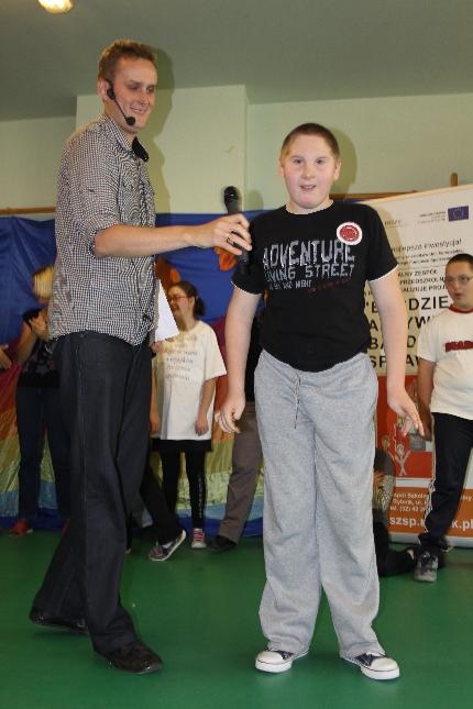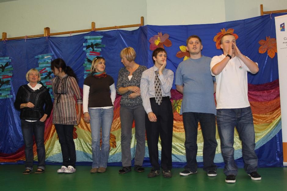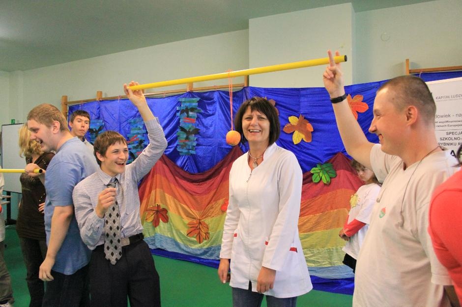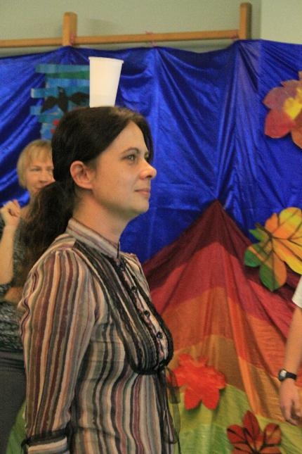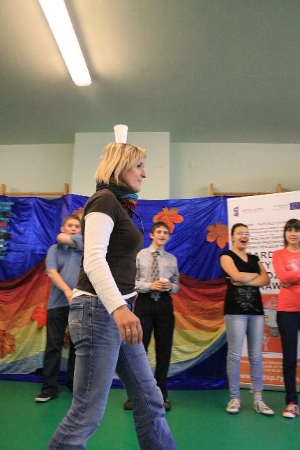 Uczniowie i nauczyciele zmierzyli się również w takich konkurencjach: zabawa w „krzesełka”, przenoszenie kubełka z wodą na głowie, „przedmuchiwanie” piłki z kubka do kubka, jedzenie zawieszonych jabłek, kalambury, przeciąganie liny. Na koniec dla wszystkich pracowników szkoły życzenia wyśpiewała Anna Wiśniewska, a uczniowie z klasy IV SP i z I b gimnazjum zaprezentowali wiersz o złotej rybce.