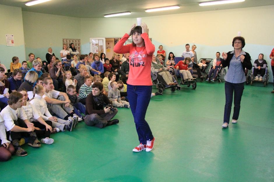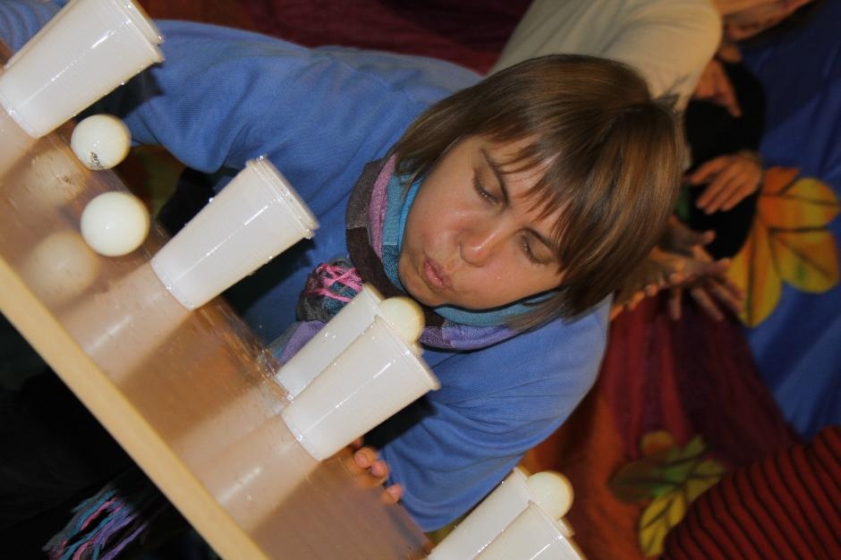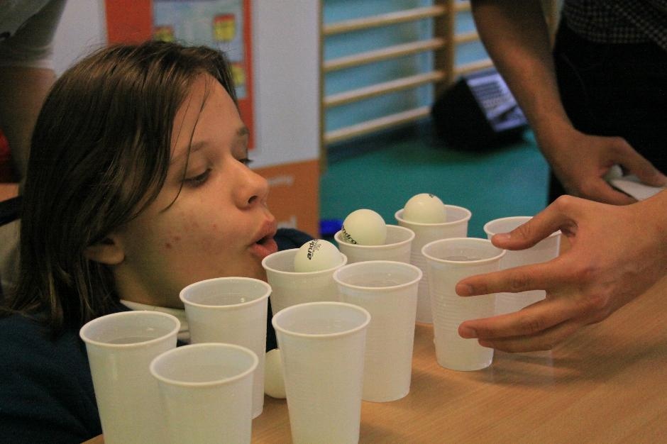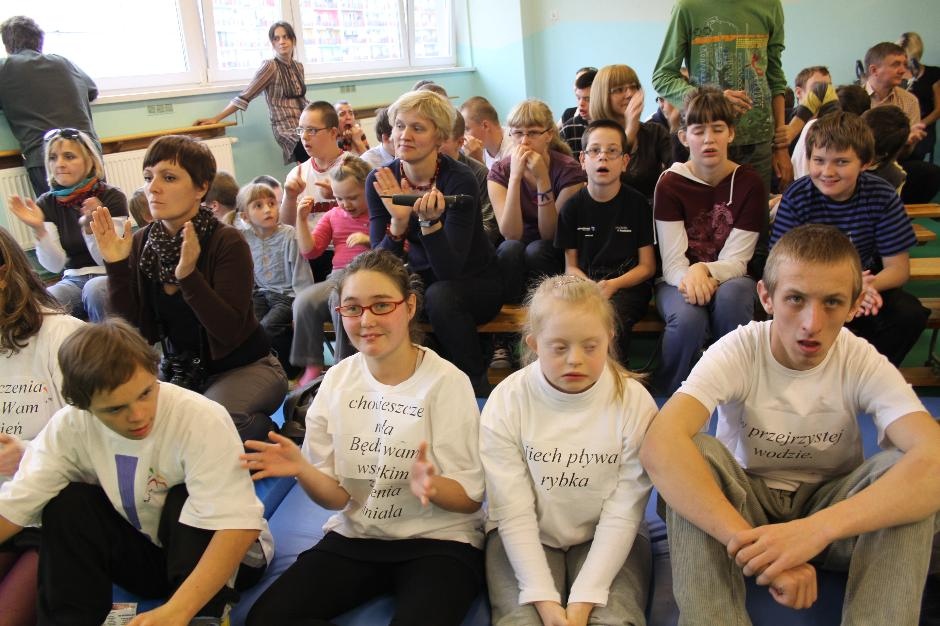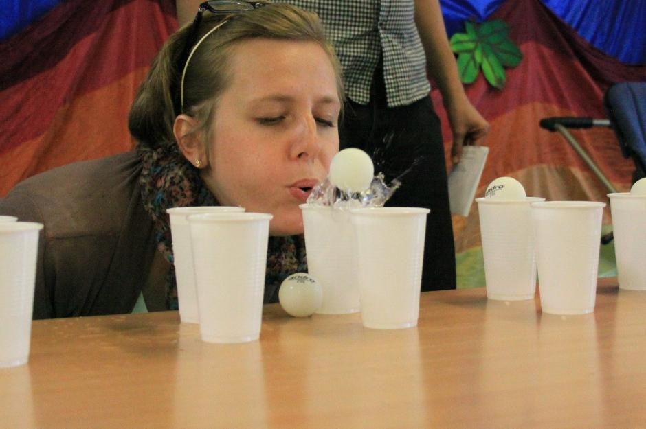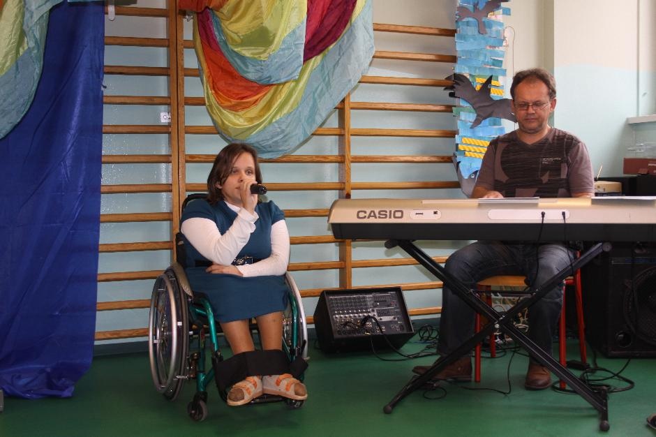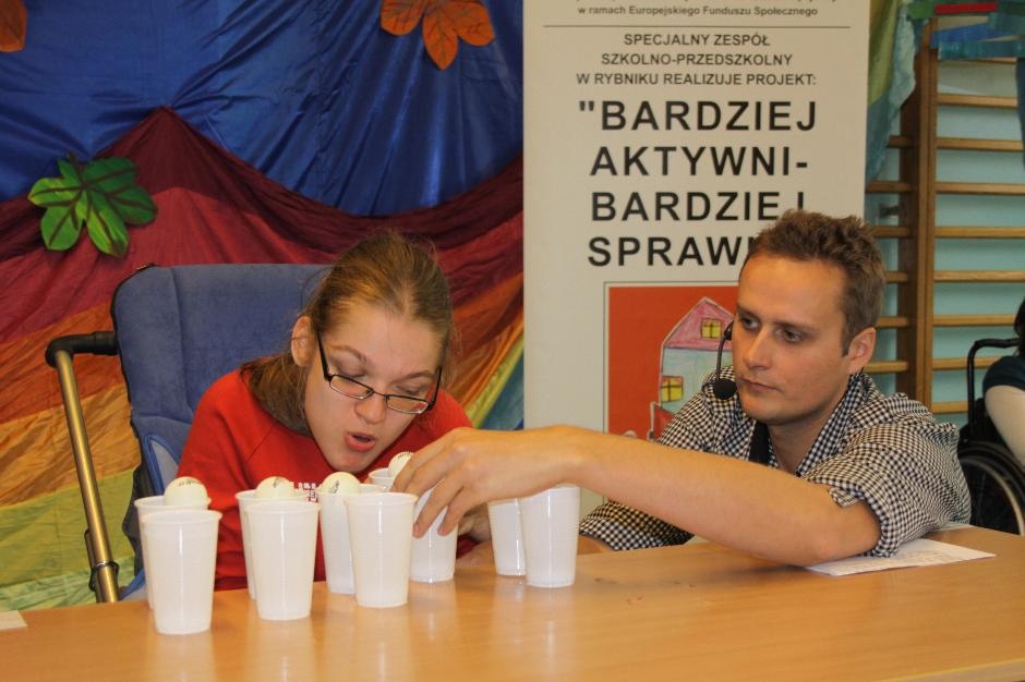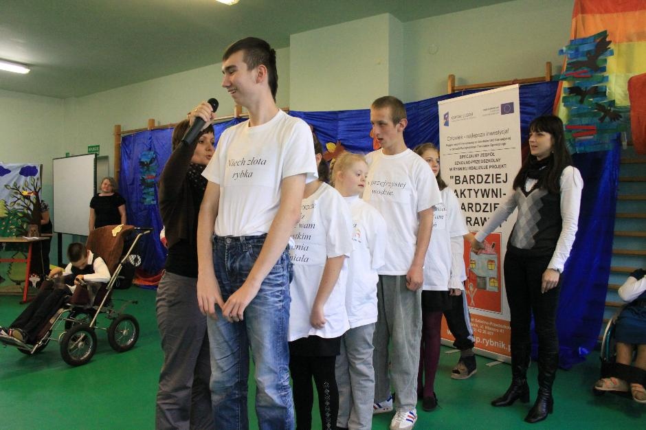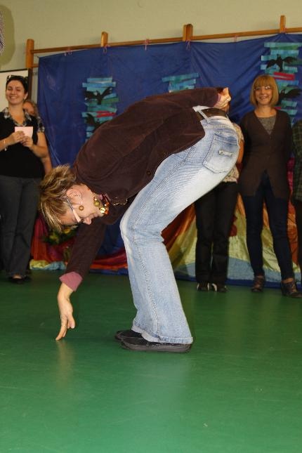 Uczniowie i nauczyciele zmierzyli się również w takich konkurencjach: zabawa w „krzesełka”, przenoszenie kubełka z wodą na głowie, „przedmuchiwanie” piłki z kubka do kubka, jedzenie zawieszonych jabłek, kalambury, przeciąganie liny. Na koniec dla wszystkich pracowników szkoły życzenia wyśpiewała Anna Wiśniewska, a uczniowie z klasy IV SP i z I b gimnazjum zaprezentowali wiersz o złotej rybce.