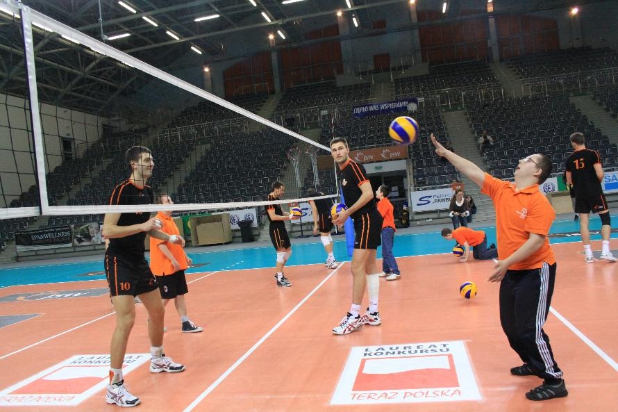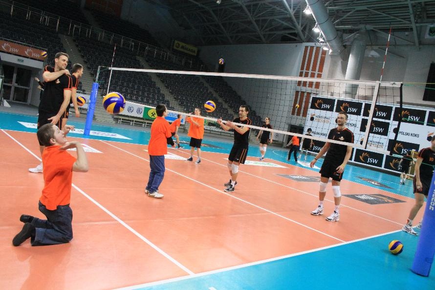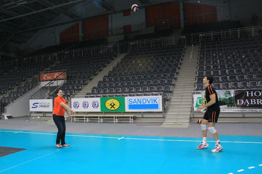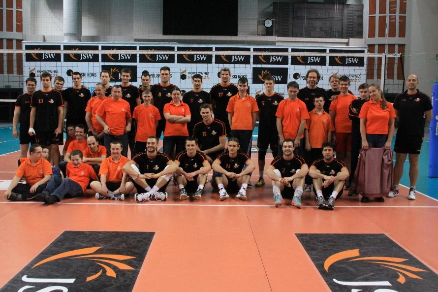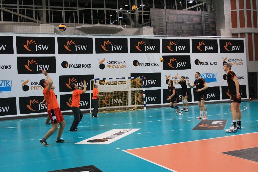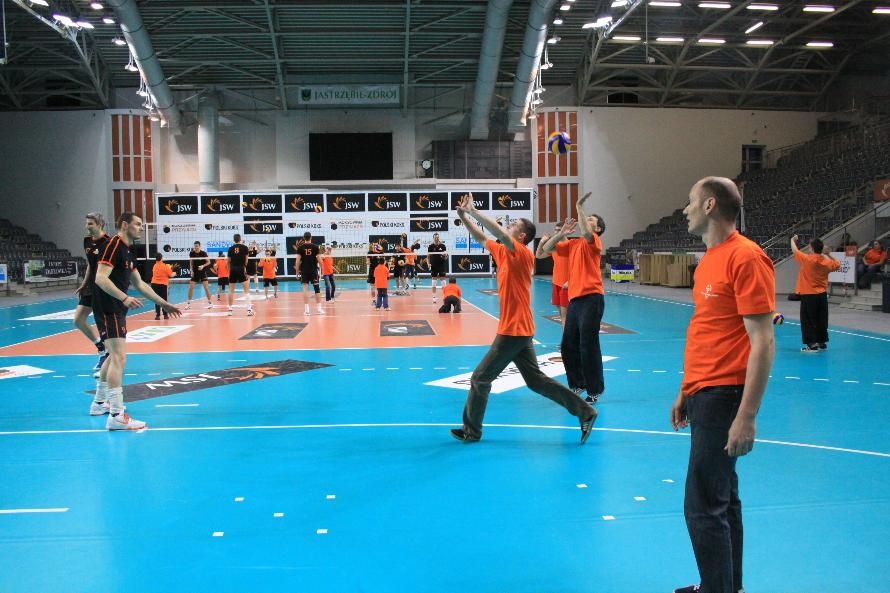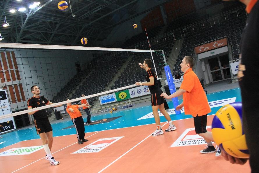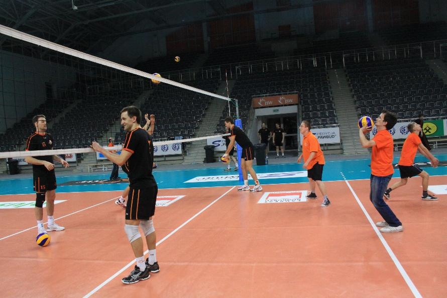Działacze i trenerzy JW zaprosili nas na wspólny trening, oferując wspaniałą zabawę i niezapomniane przeżycia. Piętnastu rybnickich sportowców najpierw przez ponad dwie godziny obserwowało treningowe zmagania zawodników, którzy, jak zauważył Grzegorz Trunk podczas meczu "liczyli punkty jakoś dziwnie" (na treningach siatkarze stosują dla własnych potrzeb inne zasady naliczania punktów). Później sami wkroczyli na boisko i pod okiem siatkarzy Jastrzębskiego Węgla wykonywali proste, nie tylko siatkarskie ćwiczenia z piłką.