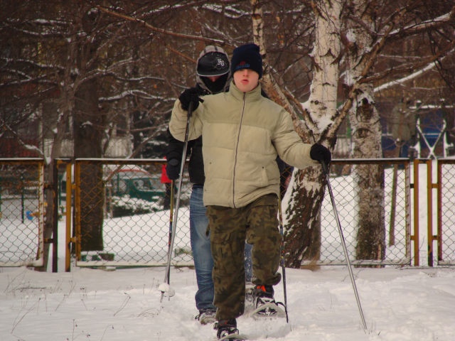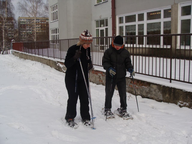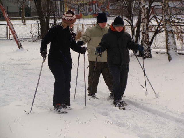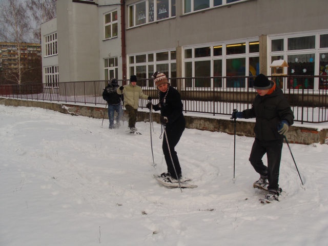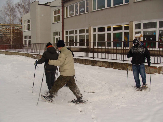 Mimo wielkich zasp śnieżnych nasi uczniowie z Kółka Sportowego dzielnie trenują na podwórku chodzenie na rakietach śnieżnych.