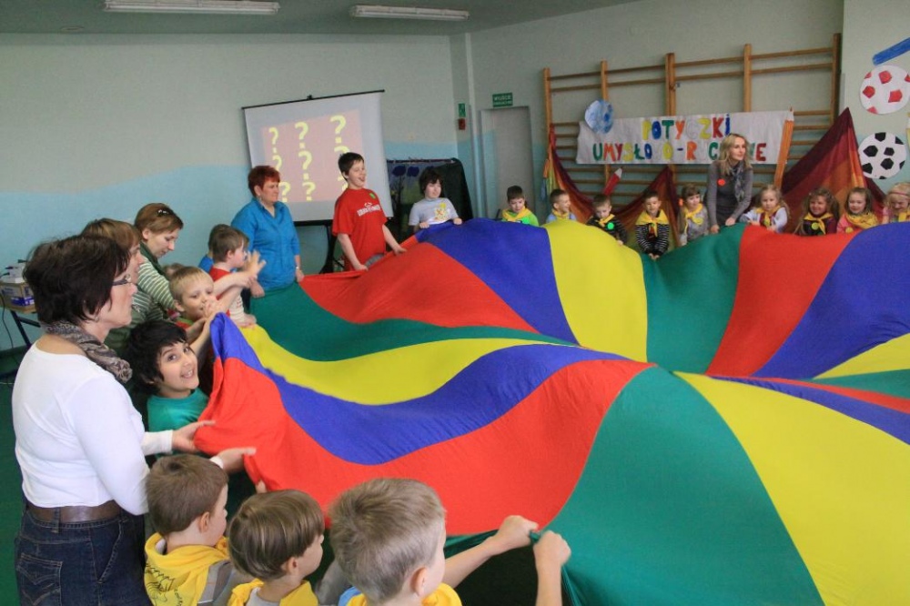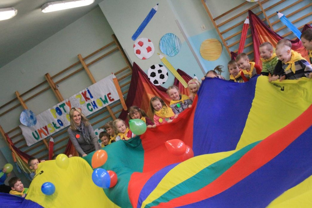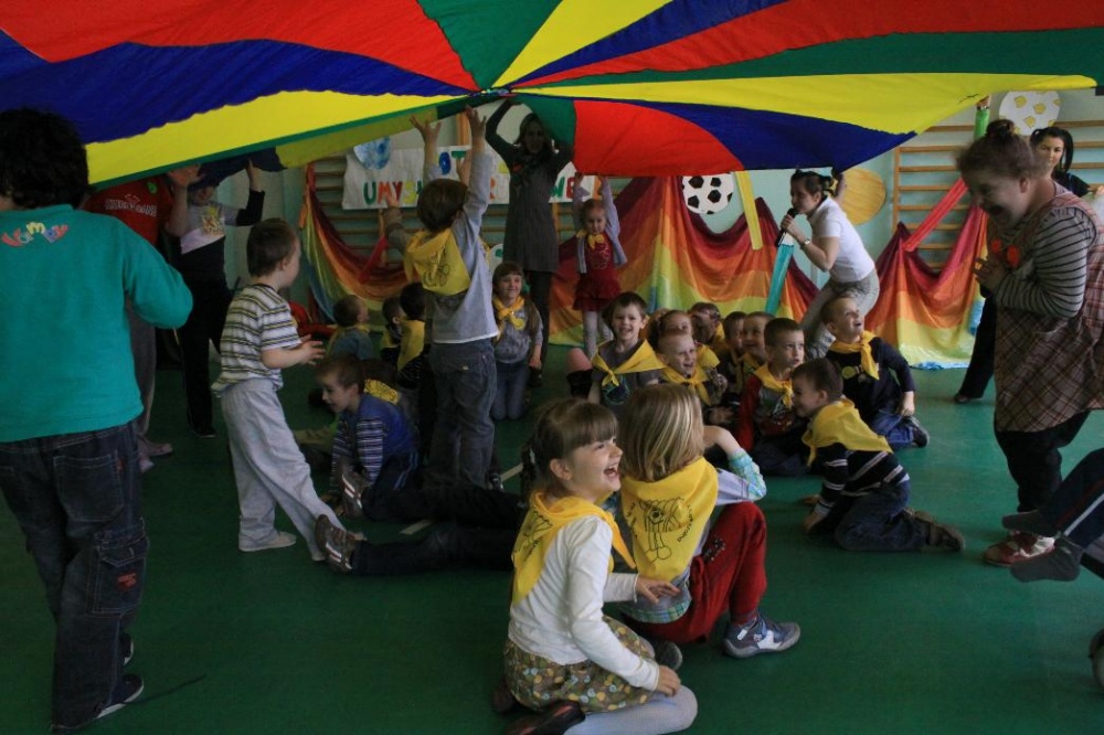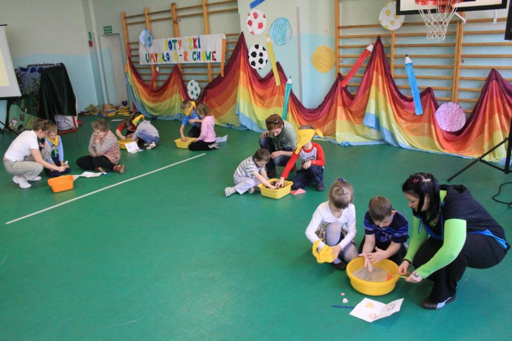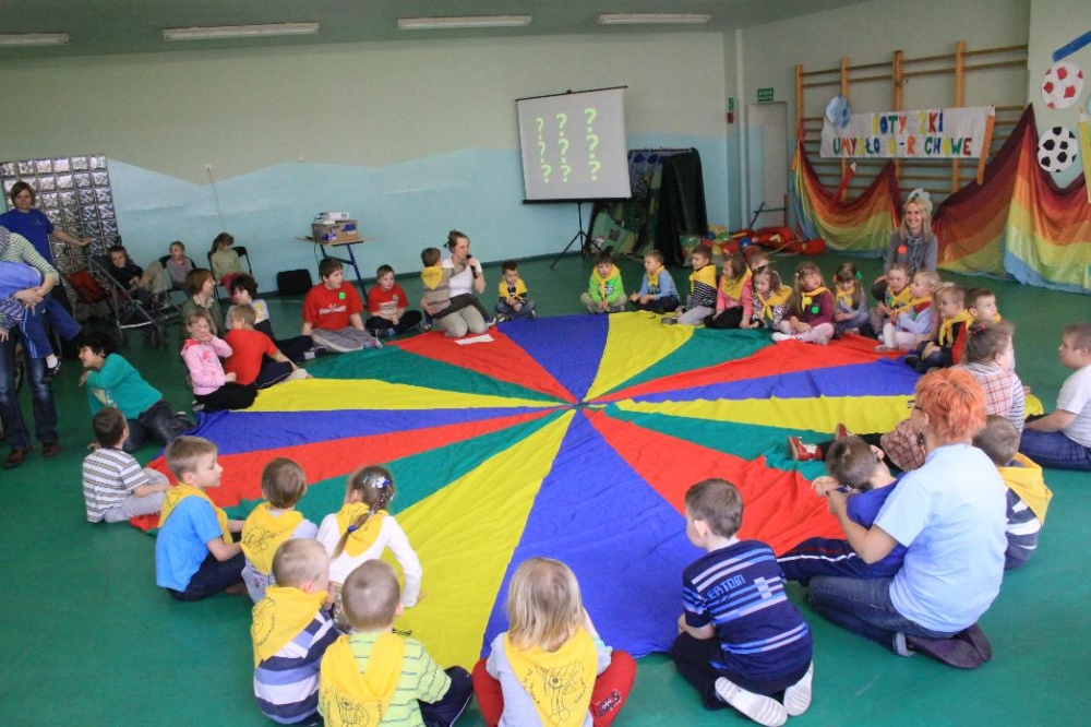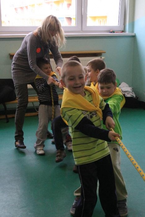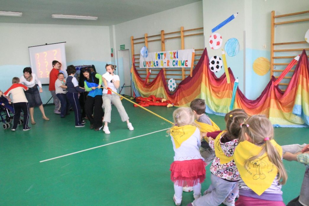 Dnia 25.04. 2012 naszą szkołę odwiedziły przedszkolaki z zaprzyjaźnionego Przedszkola nr 42 w Rybniku. Nasi najmłodsi uczniowie i wychowankowie przedszkola mieli okazję wzmagać się w potyczkach umysłowo- ruchowych. Wspólna zabawa z przedszkolakami przyniosła wiele uśmiechu na twarzach wszystkich milusińskich. Dzieci miały okazję wspólnie pokonywać trudne konkurencje przygotowane przez naszych nauczycieli wspomagając się nawzajem i w radości spędzając czas. Uczestnicy zabawy mieli za zadanie między innymi za pomocą zmysłu dotyku odnaleźć przedmioty ukryte w misach z piachem, ryżem itp., mogli przekonać się o własnej sile podczas konkurencji przeciągania liny, czy „balonowych igrzysk”. Swój spryt i zręczność sprawdzili podczas pokonywania toru przeszkód. Tak jak zwykle wszyscy uczestnicy zabawy wykazali się ogromnym zaangażowaniem i chęcią do działania, czego efektem była wspaniała kończąca spotkanie wspólna zabawa integracyjna z chustą „KLANZY” i uzyskanie dyplomów za tak wybitne umiejętności.