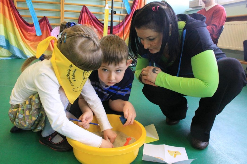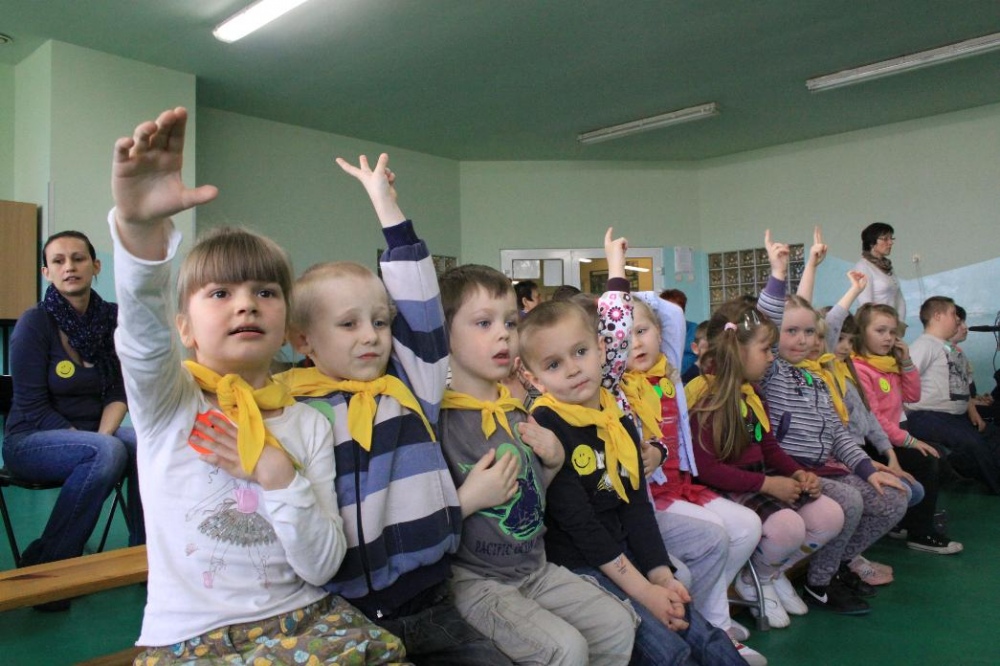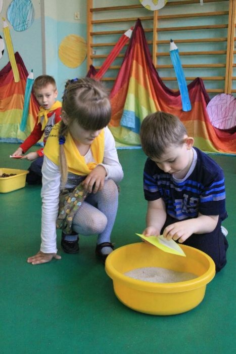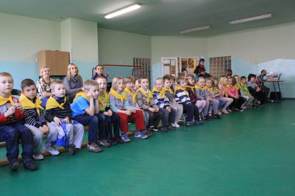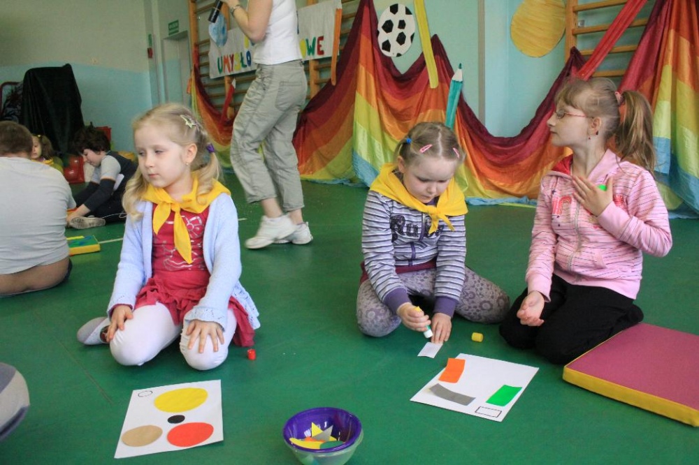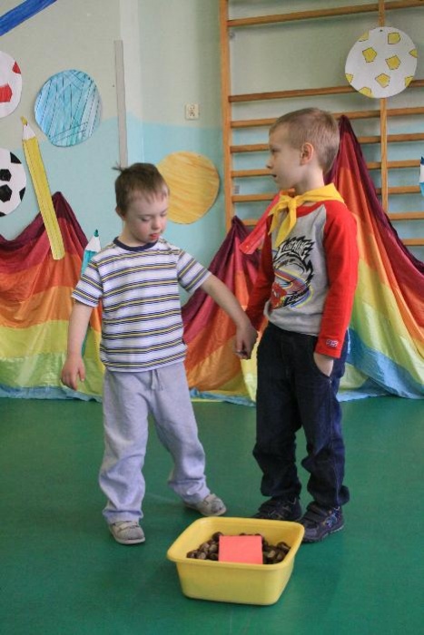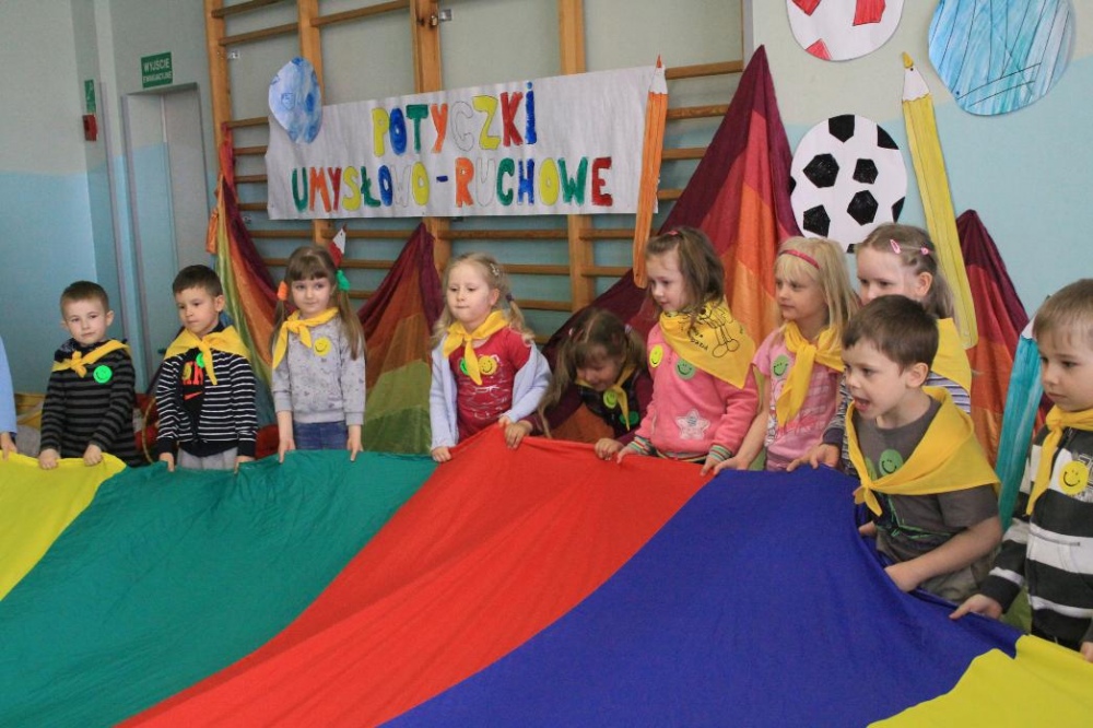 Dnia 25.04. 2012 naszą szkołę odwiedziły przedszkolaki z zaprzyjaźnionego Przedszkola nr 42 w Rybniku. Nasi najmłodsi uczniowie i wychowankowie przedszkola mieli okazję wzmagać się w potyczkach umysłowo- ruchowych. Wspólna zabawa z przedszkolakami przyniosła wiele uśmiechu na twarzach wszystkich milusińskich. Dzieci miały okazję wspólnie pokonywać trudne konkurencje przygotowane przez naszych nauczycieli wspomagając się nawzajem i w radości spędzając czas. Uczestnicy zabawy mieli za zadanie między innymi za pomocą zmysłu dotyku odnaleźć przedmioty ukryte w misach z piachem, ryżem itp., mogli przekonać się o własnej sile podczas konkurencji przeciągania liny, czy „balonowych igrzysk”. Swój spryt i zręczność sprawdzili podczas pokonywania toru przeszkód. Tak jak zwykle wszyscy uczestnicy zabawy wykazali się ogromnym zaangażowaniem i chęcią do działania, czego efektem była wspaniała kończąca spotkanie wspólna zabawa integracyjna z chustą „KLANZY” i uzyskanie dyplomów za tak wybitne umiejętności.