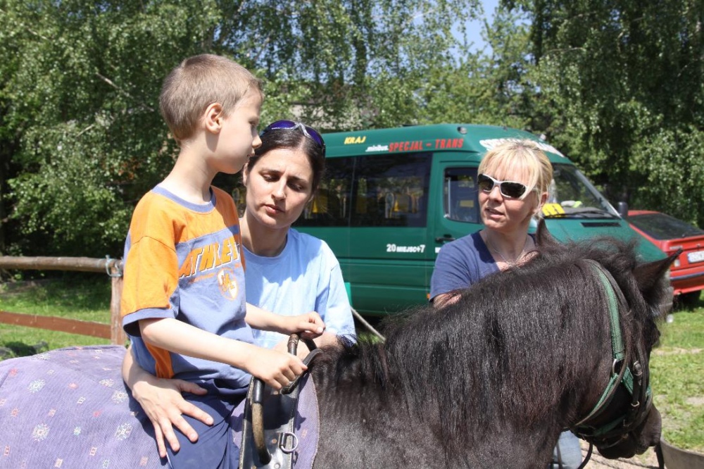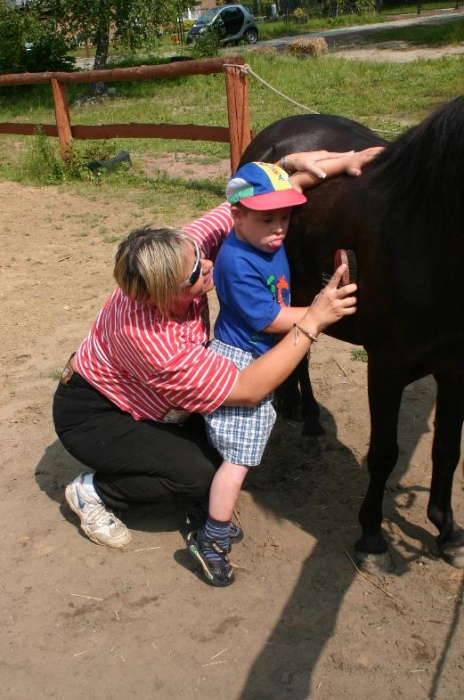 Zapraszamy do nowo powstałej galerii zdjęciowej z przebiegu zajęć hipoteraputycznych. W galerii zebraliśmy zdjęcia z kilku ostatnich lat pracy terapeutycznej. Z tej formy terapii w naszej placówce korzystają przedszkolaki oraz uczniowie najmłodszych klas szkoły podstawowej. Zajęcia hipoterapii są zajęciami wyjazdowymi (odbywają się w ośrodku hipoterapeutycznym). Prowadzone są przez magistrów fizjoterapii / instruktorów hipoterpii / oligofrenopedagogów (pracowników naszej szkoły). Mają formę indywidualną, ale na zajęcia wyjeżdża, dwa razy w tygodniu, grupa dzieci. Podczas, gdy jedne dzieci biorą udział w zajęciach na koniu, inne pod opieką nauczycieli realizują program edukacyjno-wychowawczy korzystając z okazji przebywania w środowisku naturalnym. Często odwiedzają ośrodek również nasi starsi uczniowe, którzy mogą w rewelacyjny sposób realizować tam swoje programy edukacyjne związane np. z pracami w ogrodzie, tematyką dotyczącą wsi, zwierząt , czy zmianą pór roku.