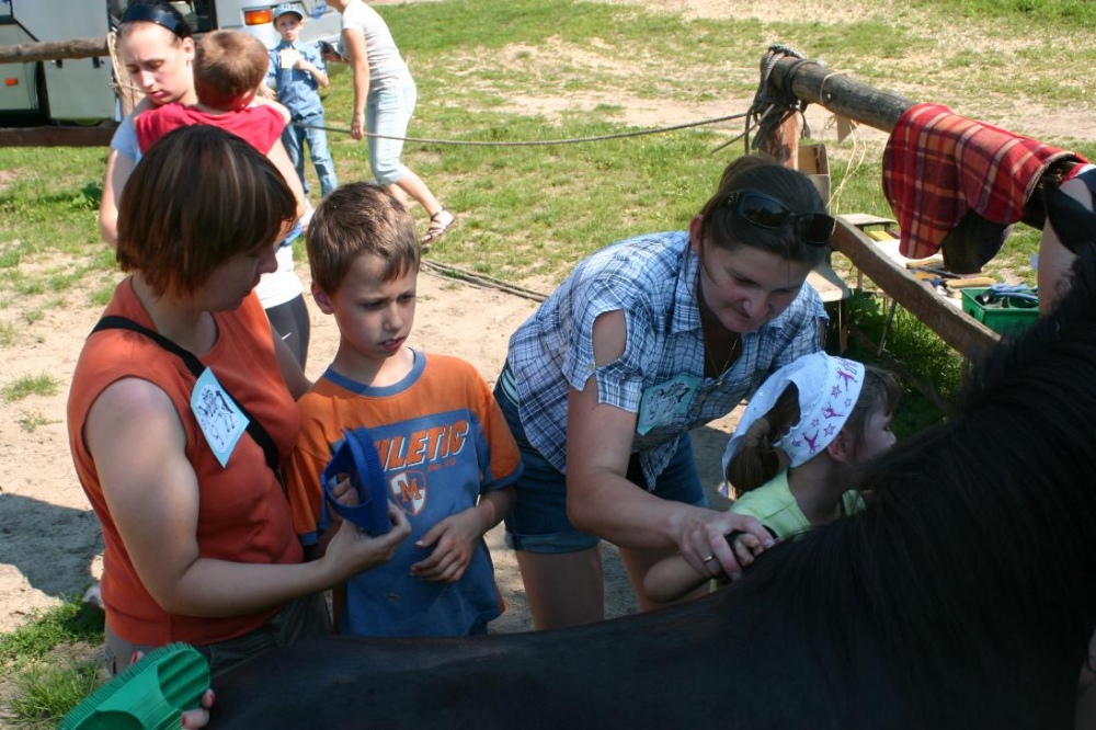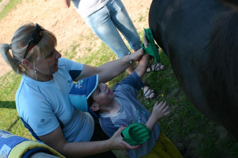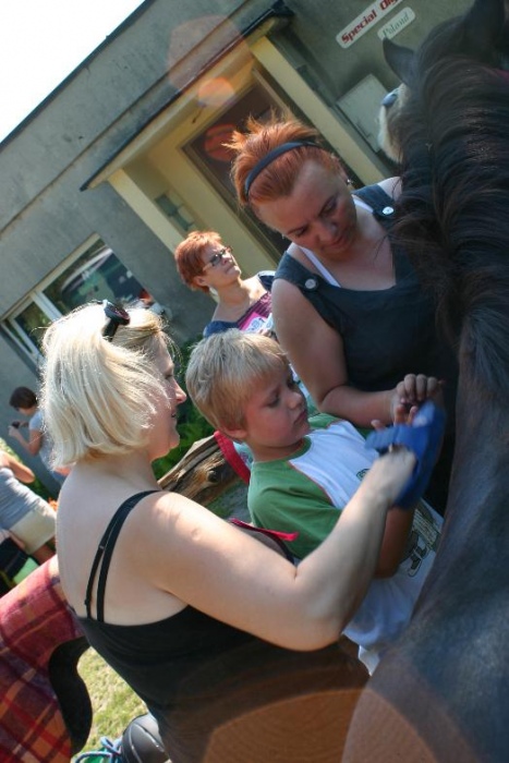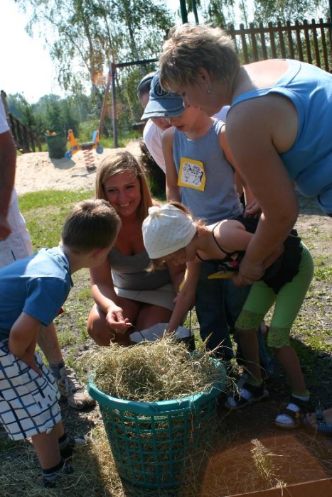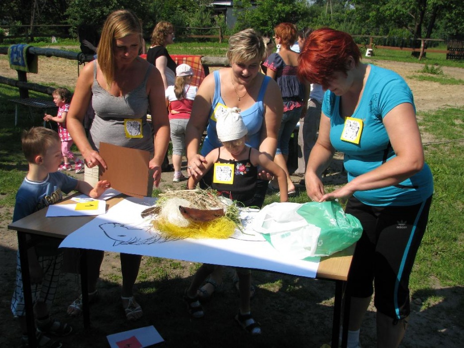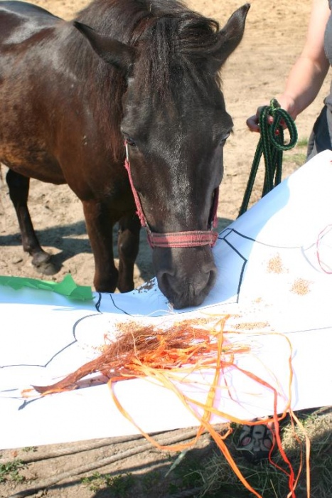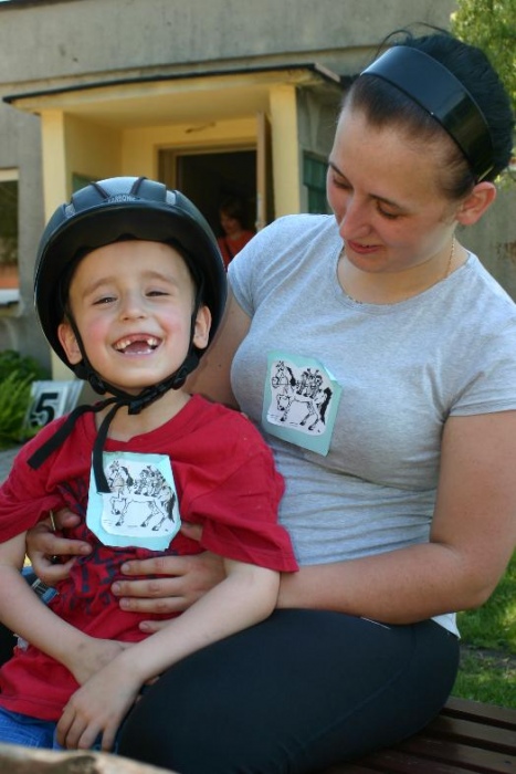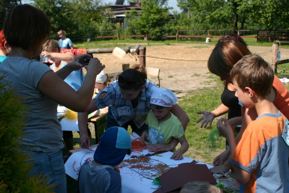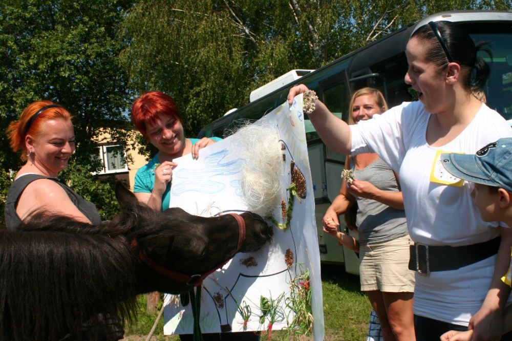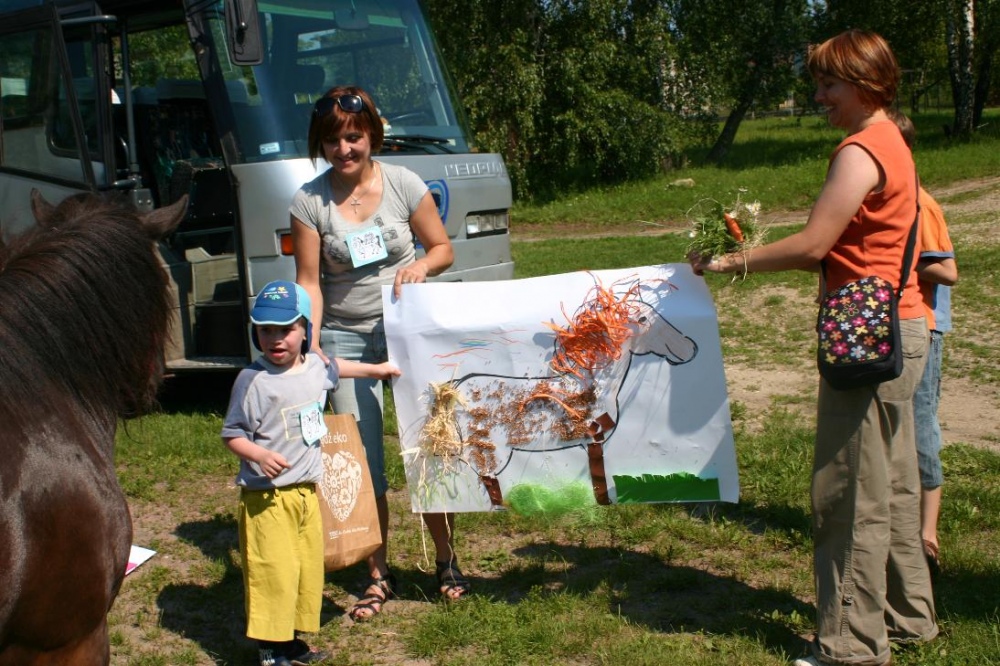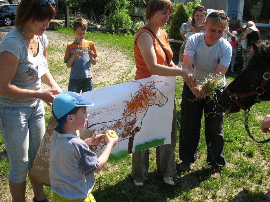 W miniony poniedziałek (18 czerwca) w ramach podsumowania udziału w zajęciach hipoterapii przedszkolaki, wraz ze swoimi rodzicami/opiekunami, wzięły udział we wspólnej zabawie i grillu na terenie ośrodka. Do zabawy przyłączyła sie również jedna z klas I SP. Hipoterapuci przygotowali mini "Podchody Końskie". Dzieci, ich rodzice, a także wychowawcy, zostali podzieleni na grupy, dostali instrukcje jak odszukać kolejne wskazówki i zadania do wykonania. Wśród nich było wyklejenie portretu konia, czyszenie zwierzęcia z doborem odpowiednich przyrządów, odszukanie w sianku końskich przysmaków oraz przygotowanie prezentu dla konika. Wszystkie drużyny świetnie poradziły sobie z zadaniami, a końskie portrety zostały ocenione przez Adasia jako "bardzo smaczne":).