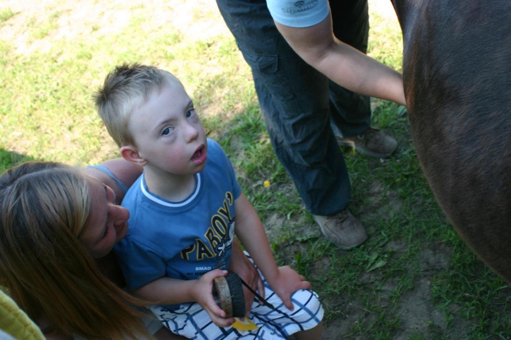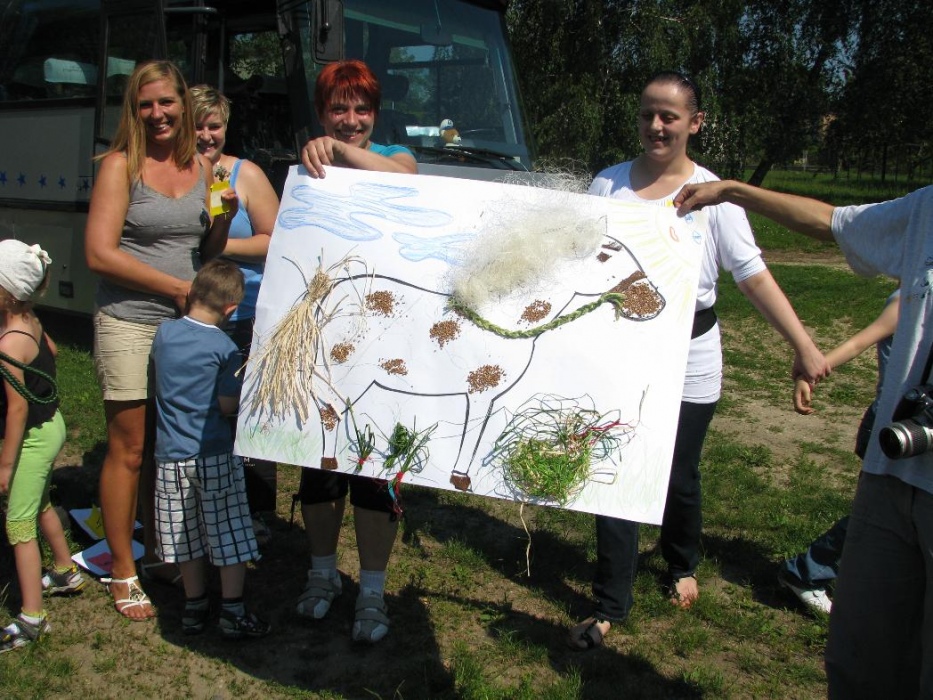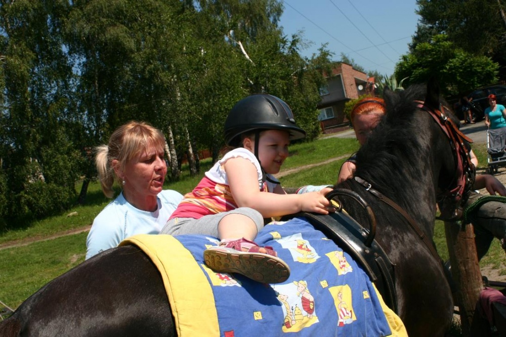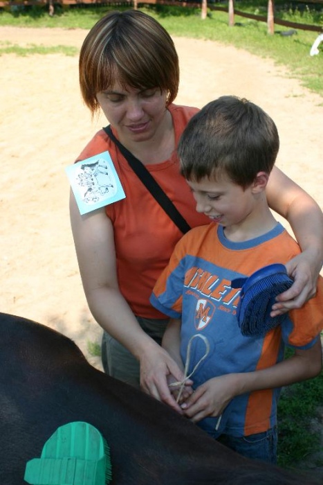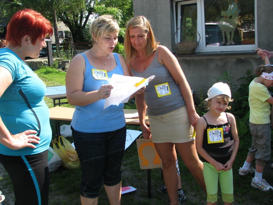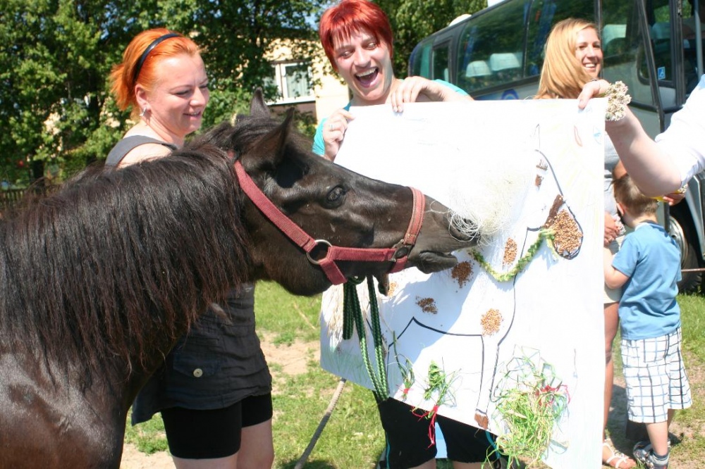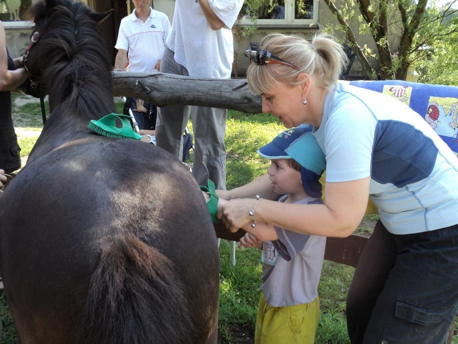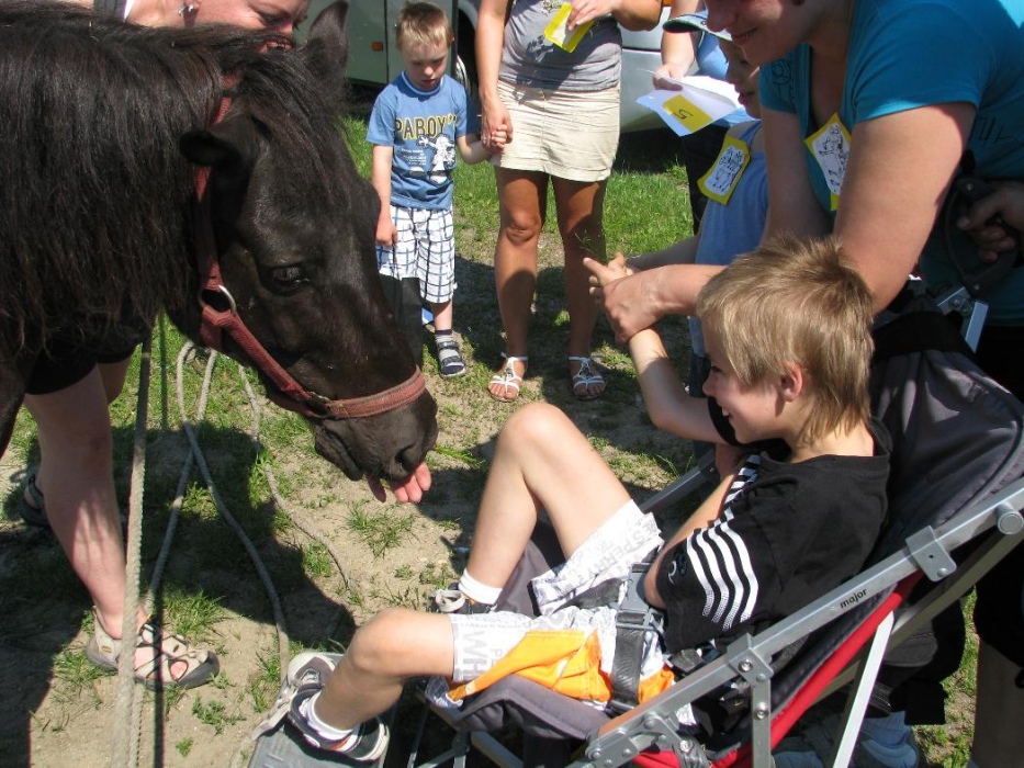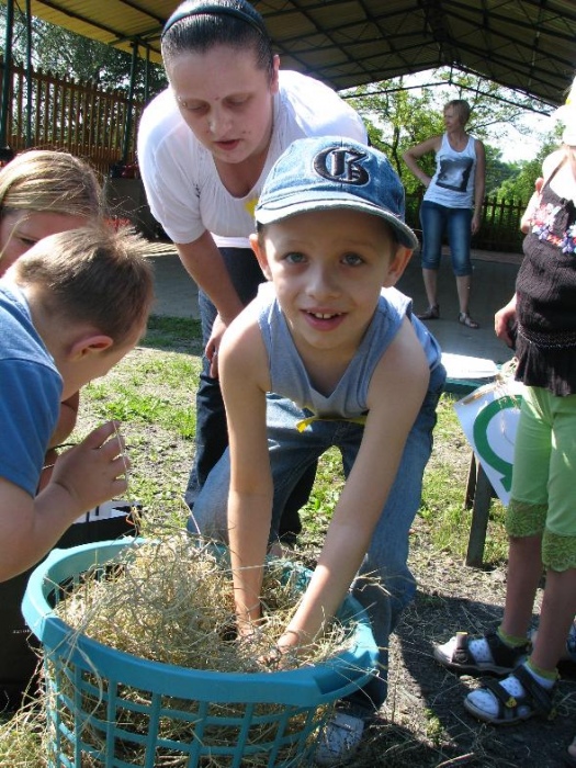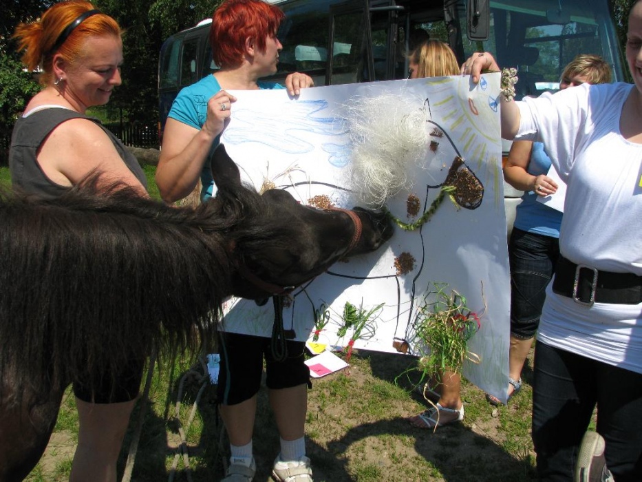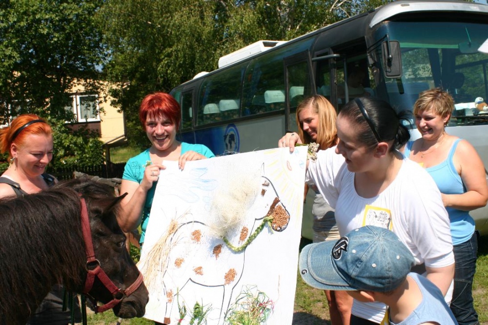 W miniony poniedziałek (18 czerwca) w ramach podsumowania udziału w zajęciach hipoterapii przedszkolaki, wraz ze swoimi rodzicami/opiekunami, wzięły udział we wspólnej zabawie i grillu na terenie ośrodka. Do zabawy przyłączyła sie również jedna z klas I SP. Hipoterapuci przygotowali mini "Podchody Końskie". Dzieci, ich rodzice, a także wychowawcy, zostali podzieleni na grupy, dostali instrukcje jak odszukać kolejne wskazówki i zadania do wykonania. Wśród nich było wyklejenie portretu konia, czyszenie zwierzęcia z doborem odpowiednich przyrządów, odszukanie w sianku końskich przysmaków oraz przygotowanie prezentu dla konika. Wszystkie drużyny świetnie poradziły sobie z zadaniami, a końskie portrety zostały ocenione przez Adasia jako "bardzo smaczne":).