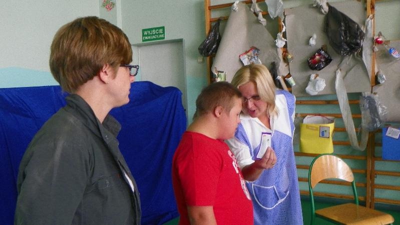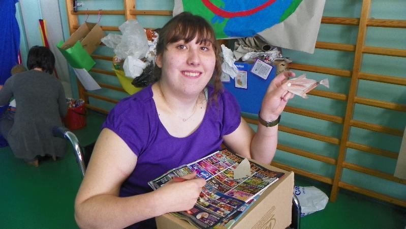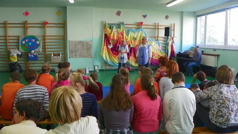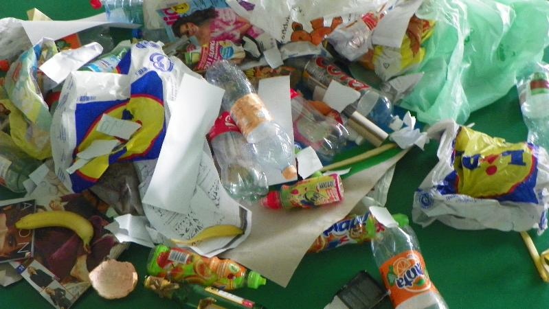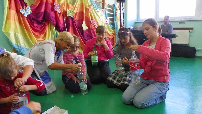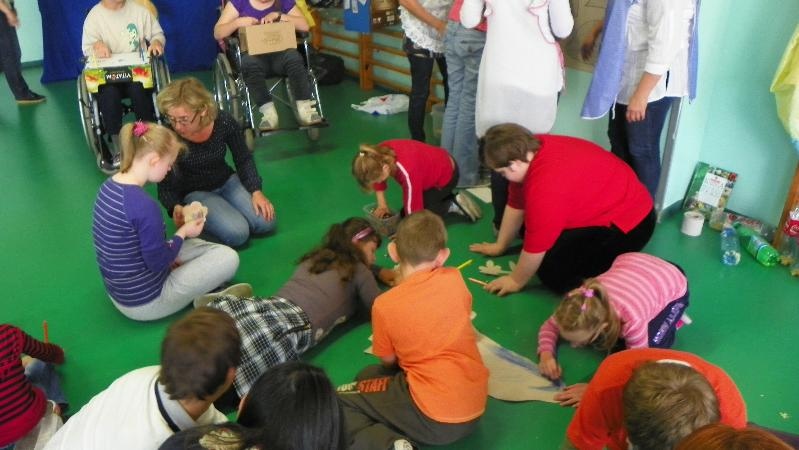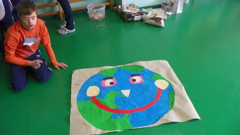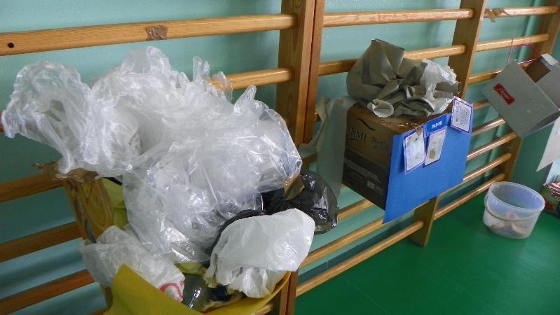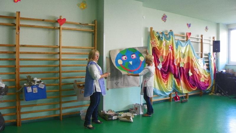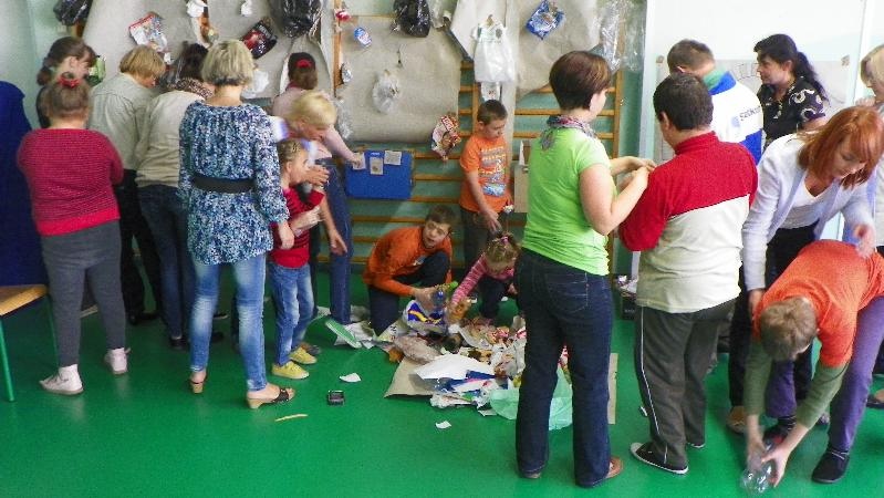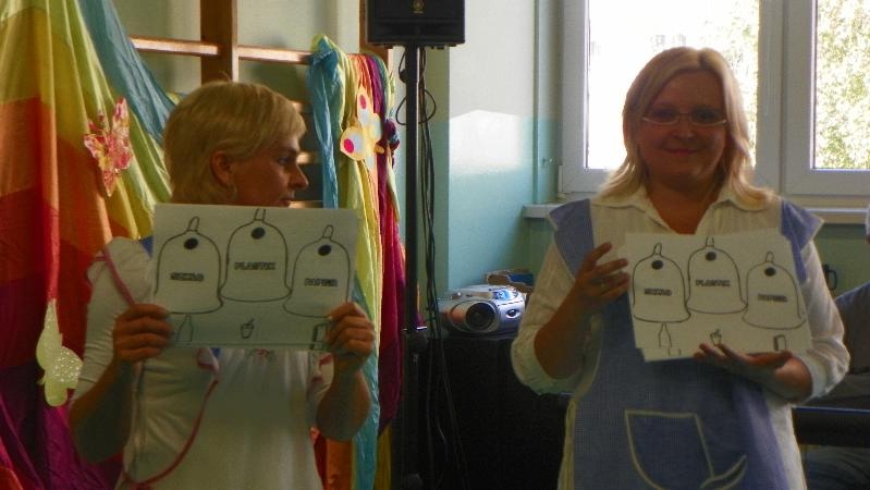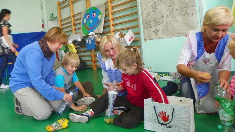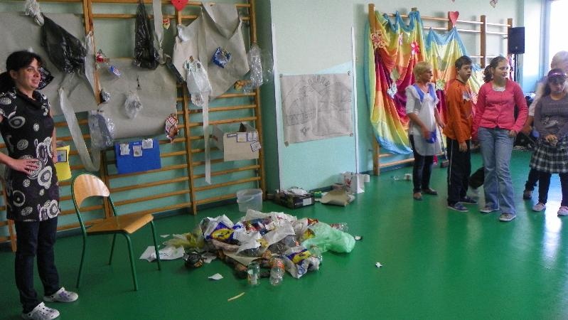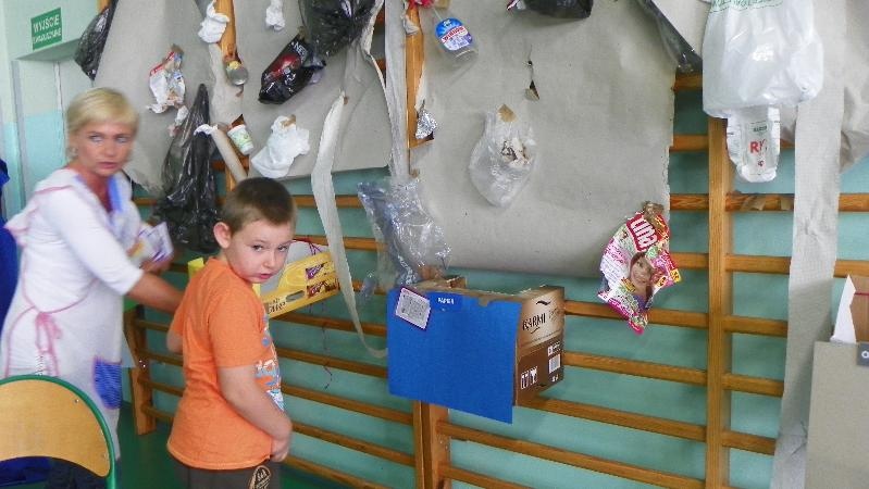 21 września w naszej szkole przeprowadziliśmy akcję „sprzątanie świata”. Poprzez zabawę uświadamialiśmy naszym uczniom potrzebę segregacji śmieci. Dzieci uczyły się segregować śmieci, wrzucając je do kartonów oznaczonych odpowiednimi kolorami. Na konkretnych przykładach pokazaliśmy uczniom, co można zrobić z plastiku, szkła i papieru. Wykorzystano śmieci do zabawy - wrzucanie do plastykowych butelek ryżu, kaszy, grochu, makaronu i potrząsanie nimi, robienie kulek z papieru i celowania do koszów. Pokazano uczniom ilustrację przedstawiającą szary zanieczyszczony świat. Poprzez zamalowywanie i przyklejanie na ilustrację elementów, dzieci ubarwiły świat.