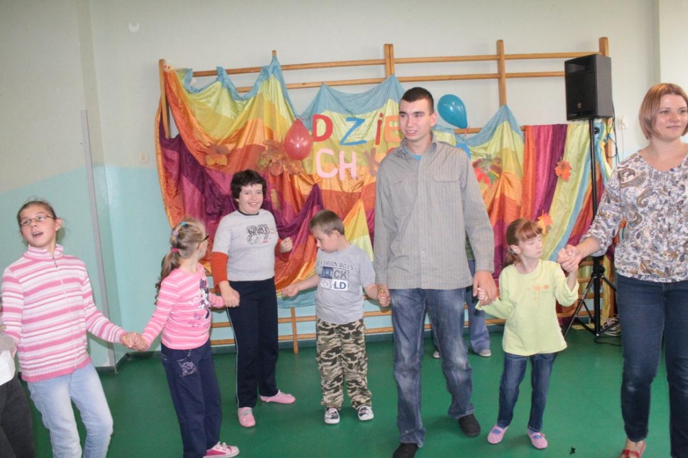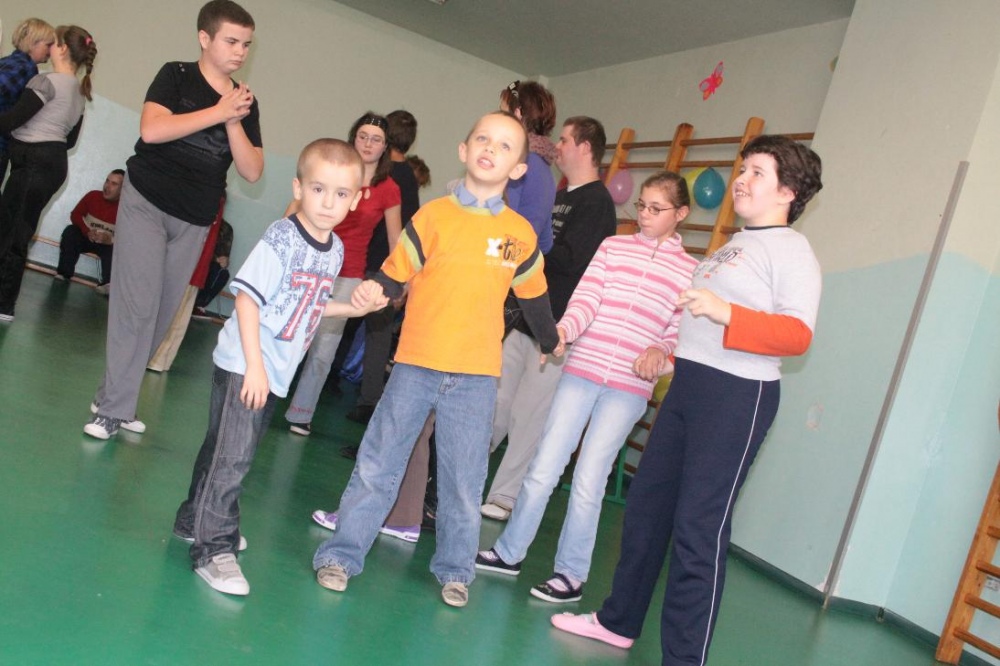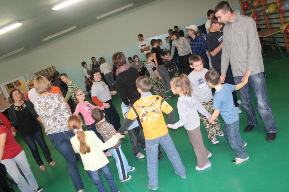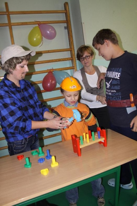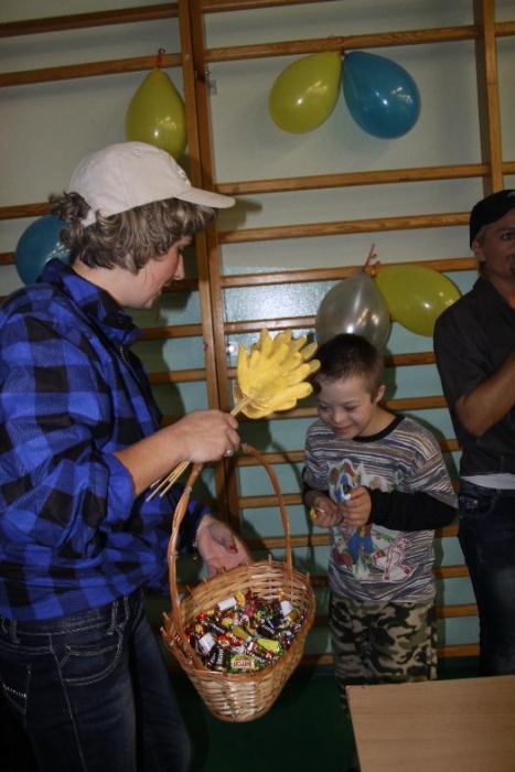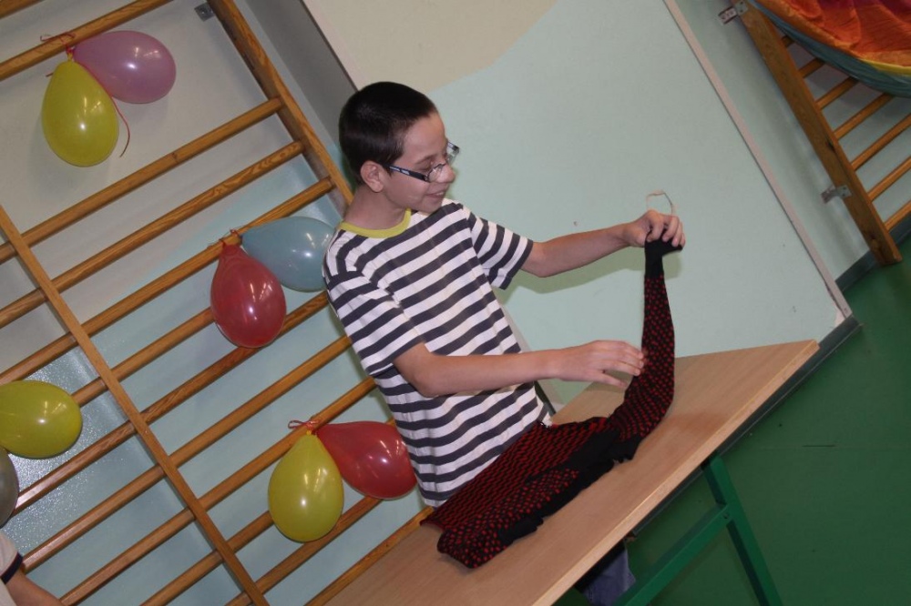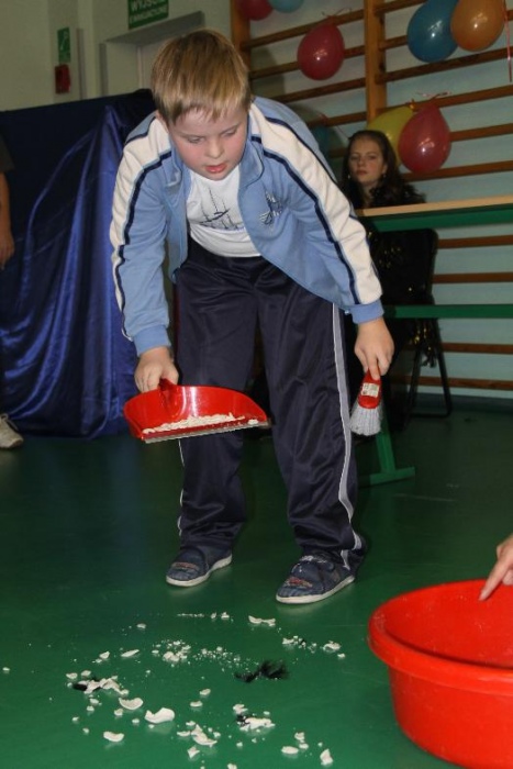 Świetnie radzili sobie w pracach porządkowych (układanie ubrań ,zamiatanie śmieci). Chłopcy biorący udział w zabawach otrzymali „złotą rączkę”, jako symbol ich zaradności. Impreza zakończyła się dyskoteką połączoną ze słodkim poczęstunkiem.