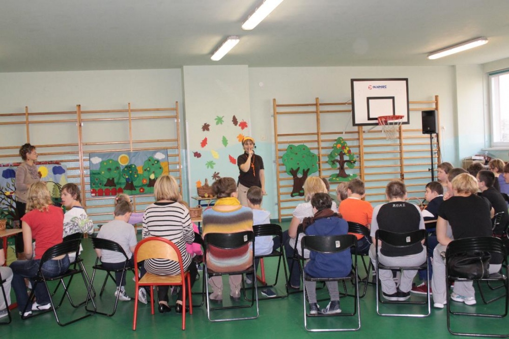 Owoce, warzywa, liście, kasztany, żołędzie, grzyby - słowem „dary jesieni” – królowały w klasach szkolnych przez cały wrzesień i październik. W listopadzie przyszła pora na podsumowanie wiadomości o jesieni. Rolę tę tradycyjnie spełnia konkurs edukacyjny „Cztery pory roku - jesień”. Tegoroczna edycja dla uczniów szkoły podstawowej odbyła się w czwartek 8 listopada. Z okazji konkursu na sali gimnastycznej wyrósł sad z owocami oraz lasek z grzybami.