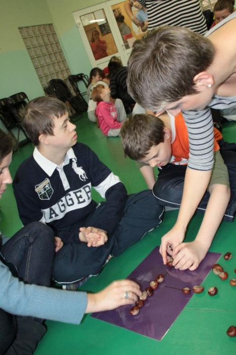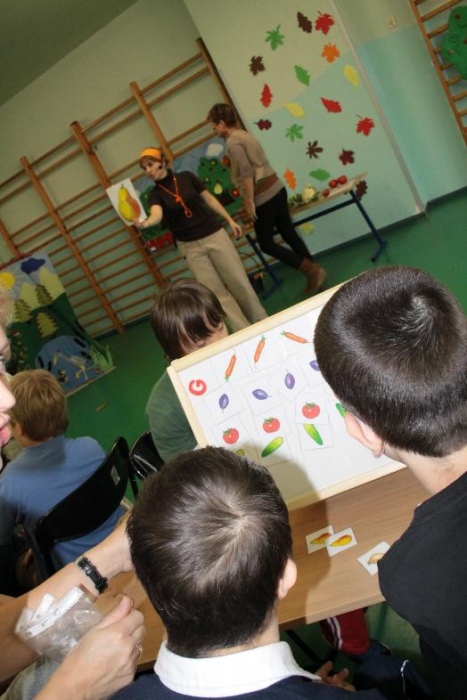 Cztery drużyny zmagały się z indywidualnymi i zespołowymi konkurencjami. Były :jesienne puzzle, zbieranie owoców w sadzie, owocowa sztafeta, koszyk z warzywami, loteryjka owocowo-warzywna, zabawy z kasztanami, grzybobranie , a na koniec układanie parasoli z kolorowych „guzików”.