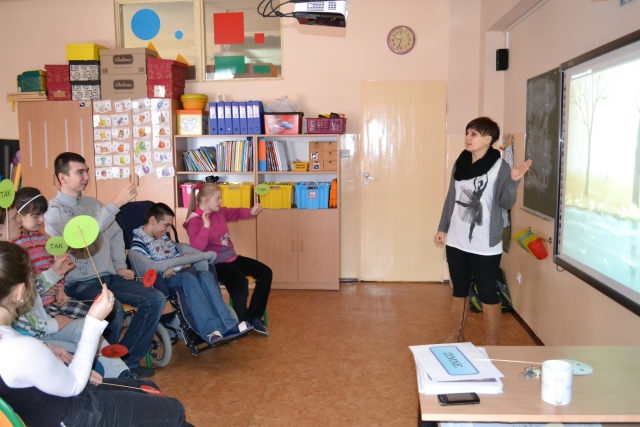 W minionym okresie w takcie pracy z wykorzystaniem Terapeutycznej Sali Multimedialnej kładliśmy nacisk na rozwijanie i utrwalanie zdobytych już umiejętności oraz wiedzy. Dzięki wykorzystaniu zakupionych w ramach współpracy programom „Wspomaganie rozwoju. Z Tosią przez pory roku” „ Tosia i przyjaciele”, „Zabawy słowem” czy „ Obrazkowy słownik tematyczny” utrwalaliśmy wiedzę dotyczącą zmieniającej się pory roku, zilustrowaliśmy tradycje świąteczne, a także rozwijaliśmy umiejętność liczenia, znajomości kolorów i figur geometrycznych. Dzięki zastosowaniu pomocy multimedialnych uczniowie w przyjazny sposób utrwalili wzorce wykształcone w procesie terapii logopedycznej oraz komunikacji alternatywnej, podnosząc tym samym ich efektywność.