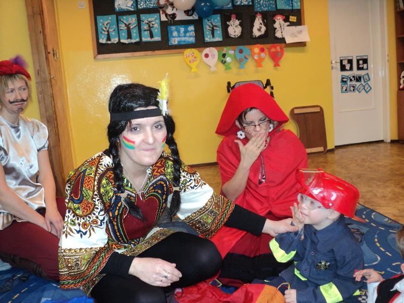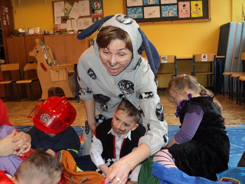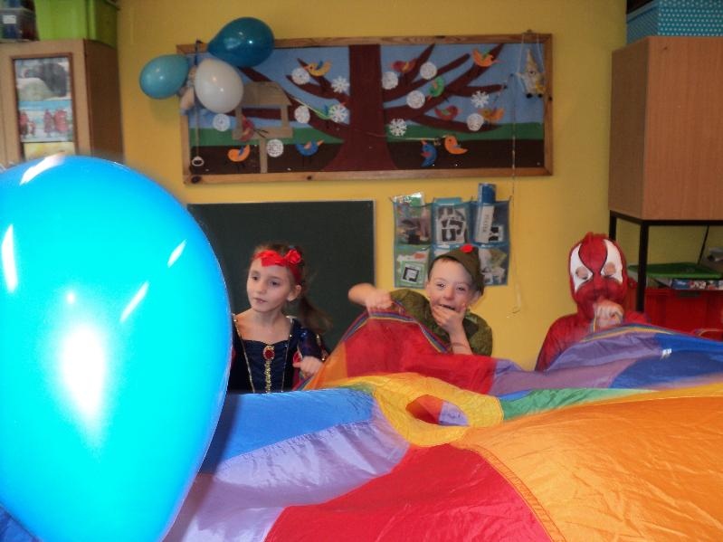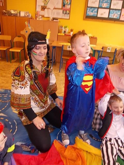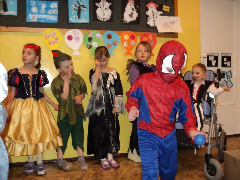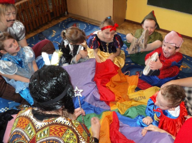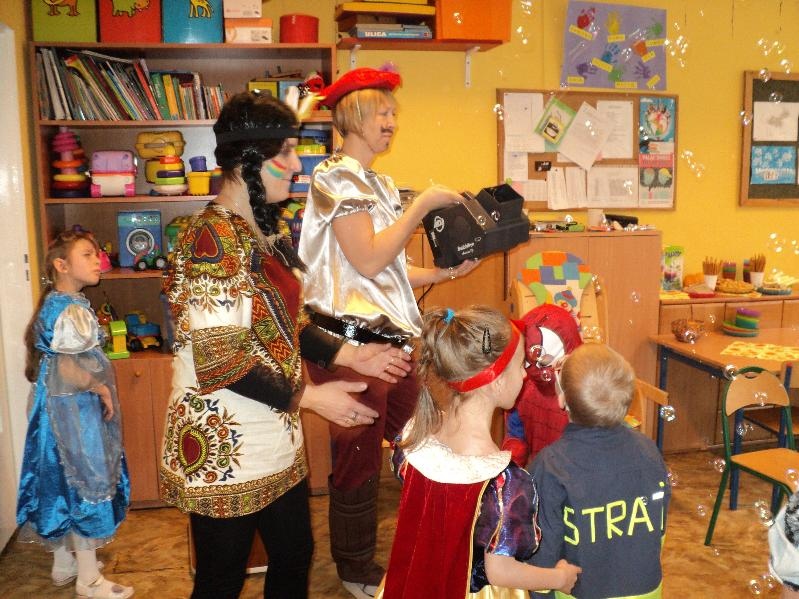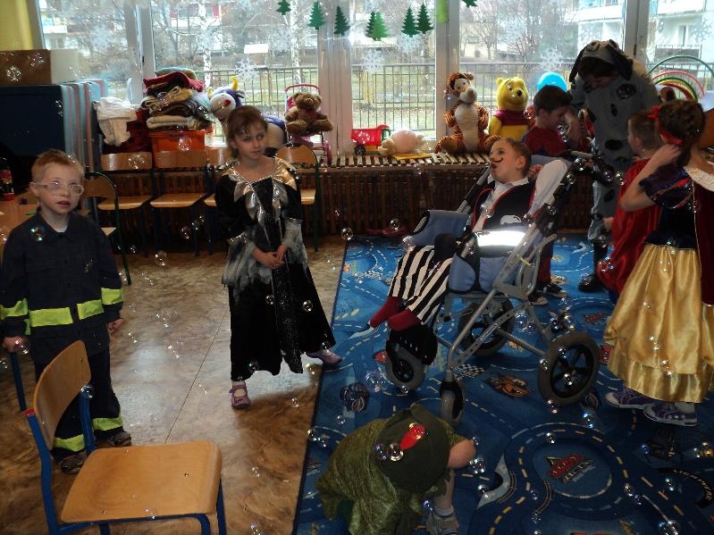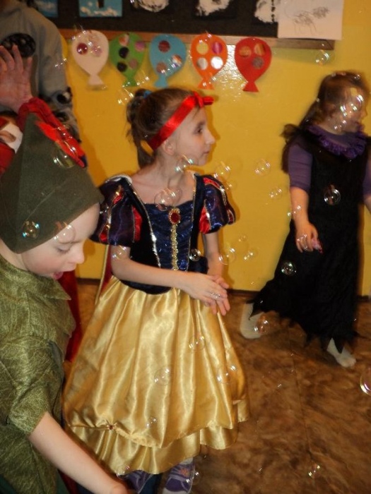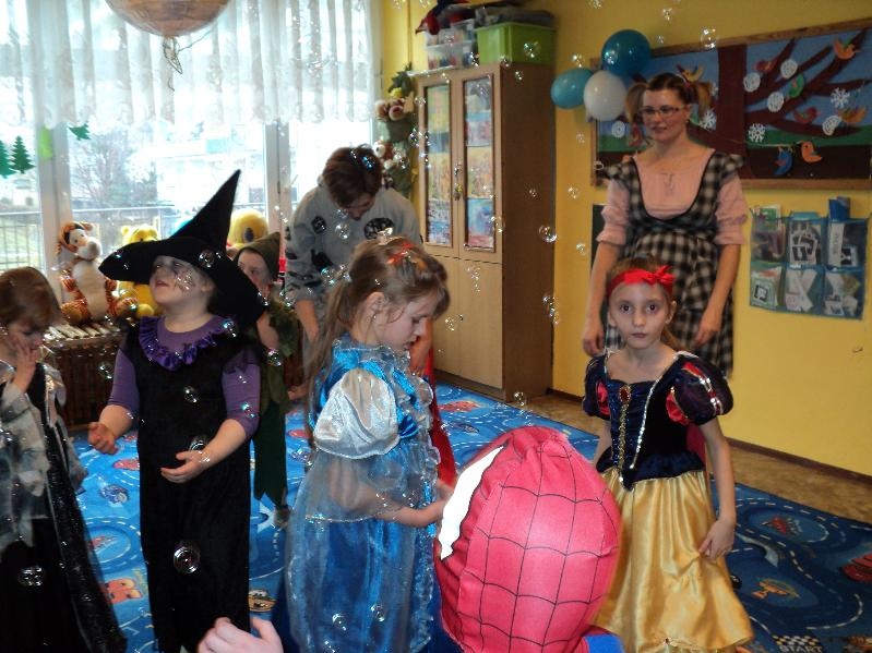 W piątek 1 lutego odbyła się zabawa karnawałowa w naszym przedszkolu. Dzieci zawitały do przedszkola w bajkowych przebraniach. Panie również przebrały się na tę okazję. W czarodziejskim świecie bajek można było spotkać „superbohaterów”, czarodziejki, królewny, Piotrusia Pana, Strażaka Sama, Pirata, ale także Indiankę Pocahontas, Czerwonego Kapturka, Pipi, Kota w Butach i Pieska Reksia. Bal przebiegał pod znakiem zabaw ruchowych. Na początku było przywitanie i prezentowanie swoich postaci. Dalej zabawy z chustą i balonikiem. I wreszcie znane i lubiane przez dzieci zabawy ruchowe. Zabawę uatrakcyjniło całe mnóstwo baniek mydlanych. Był poczęstunek, a także profesjonalna sesja zdjęciowa, którą wykonała P. Bożena Burda