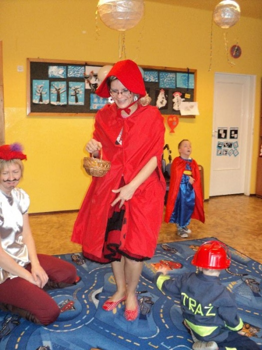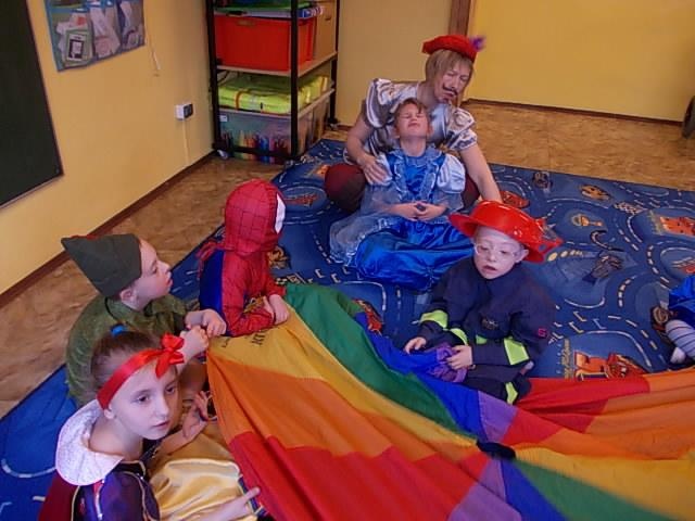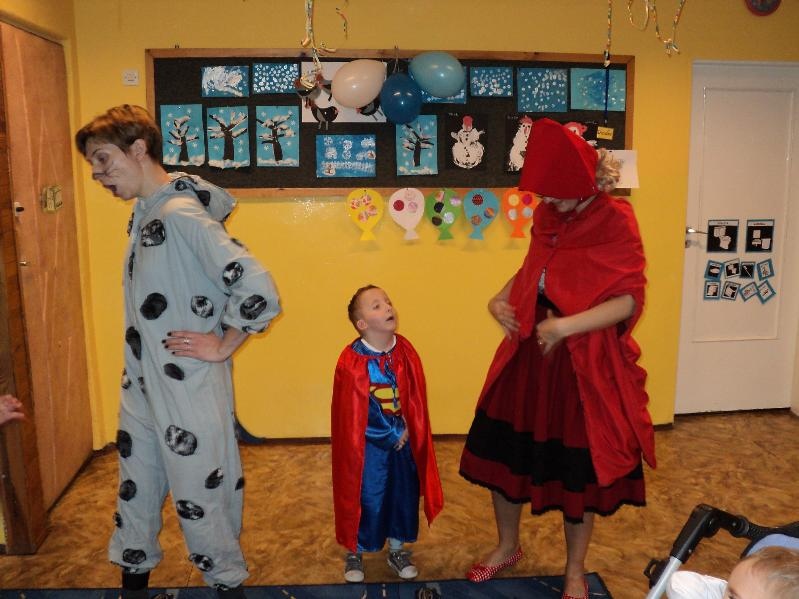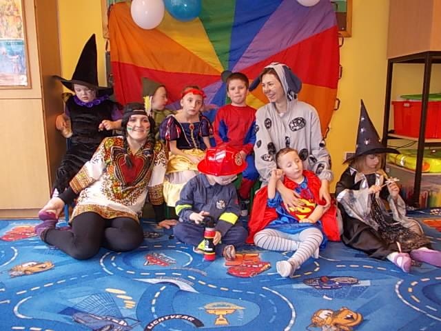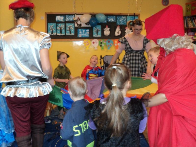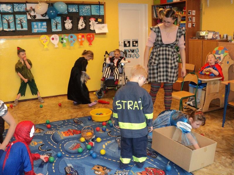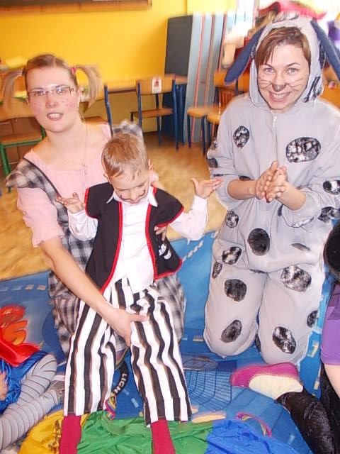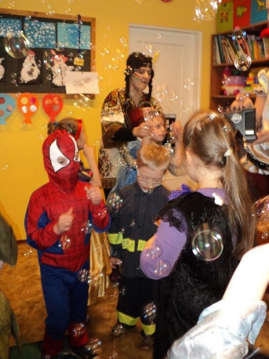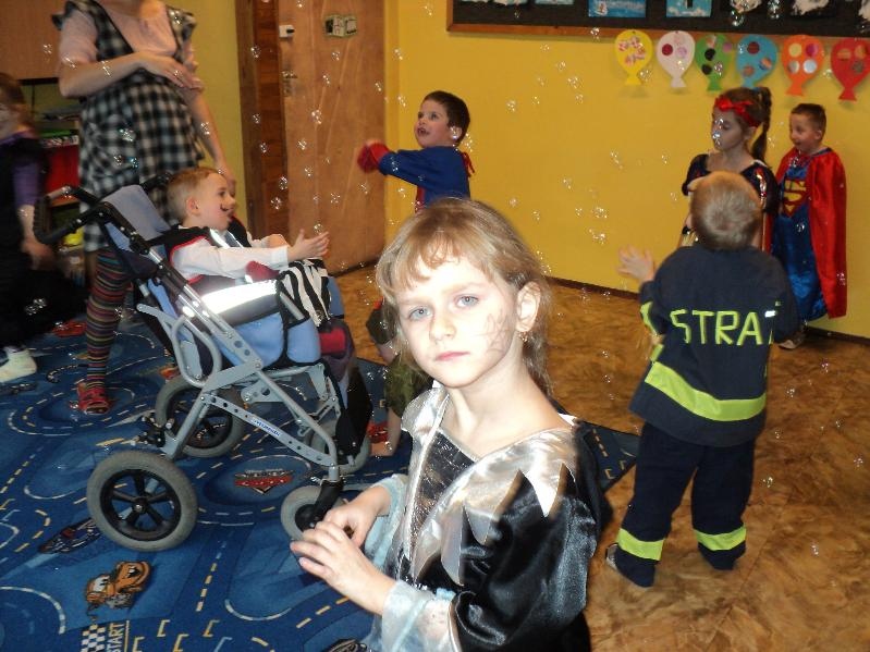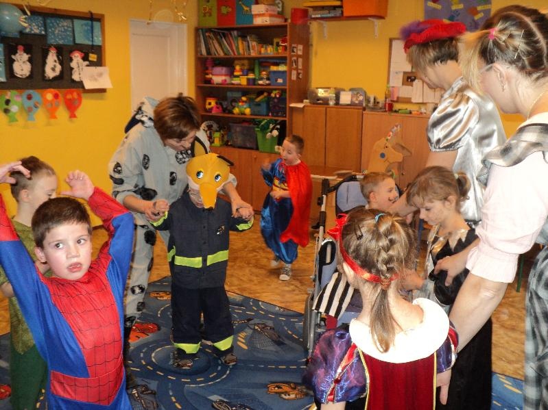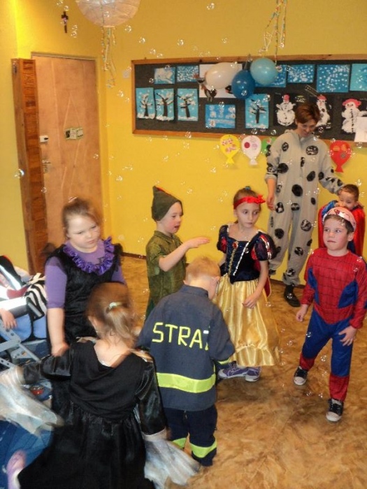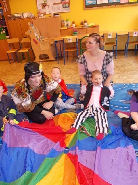 W piątek 1 lutego odbyła się zabawa karnawałowa w naszym przedszkolu. Dzieci zawitały do przedszkola w bajkowych przebraniach. Panie również przebrały się na tę okazję. W czarodziejskim świecie bajek można było spotkać „superbohaterów”, czarodziejki, królewny, Piotrusia Pana, Strażaka Sama, Pirata, ale także Indiankę Pocahontas, Czerwonego Kapturka, Pipi, Kota w Butach i Pieska Reksia. Bal przebiegał pod znakiem zabaw ruchowych. Na początku było przywitanie i prezentowanie swoich postaci. Dalej zabawy z chustą i balonikiem. I wreszcie znane i lubiane przez dzieci zabawy ruchowe. Zabawę uatrakcyjniło całe mnóstwo baniek mydlanych. Był poczęstunek, a także profesjonalna sesja zdjęciowa, którą wykonała P. Bożena Burda