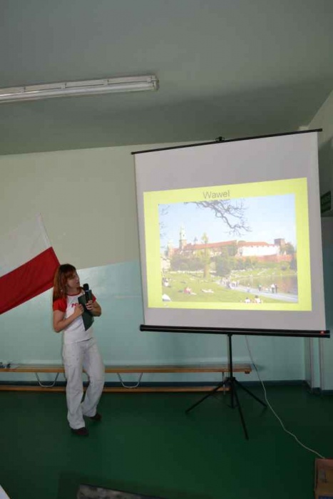 W czwartek 9.maja odbyła się kolejna lekcja z zakresu edukacji patriotycznej pt."Z wizytą w Krakowie". Uczniowie gimnazjum poznali najciekawsze miejsca Krakowa, zobaczyli jak wygląda zamek na Wawelu, poznali legendę o smoku wawelskim, odwiedzili krakowski rynek i słuchali hejnału z wieży Kościoła Mariackiego. Samodzielnie wykonali też średniowiecznego rycerza. Poszerzając swoją wiedzę o dawnej stolicy Polski uczniowie mieli okazję także wykazać się różnego rodzaju umiejętnościami wykonując kolejne zadania. Jak się okazało wszyscy świetnie rozpoznają konturową mapę Polski, wiedzą jakie są nasze barwy narodowe i jak wygląda polskie godło, znają też naszą stolicę Warszawę i wiedzą, że leży ona tak jak Kraków nad największą polską rzeką- Wisłą. Remisem zakończyła się papierowa bitwa białych i czerwonych. Na zakończenie wspólnie odśpiewaliśmy Hymn Polski "Mazurek Dąbrowskiego". Lekcję przygotowały i poprowadziły Panie: Martyna Płonowska- Troszka, Ilona Kobus oraz Sabina Dudek.