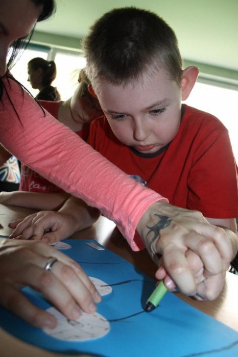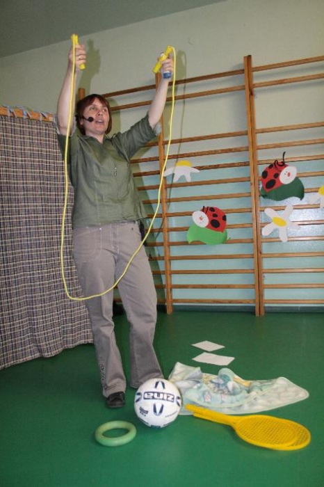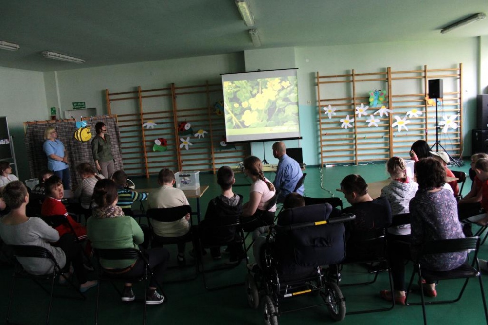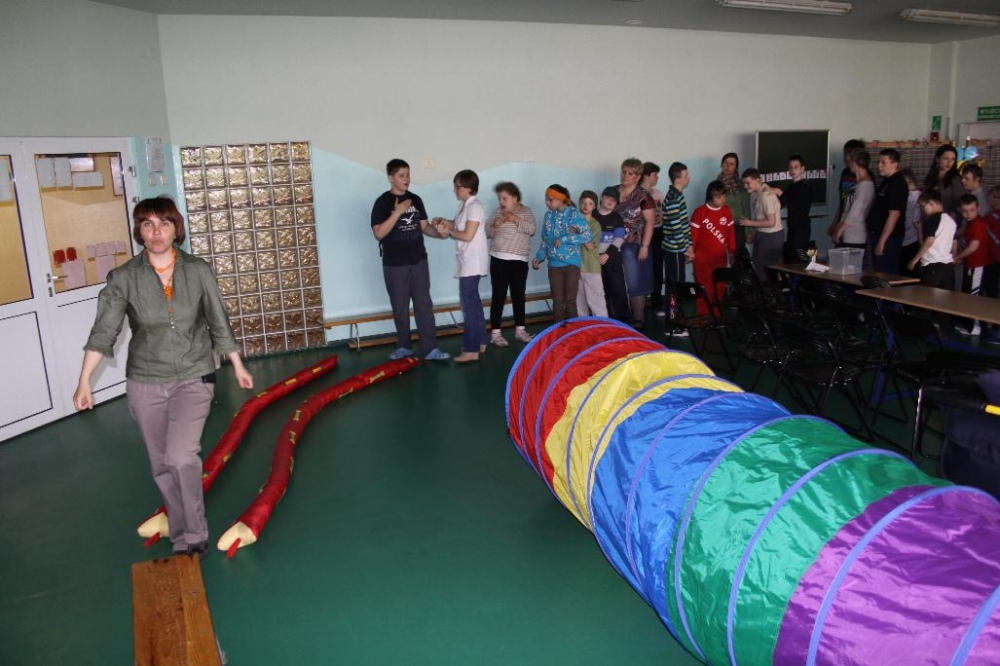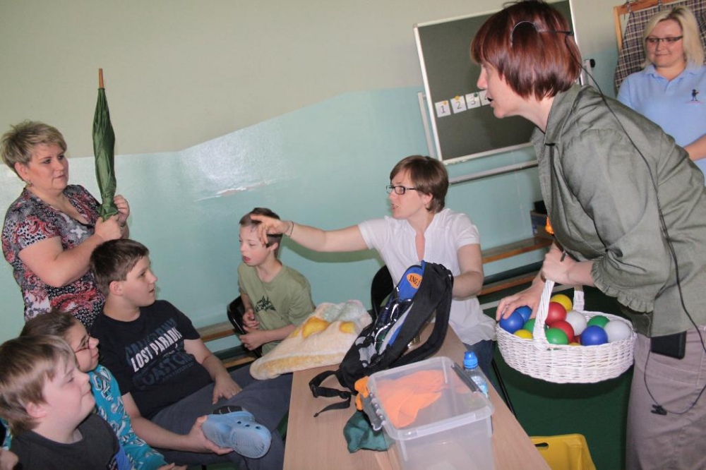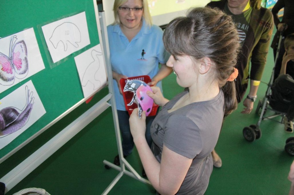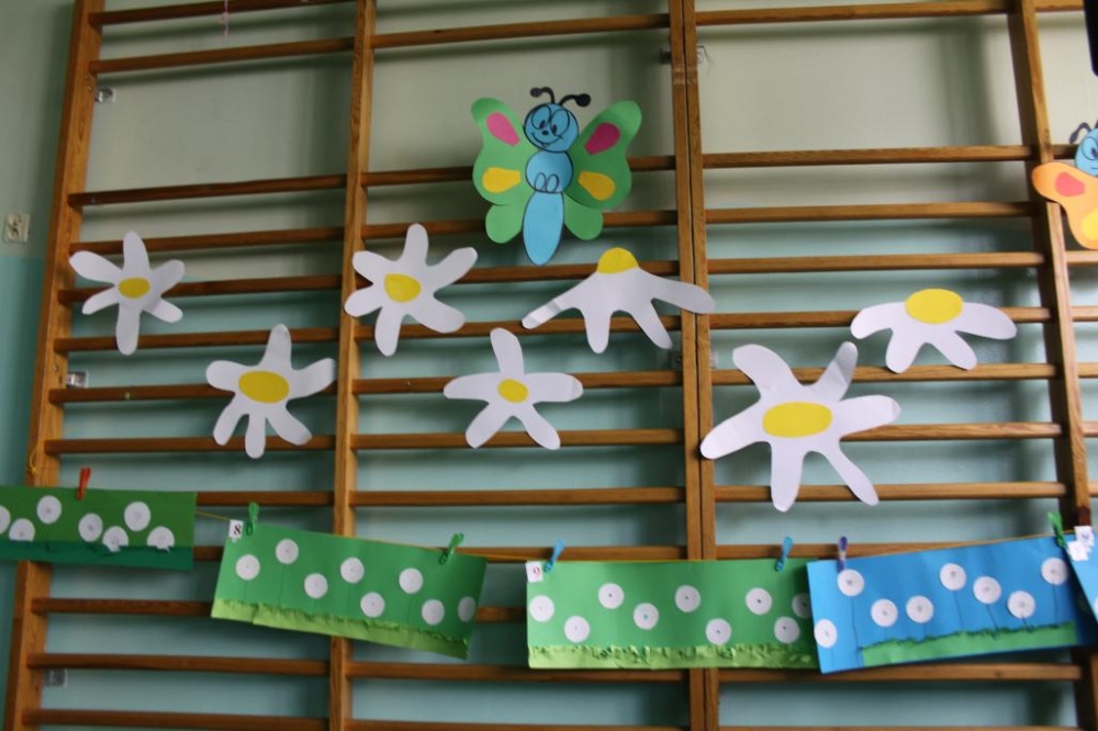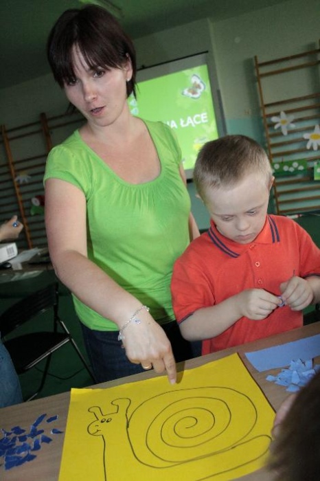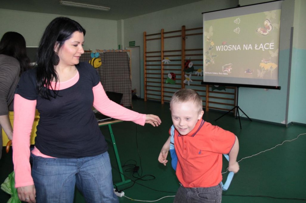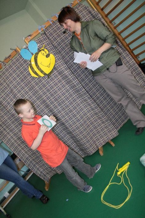 Spakowaliśmy więc plecak i w drogę. Po przejściu przez mostek, tunel i ścieżkę z kamieni dotarliśmy do celu. Była nim piękna, majowa łąka. Na łące można było podziwiać kwiaty i zwierzęta, a przy okazji wykazać się umiejętnościami: liczenia, dopasowywania kształtu do konturu, dobierania obrazka do filmu, cięcia i darcia papieru oraz rysowania.