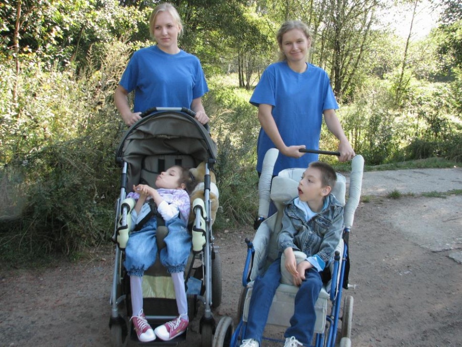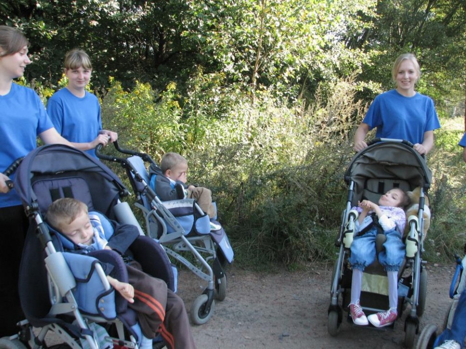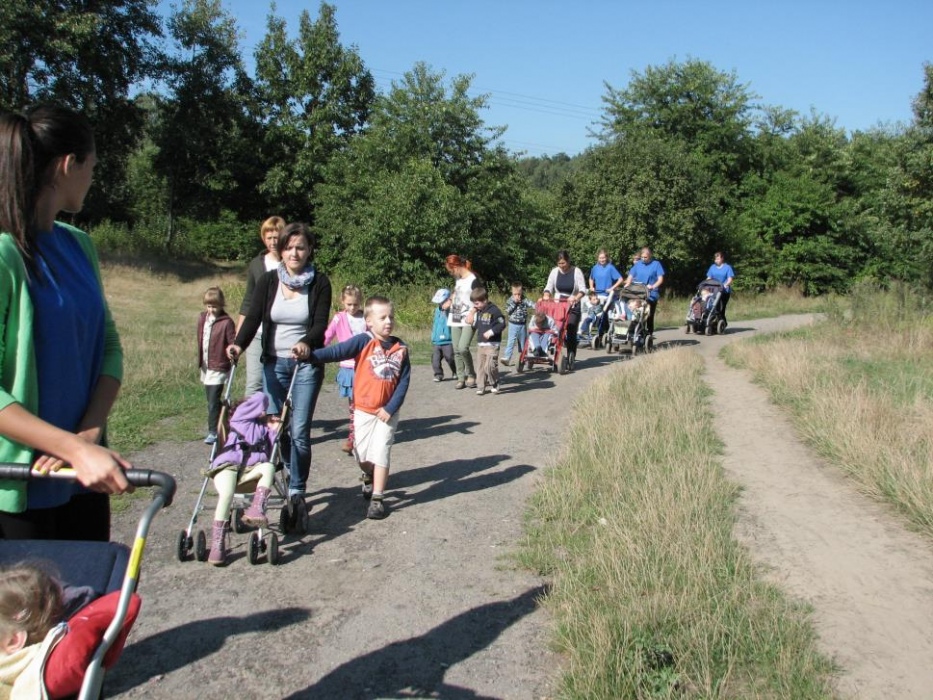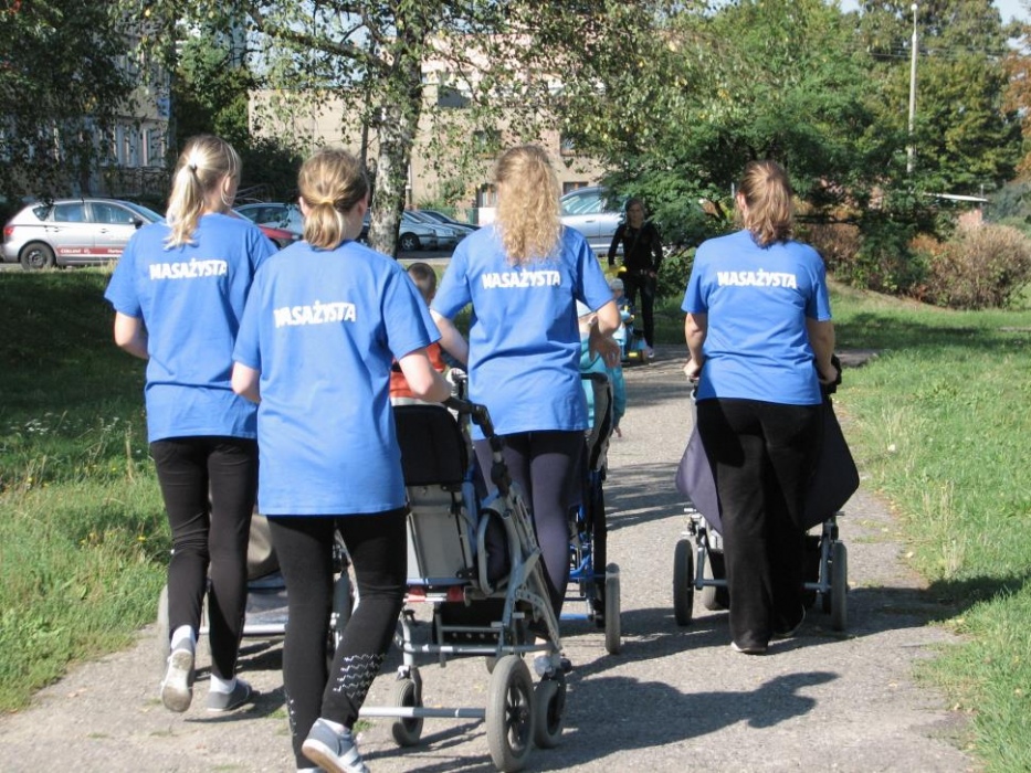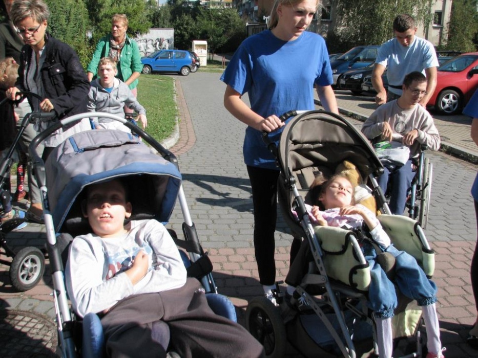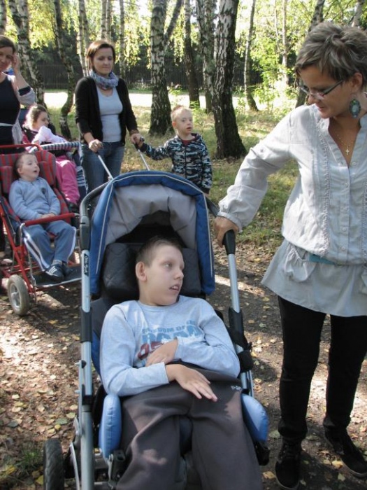 Dzieci radośnie maszerowały do lasu, gdzie widać już było nadchodzącą jesień. Natomiast dzieci z oddziałów RW dotarły do tam przy pomocy masażystów z Centrum Kształcenia Zawodowego i Ustawicznego Województwa Śląskiego w..Rybniku, za co im bardzo dziękujemy!