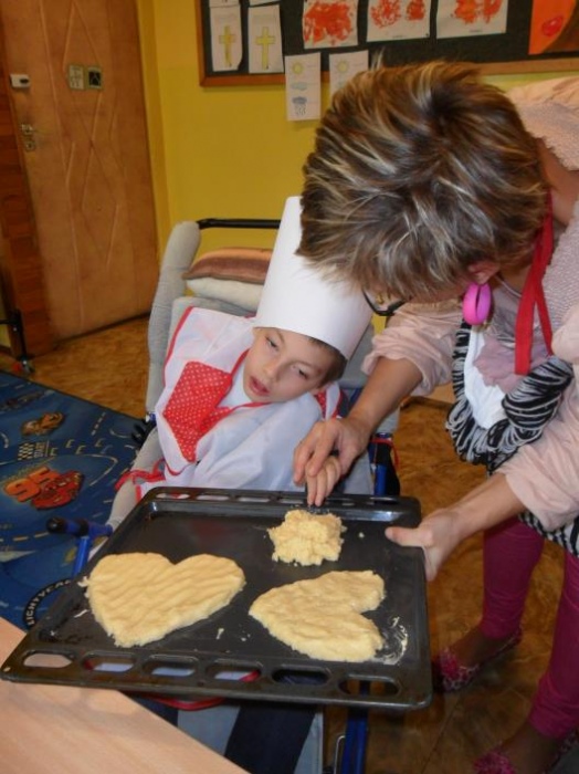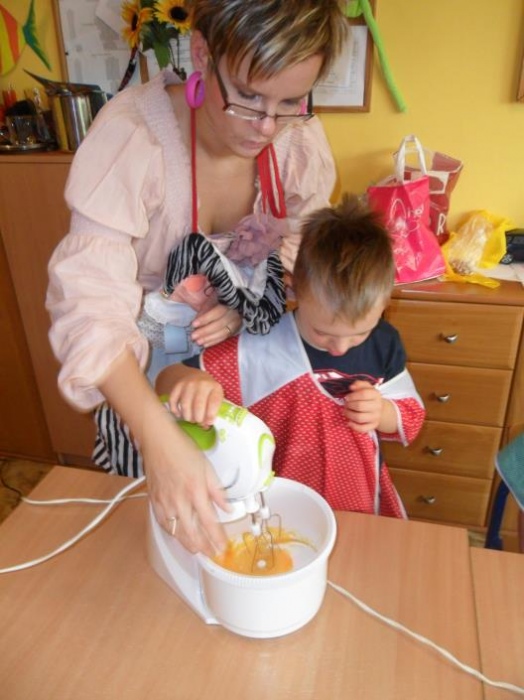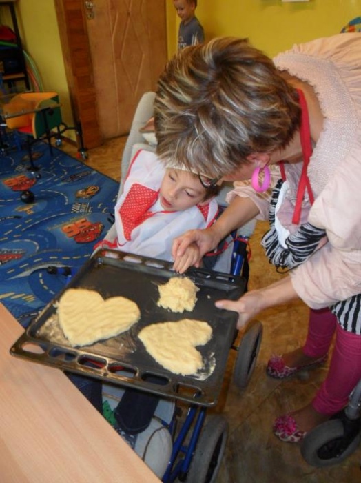 Jedno z ostatnich przedpołudni przedszkolaki spędziły niezwykle pracowicie. Motywem przewodnim tego dnia było pieczenie ciasteczek. Wszystkie dzieci ochoczo i z pełnym zaangażowaniem mieszały mikserem ciasto, by następnie nadać mu odpowiedni kształt. Były między innymi wielkie serca, które przedszkolaki z grupy ”P” ofiarowały swoim najukochańszym Mamusiom.