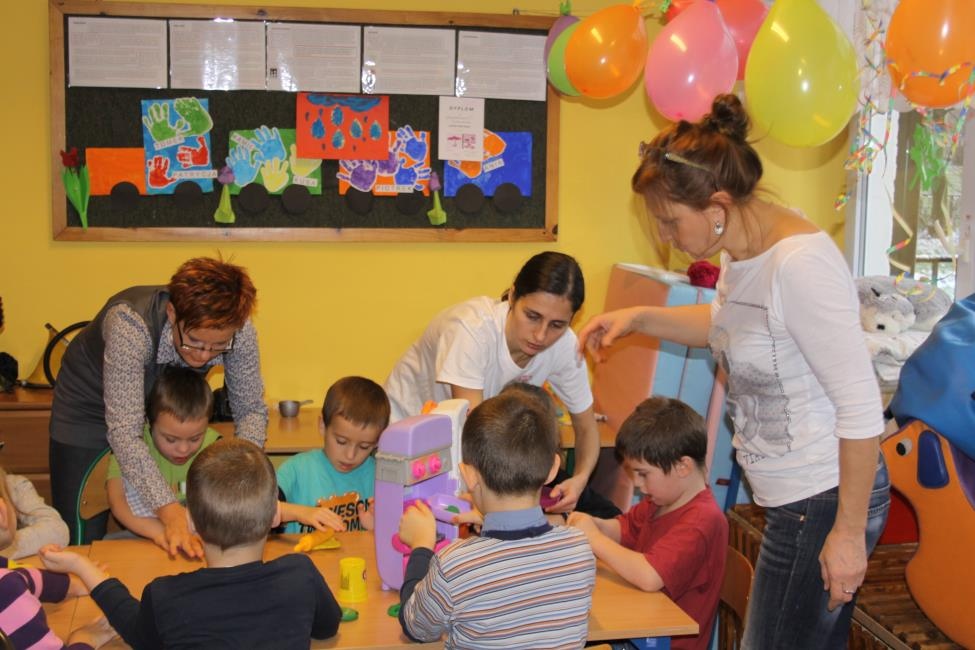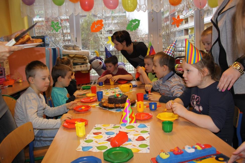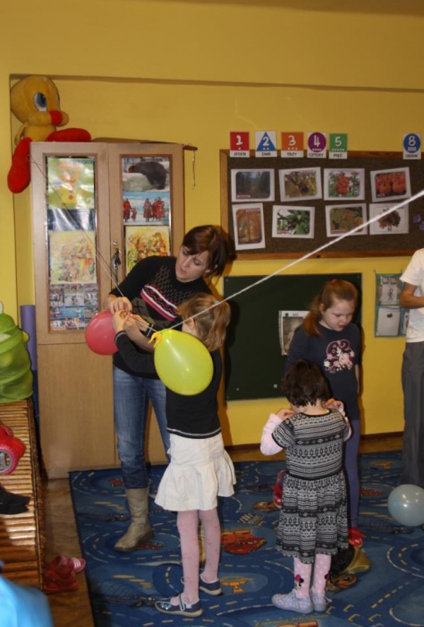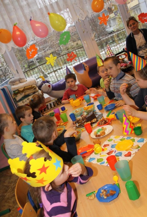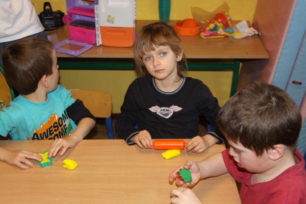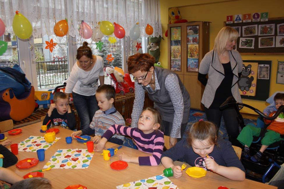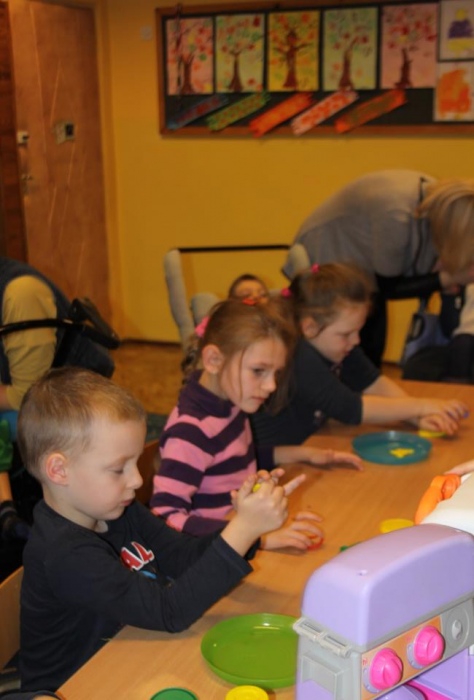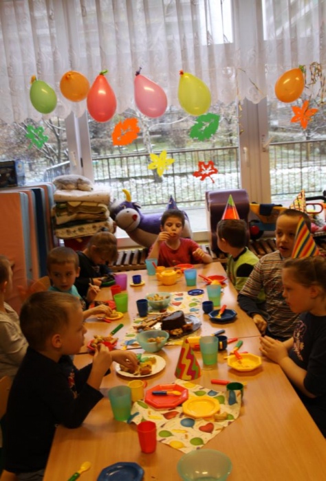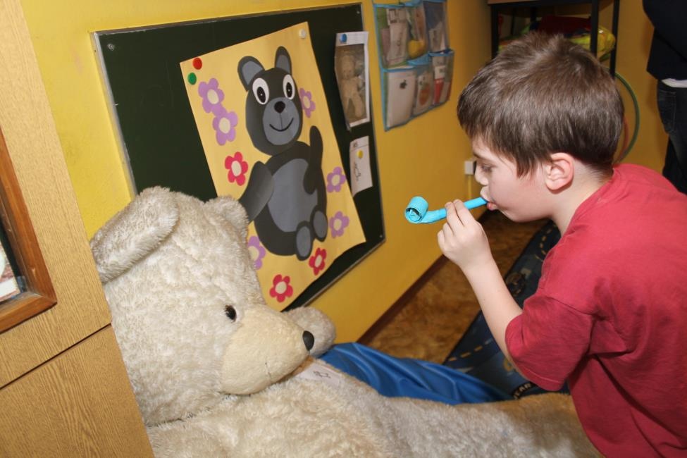 Dzieci zaczęly od przygotowania laurki z podobizną Misia i życzeniami. Następnie zabrały się do dekorowania sali: dmuchały balony, wieszały serpentyny. Potem trzeba było przygotować "poczęstunek" - dzieci zrobiły ciastelinkowe ciasteczka i przygotowały odpowiednią na deser zastawę stołową. Pozostało czekać na upragnionego gościa...
