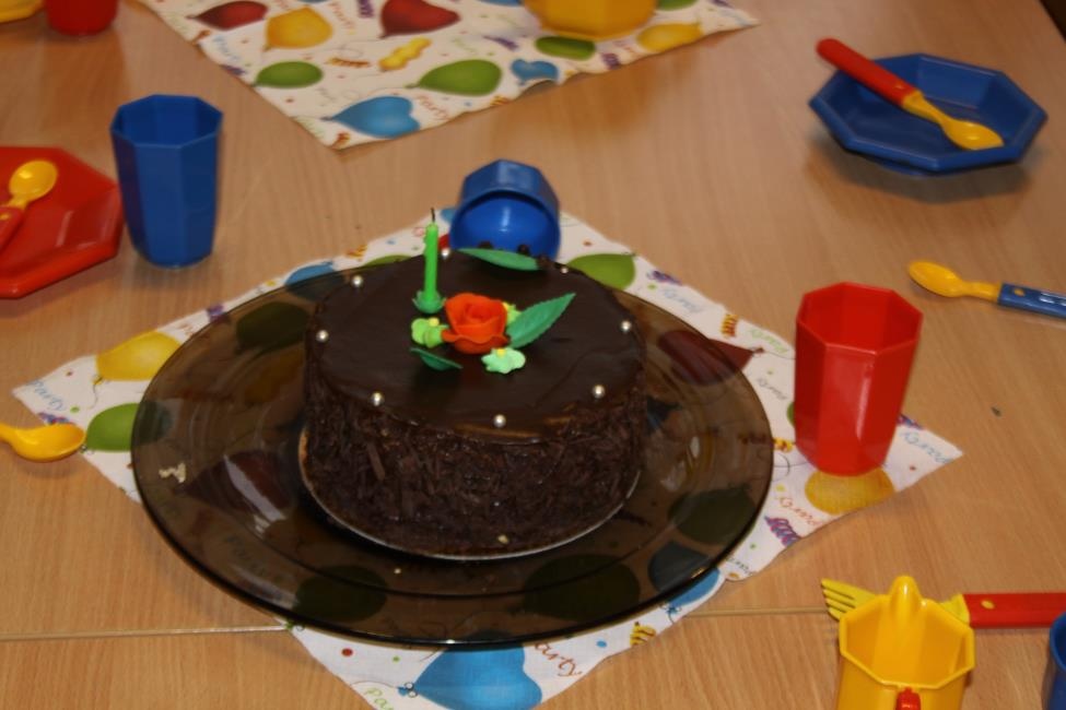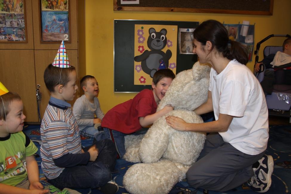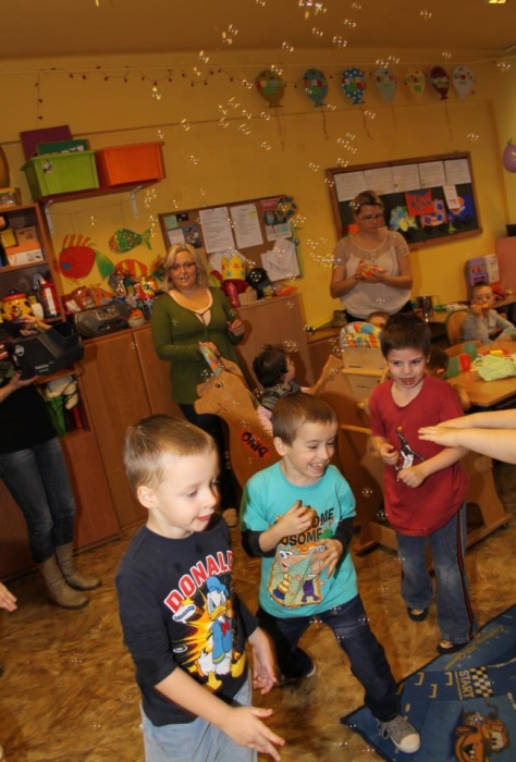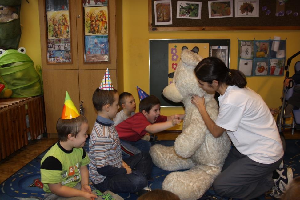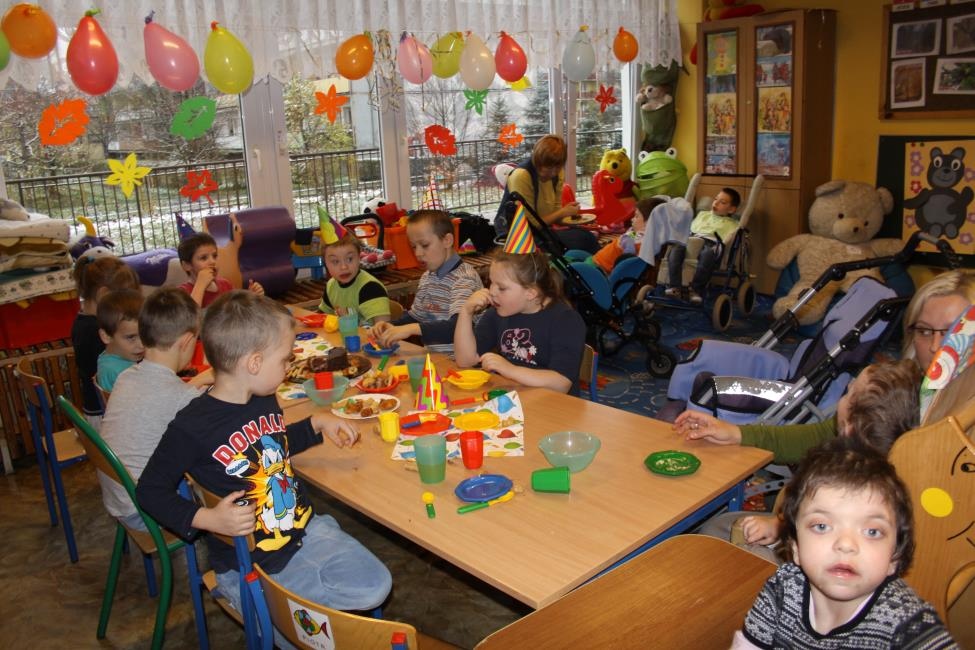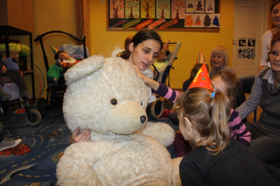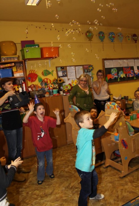 Gdy Miś już dotarł wszyscy powitali go gorąco piosenką, a on przywitał się z każdym dzieckiem z osobna. Dzieci wręczyły Misiowi prezent, złożyły życzenia i odśpiewały gromkie "100 lat". Niespodzianką był prawdziwy (już nie z ciastoliny) tort! Zanim jednak dzieci zasiadły do poczęstunku, Miś porwał wszsytkich do wspólnej kołowej zabawy. Był znany " Stary Niedźwiedź", "Balonik" oraz nowa piosenka o Misiu (z utrawalaniem gestów Makaton). Furrorę zrobiła maszynka do robienia baniek mydlanych, dzięki której dzieci mogły wirować wśród baniek przy dźwiękach misiowych piosenek. Imprezę trzeba było jednak powoli kończyć. Okazało się jednak, że Misiowi tak spodobało się w naszym przedszkolu, że postanowił zostać w nim na zawsze:)