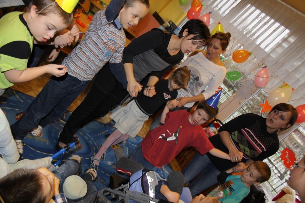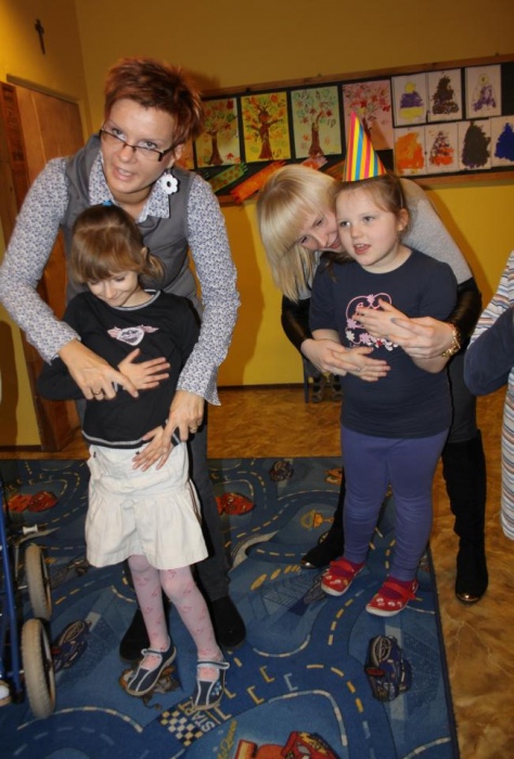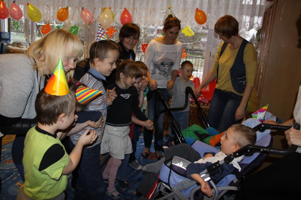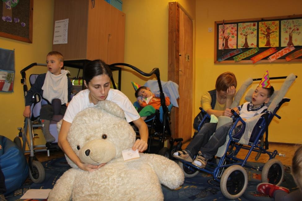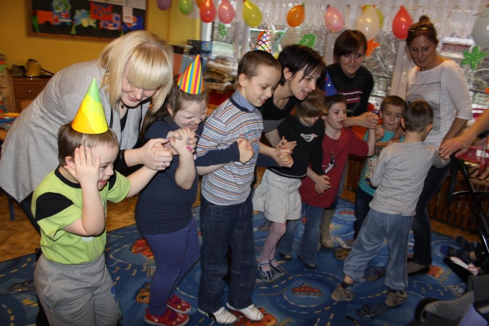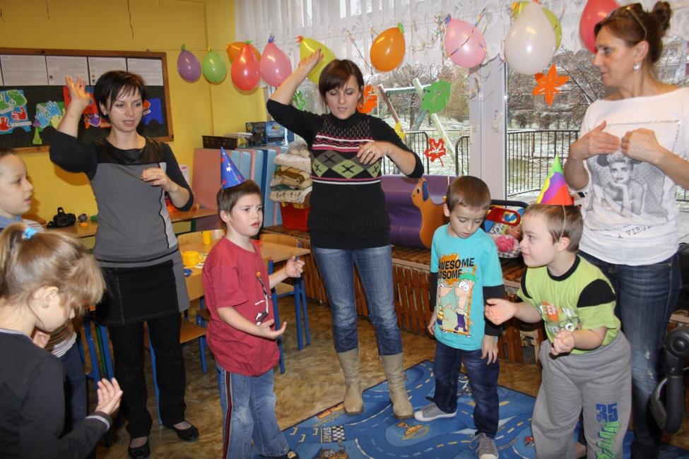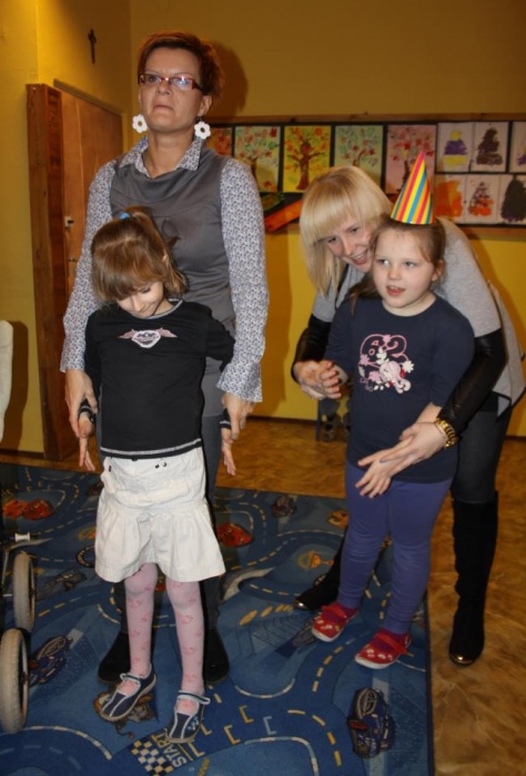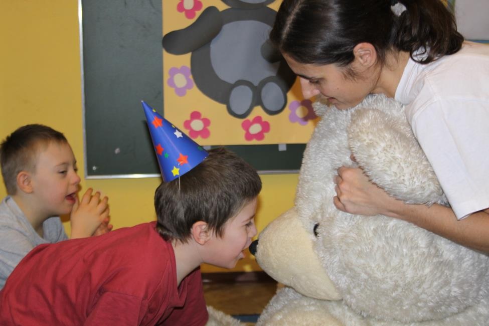 Gdy Miś już dotarł wszyscy powitali go gorąco piosenką, a on przywitał się z każdym dzieckiem z osobna. Dzieci wręczyły Misiowi prezent, złożyły życzenia i odśpiewały gromkie "100 lat". Niespodzianką był prawdziwy (już nie z ciastoliny) tort! Zanim jednak dzieci zasiadły do poczęstunku, Miś porwał wszsytkich do wspólnej kołowej zabawy. Był znany " Stary Niedźwiedź", "Balonik" oraz nowa piosenka o Misiu (z utrawalaniem gestów Makaton). Furrorę zrobiła maszynka do robienia baniek mydlanych, dzięki której dzieci mogły wirować wśród baniek przy dźwiękach misiowych piosenek. Imprezę trzeba było jednak powoli kończyć. Okazało się jednak, że Misiowi tak spodobało się w naszym przedszkolu, że postanowił zostać w nim na zawsze:)