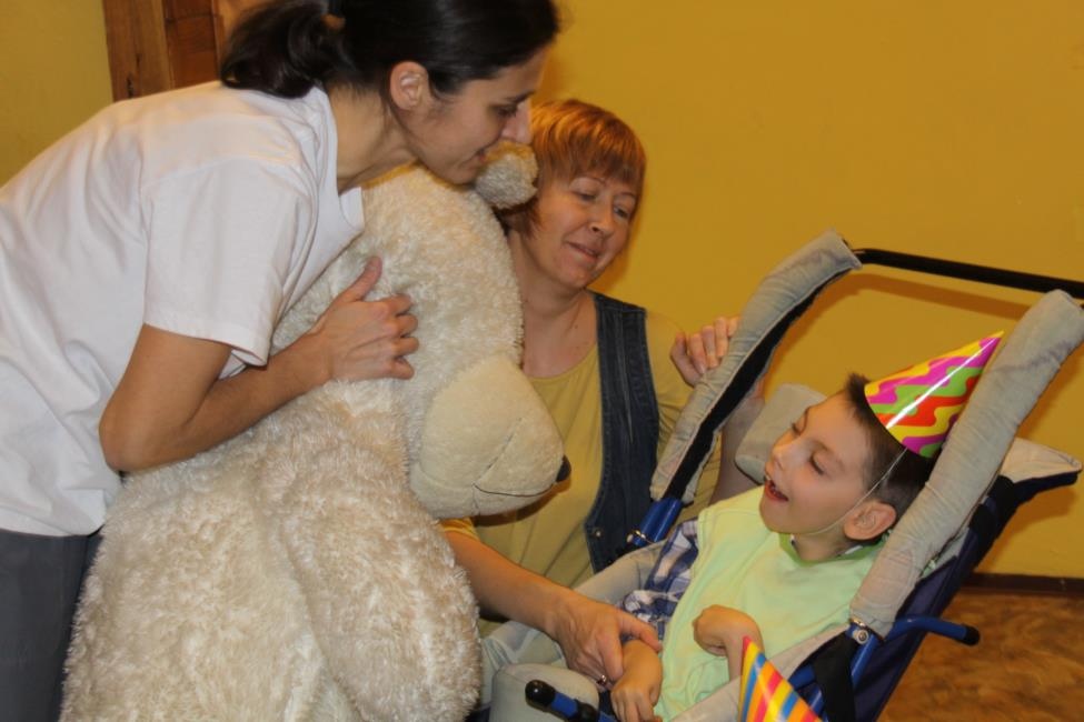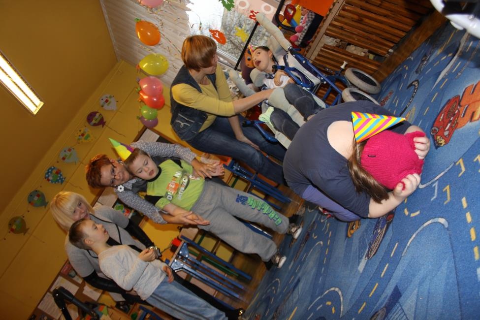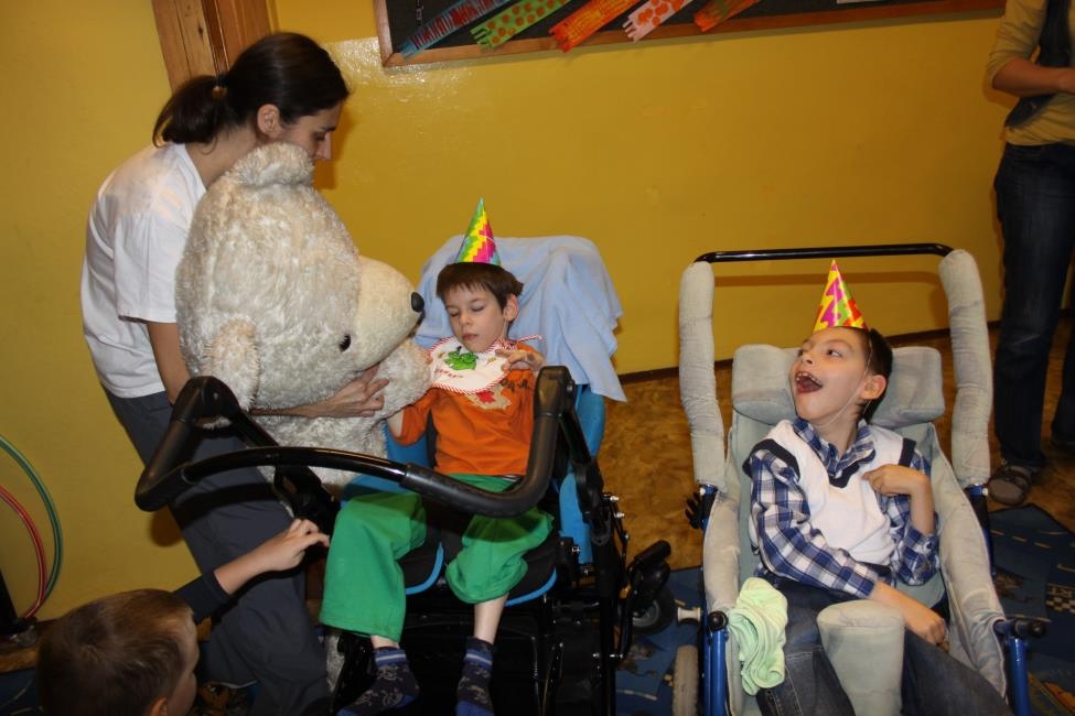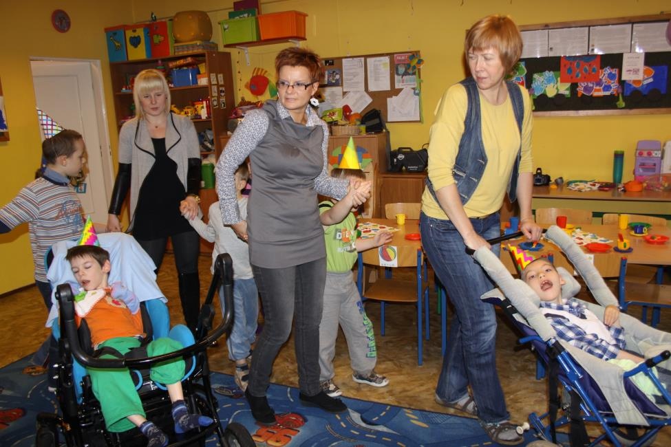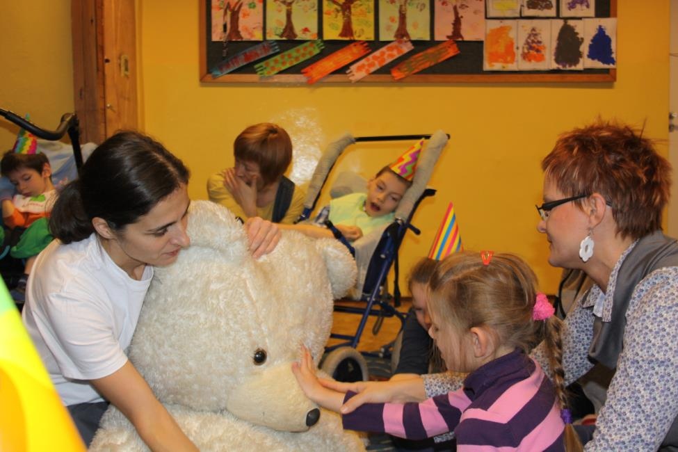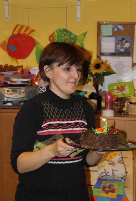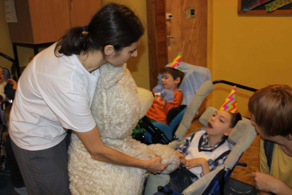 Gdy Miś już dotarł wszyscy powitali go gorąco piosenką, a on przywitał się z każdym dzieckiem z osobna. Dzieci wręczyły Misiowi prezent, złożyły życzenia i odśpiewały gromkie "100 lat". Niespodzianką był prawdziwy (już nie z ciastoliny) tort! Zanim jednak dzieci zasiadły do poczęstunku, Miś porwał wszsytkich do wspólnej kołowej zabawy. Był znany " Stary Niedźwiedź", "Balonik" oraz nowa piosenka o Misiu (z utrawalaniem gestów Makaton). Furrorę zrobiła maszynka do robienia baniek mydlanych, dzięki której dzieci mogły wirować wśród baniek przy dźwiękach misiowych piosenek. Imprezę trzeba było jednak powoli kończyć. Okazało się jednak, że Misiowi tak spodobało się w naszym przedszkolu, że postanowił zostać w nim na zawsze:)