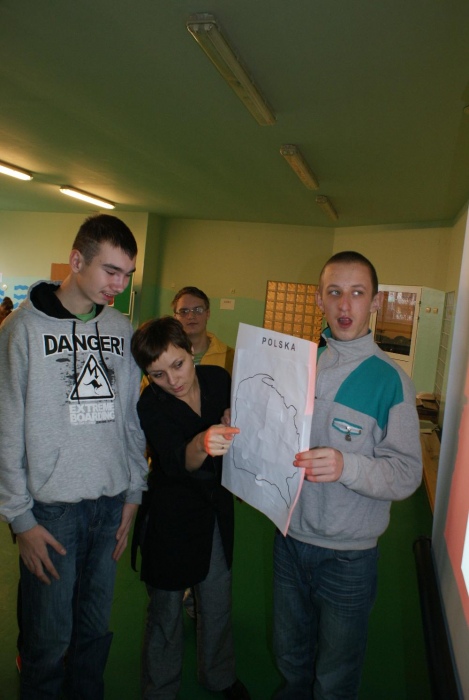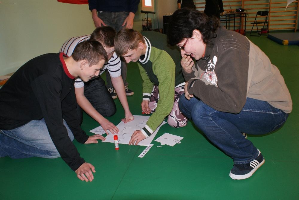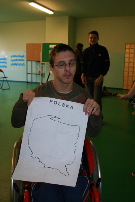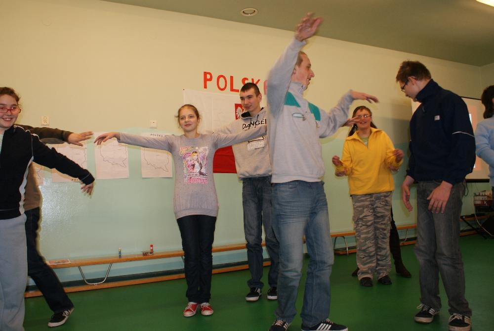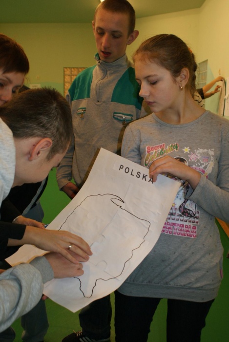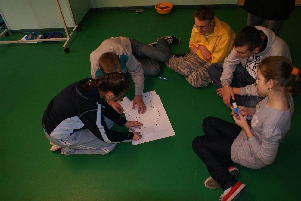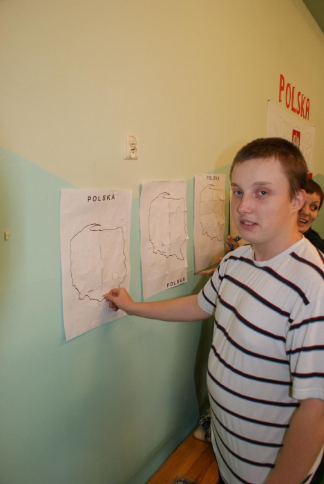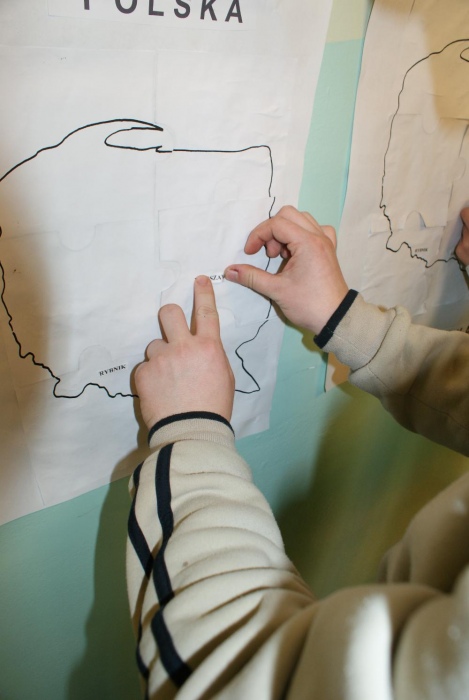 Jak przystało na porządnych podróżników, by ruszyć w drogę musieliśmy zrobić sobie mapy. Następnie udaliśmy się autobusem w góry, gdzie zasmakowaliśmy góralskiego sera oscypka i poznaliśmy główne zajęcia górali. Uczniowie wykazali się niemałą zręcznością podczas konkurencji polegającej na zwijaniu wełny. W dalszą drogę udaliśmy się pociągiem. Kolejnym punktem naszej podróży, była Warszawa bo przecież trudno zwiedzając kraj nie odwiedzić jego stolicy. Prócz Zamku Królewskiego i Pałacu Kultury i Nauki zajrzeliśmy też do obecnie urzędującego prezydenta RP Bronisława Komorowskiego. Uczniowie poznali też legendę o warszawskiej syrence i pokolorowali herb Warszawy. Po wizycie w stolicy udaliśmy się kajakami do krainy tysiąca jezior, czyli na Mazury. Tutaj zapoznaliśmy się z miejscową przyrodą i policzyliśmy łódki. Po Mazurach przyszła kolej na nasze polskie morze, czyli Bałtyk, nad który dojechaliśmy rowerami. Uczniowie świetnie wiedzieli w jaki sposób można spędzać czas przebywając nad morzem, a także, co można znaleźć w czasie spaceru po plaży. Na koniec naszej wizyty dzieci wyszukiwały w nadmorskim piasku muszelki i kamyki by ułożyć z nich rybkę. Ostatnim miejscem naszej wędrówki był Śląsk, a ponieważ, by tu dotrzeć musieliśmy przemierzyć cały kraj więc wsiedliśmy do samolotu. Na Śląsku przypomnieliśmy sobie charakterystyczne potrawy regionalnej kuchni i naszą gwarę, a także to z czego słynie nasz region czyli kopalnie węgla. Dzieci świetnie opisały, jak wygląda górnik i na czym polega jego praca. Ostatnim zadaniem było ułożenie według wzoru konturów szybu kopalnianego.