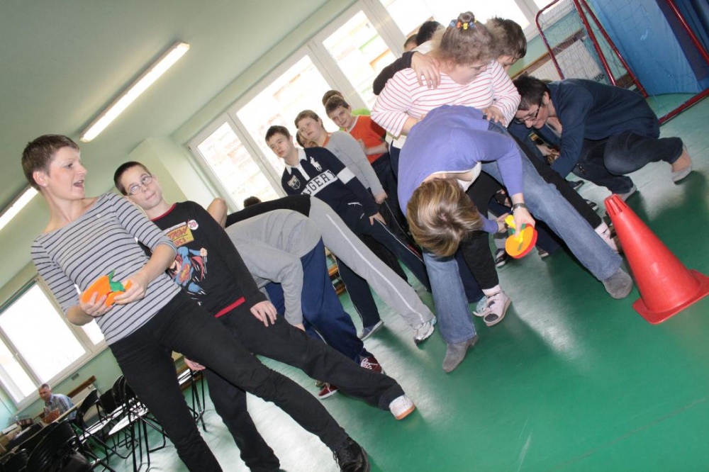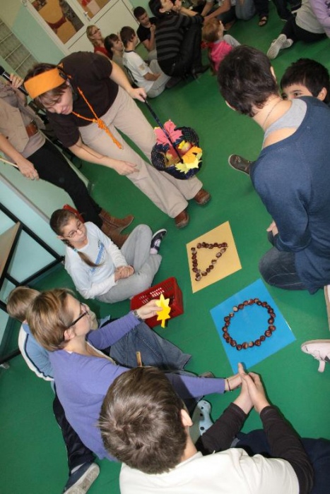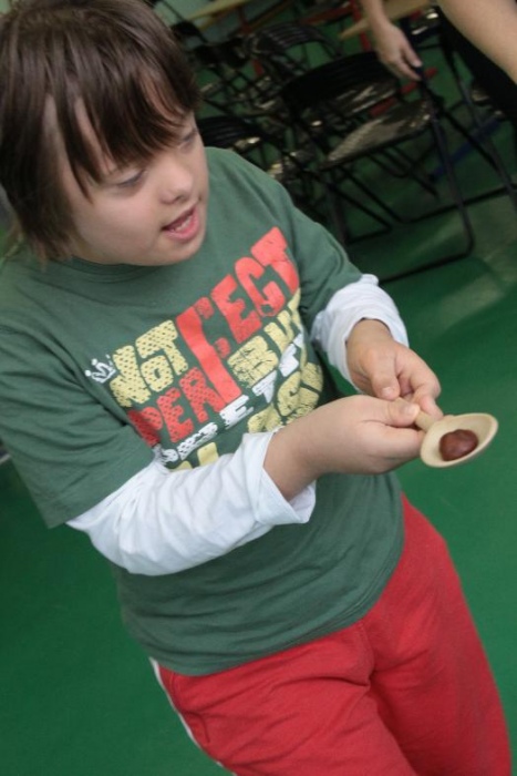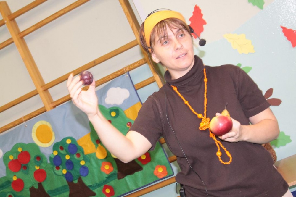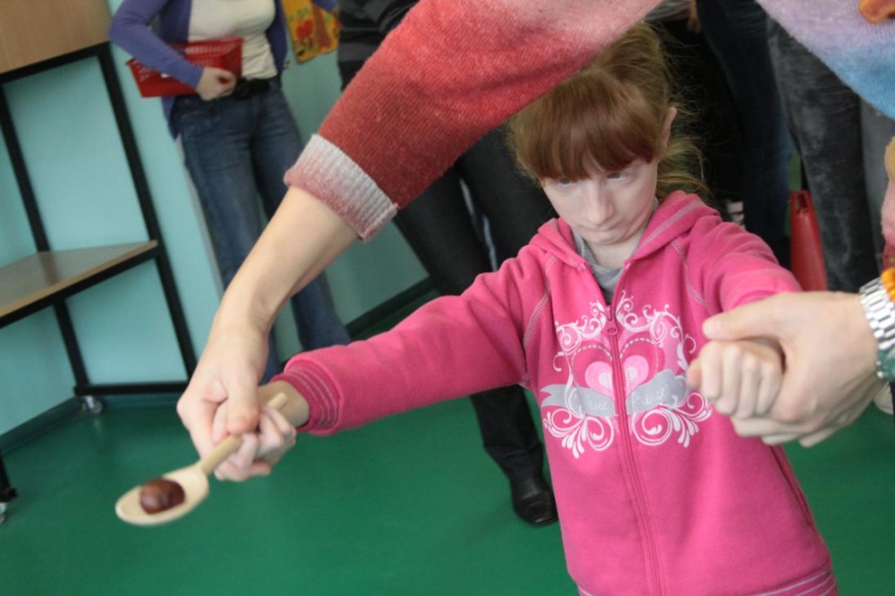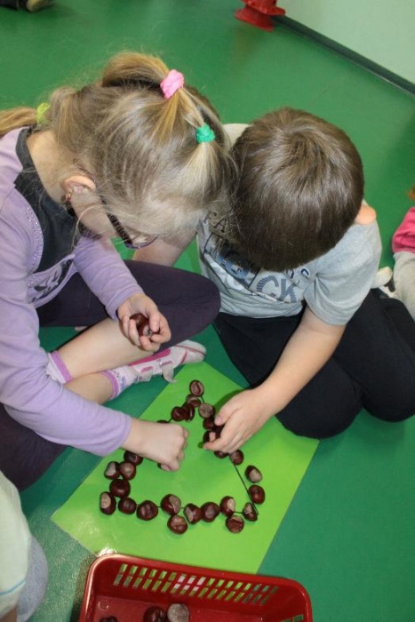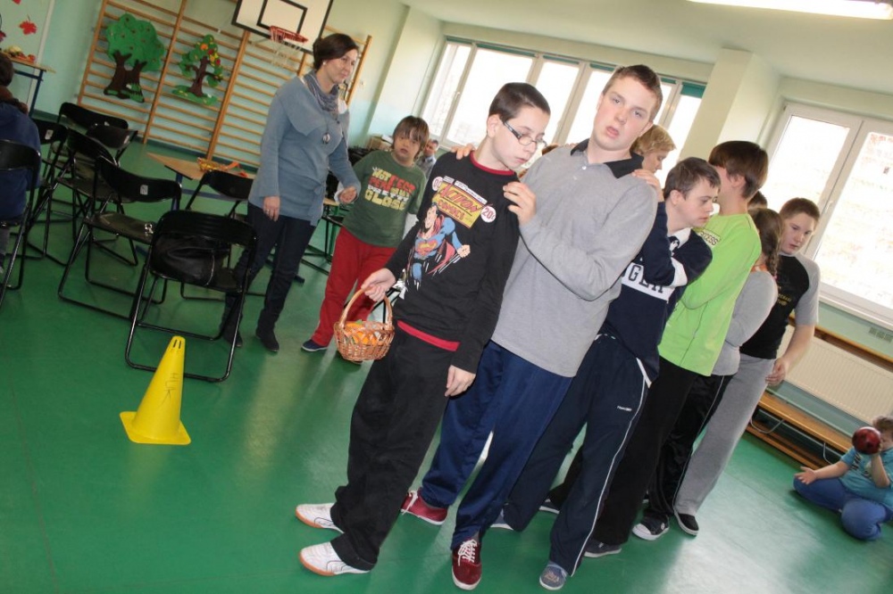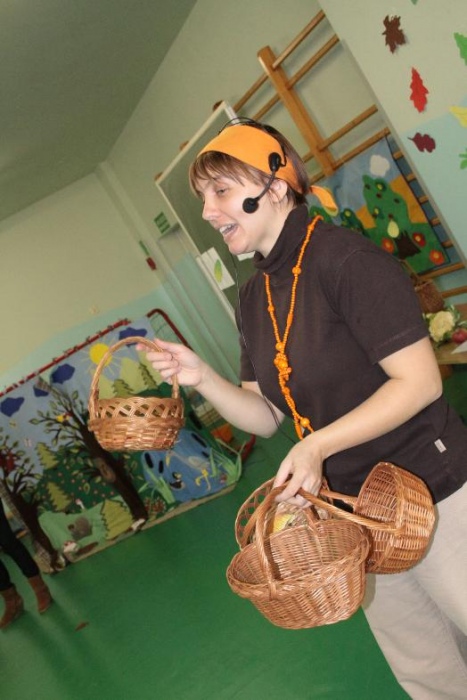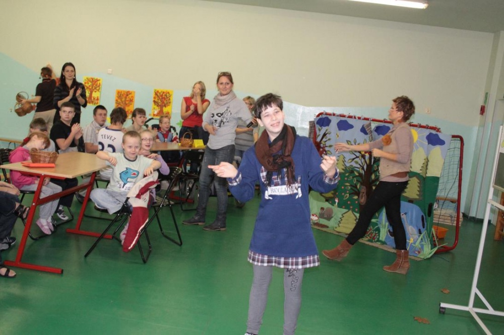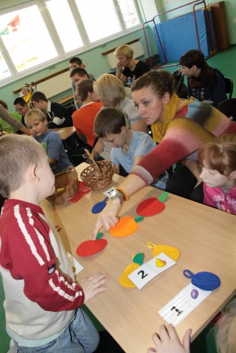 Cztery drużyny zmagały się z indywidualnymi i zespołowymi konkurencjami. Były :jesienne puzzle, zbieranie owoców w sadzie, owocowa sztafeta, koszyk z warzywami, loteryjka owocowo-warzywna, zabawy z kasztanami, grzybobranie , a na koniec układanie parasoli z kolorowych „guzików”.