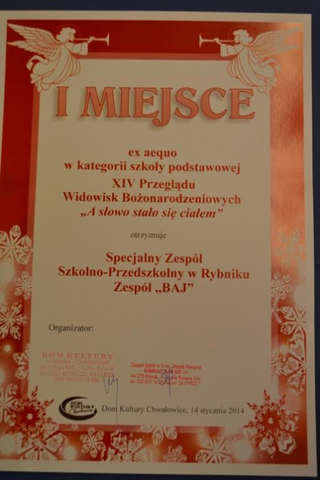 9 stycznia 2014 roku, zespół BAJ wystąpił w Domu Kultury w Chwałowicach podczas XIV Przeglądu Widowisk Bożonarodzeniowych "A słowa ciałem sie stało". Nasz zespoł teatralny zaprezentował przedstawienie jasełkowe pt.: ,,Znak świątecznej radości”. Adresatami konkursu były: dzieci i młodzież szkół podstawowych i gimnazjów wszystkich typów powiatu rybnickiego oraz młodzież gimnazjalna z powiatu rybnickiego, wodzisławskiego i żorskiego.