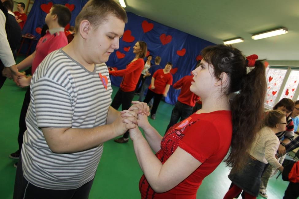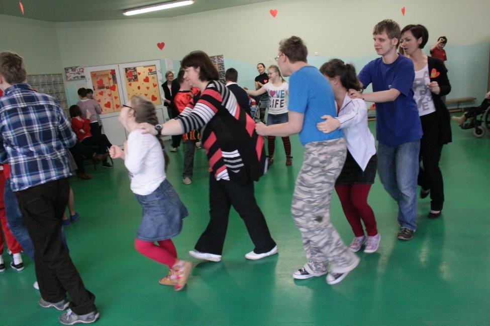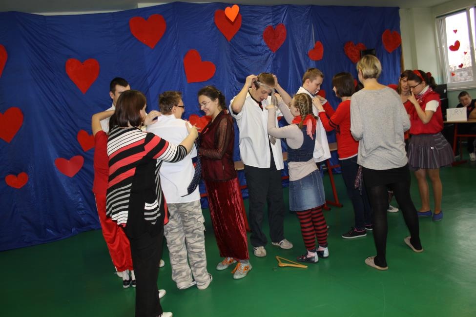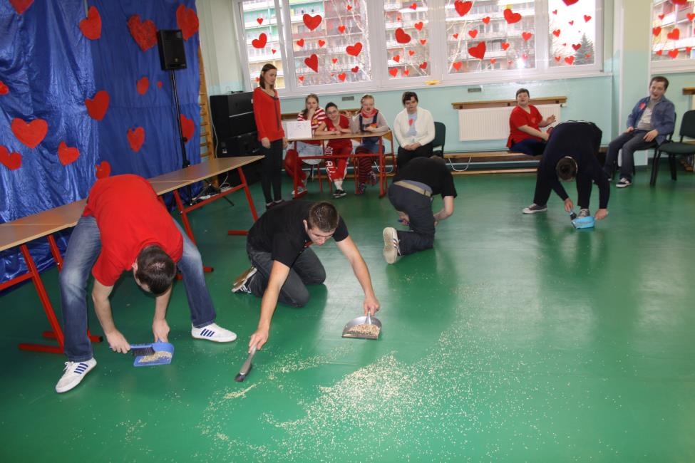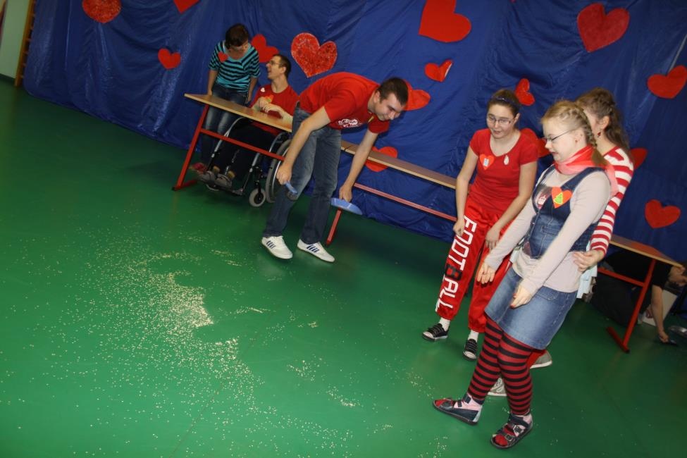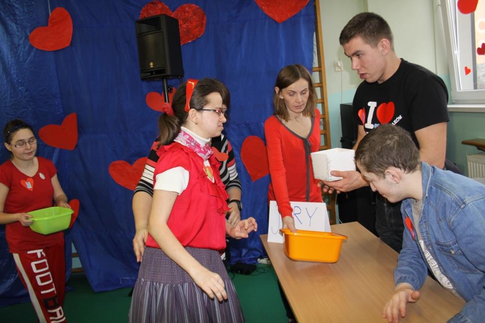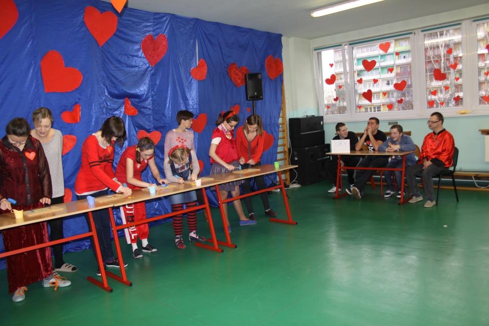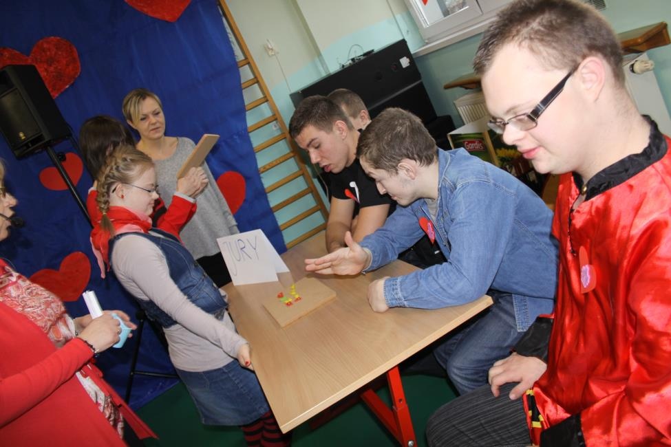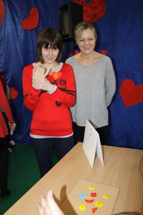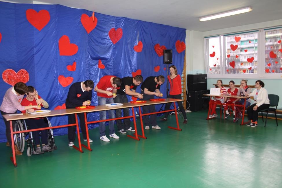 Czoła wyzwaniom musieli stawić także przedstawiciele zespołów rewalidacyjno - wychowawczych, którzy malowali czerwone serca gąbkami i segregowali przedmioty według kolorów. Uwieńczeniem „walentynkowych” zmagań na „Prawdziwą Dziewczynę” i „Prawdziwego Chłopaka” był słodki poczęstunek oraz to, co nasi uczniowie lubią najbardziej - dyskoteka w rytmie największych i najpopularniejszych szlagierów.