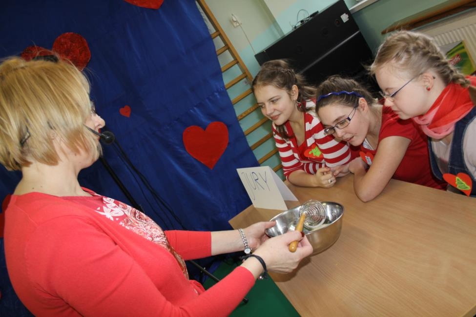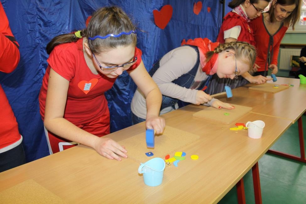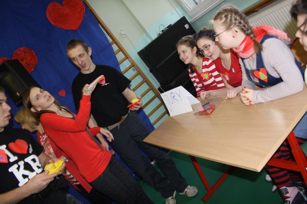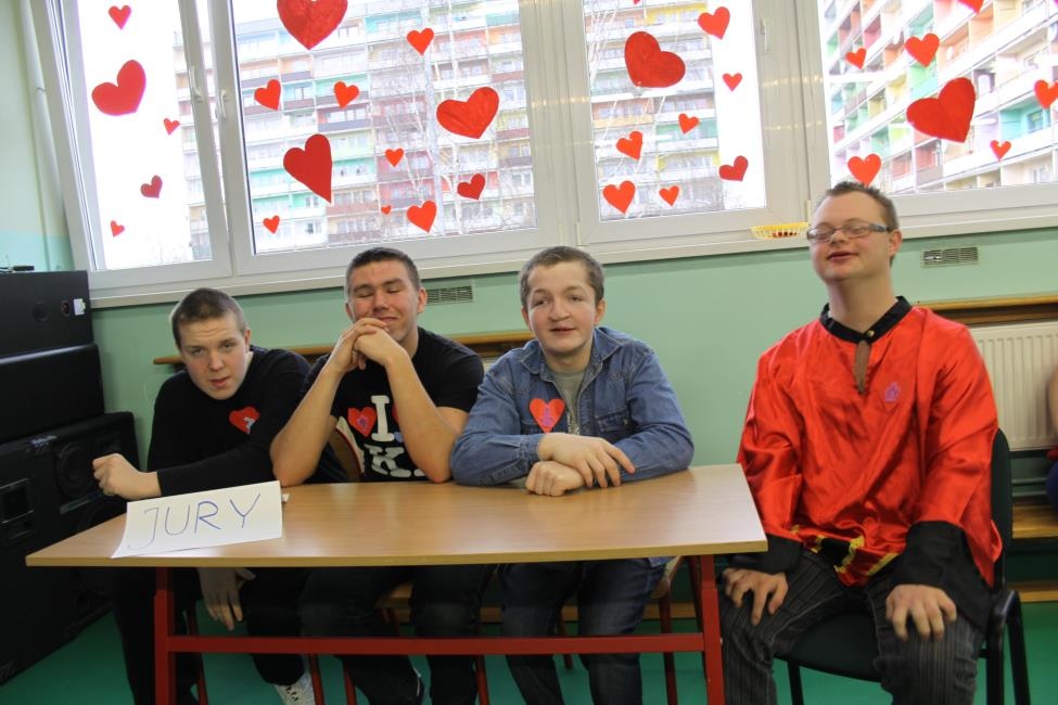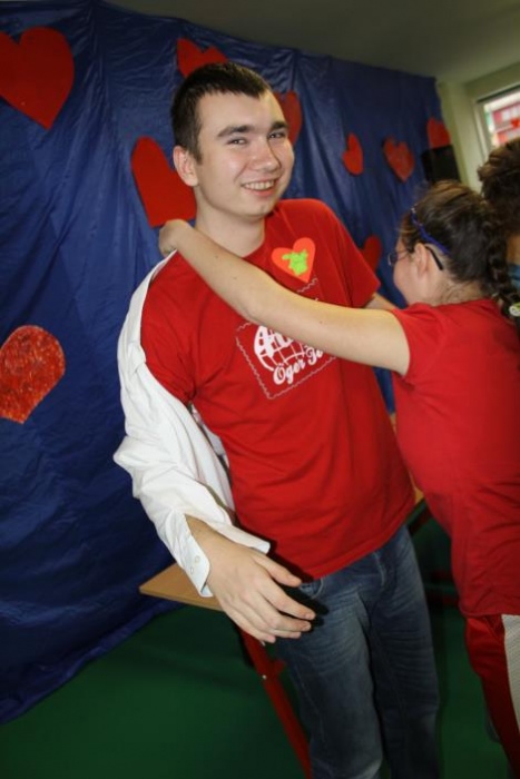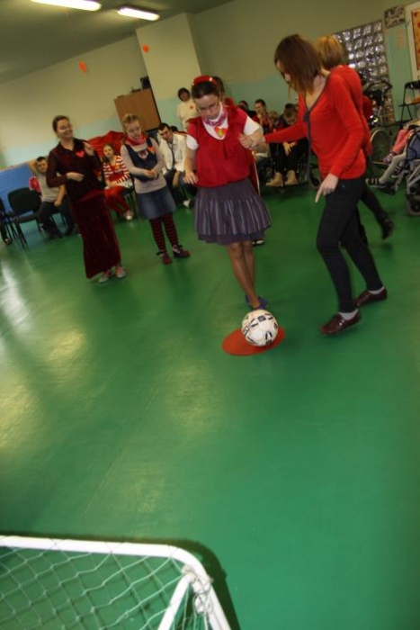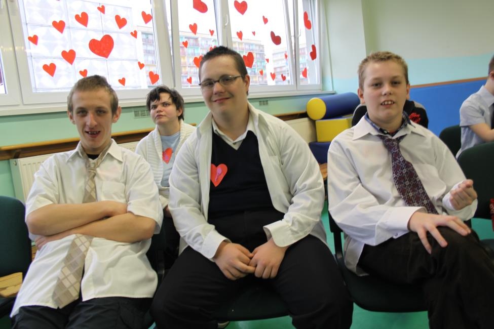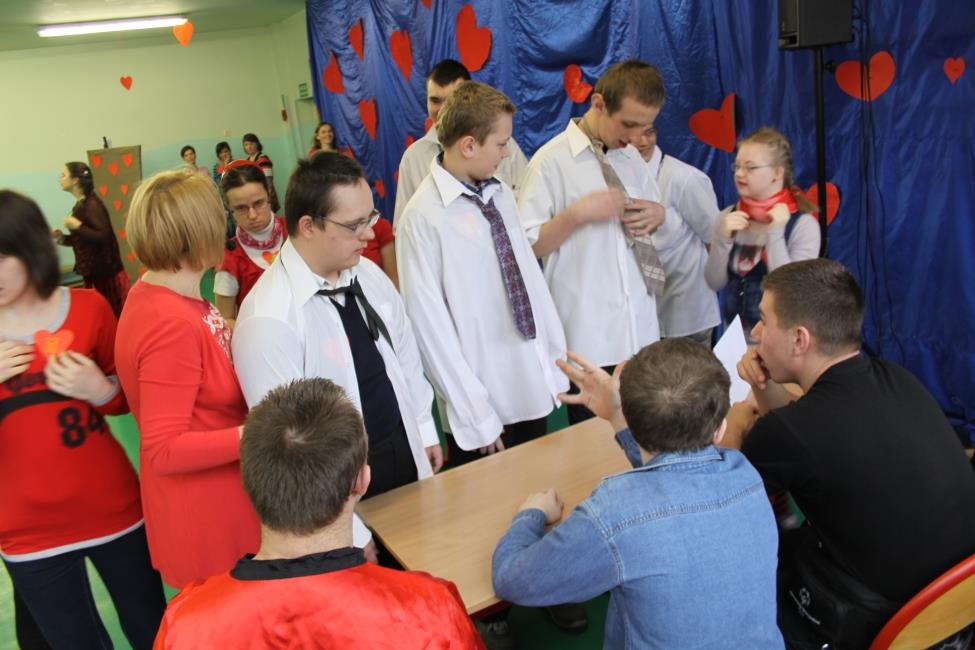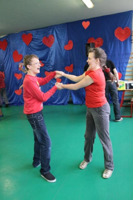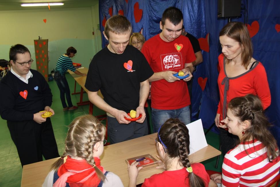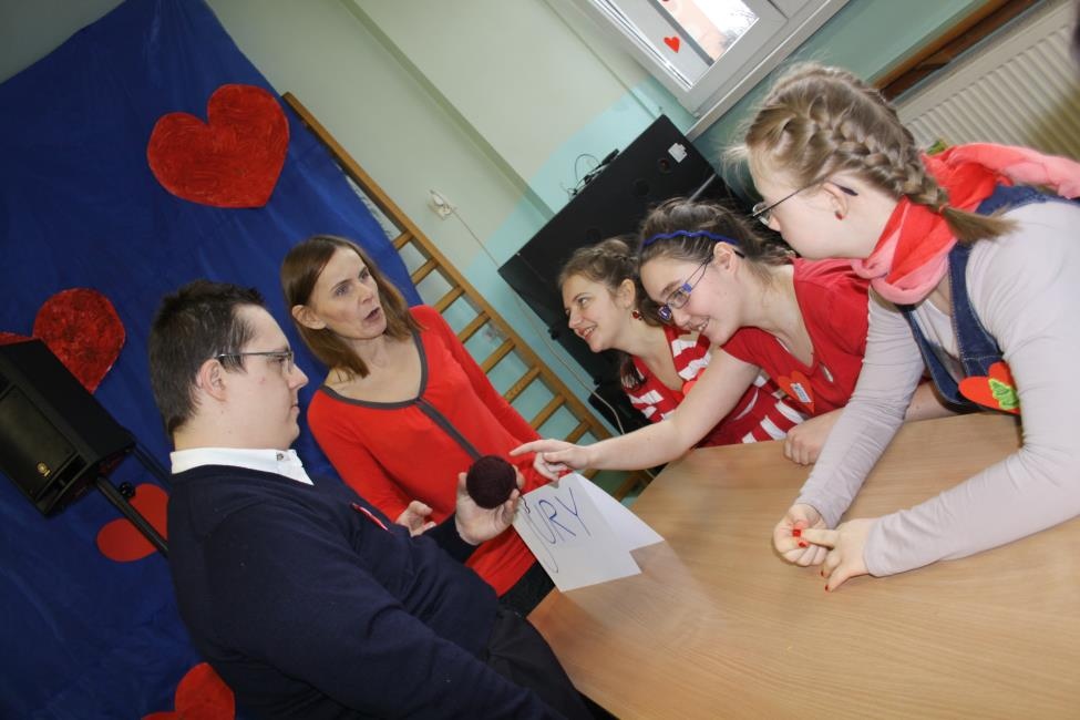 Czoła wyzwaniom musieli stawić także przedstawiciele zespołów rewalidacyjno - wychowawczych, którzy malowali czerwone serca gąbkami i segregowali przedmioty według kolorów. Uwieńczeniem „walentynkowych” zmagań na „Prawdziwą Dziewczynę” i „Prawdziwego Chłopaka” był słodki poczęstunek oraz to, co nasi uczniowie lubią najbardziej - dyskoteka w rytmie największych i najpopularniejszych szlagierów.