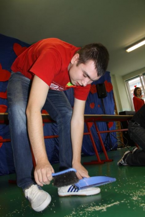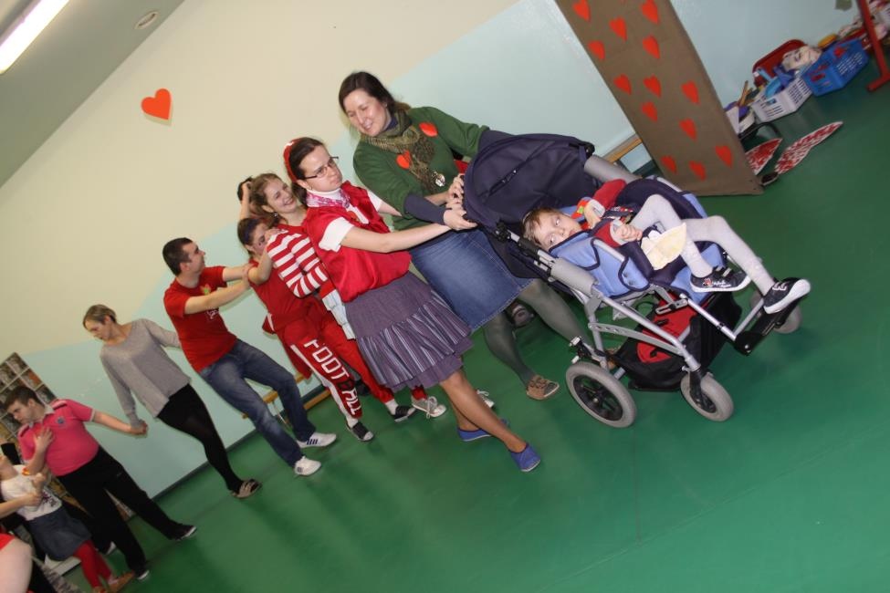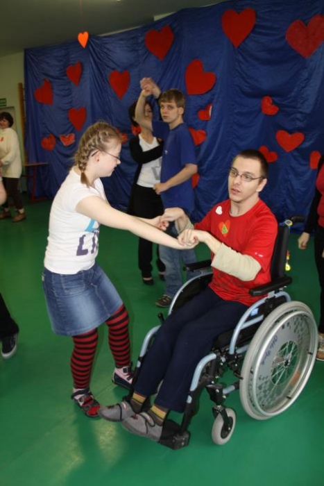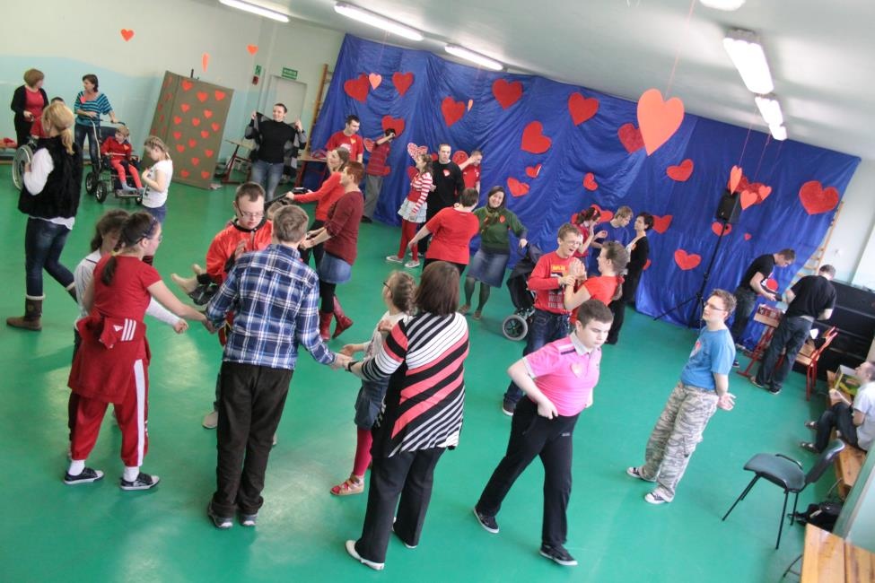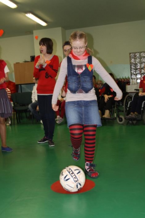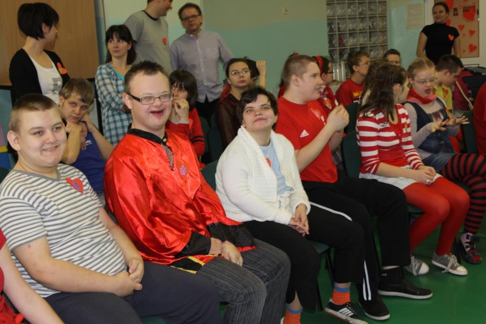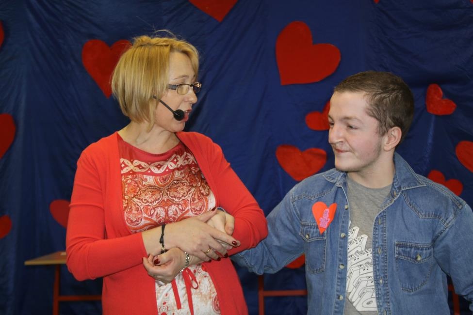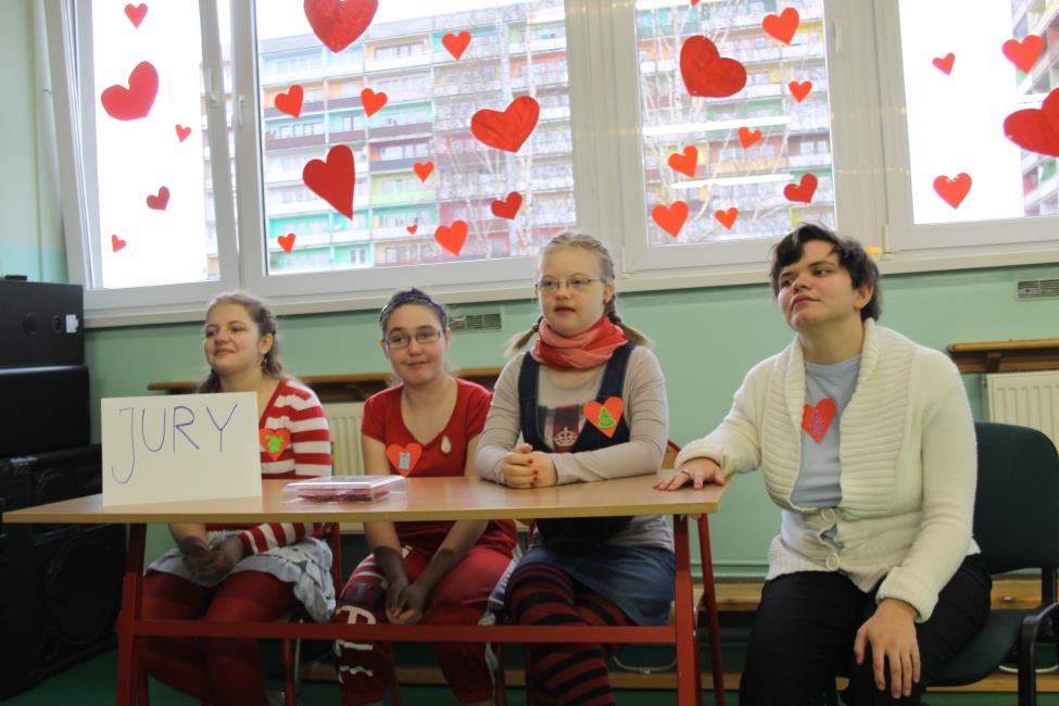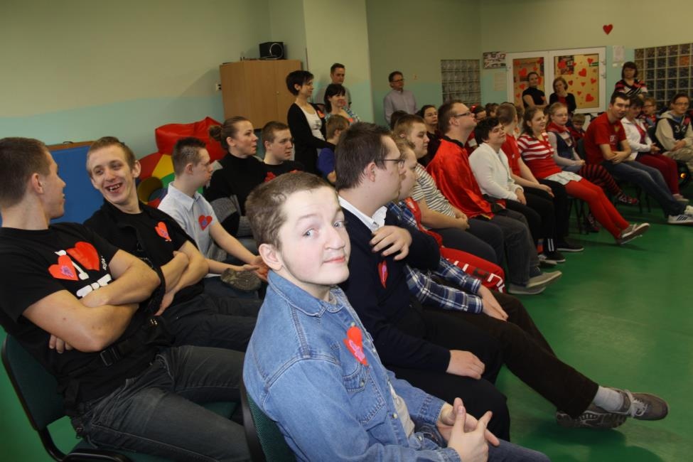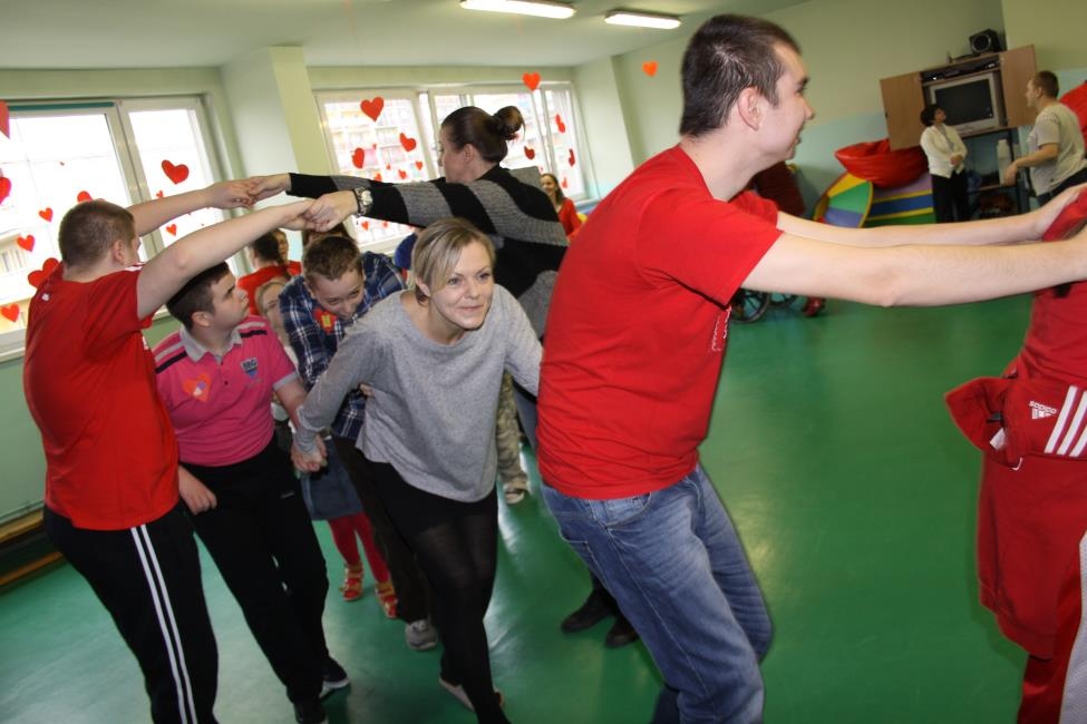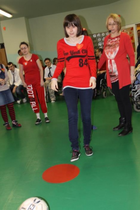 Czoła wyzwaniom musieli stawić także przedstawiciele zespołów rewalidacyjno - wychowawczych, którzy malowali czerwone serca gąbkami i segregowali przedmioty według kolorów. Uwieńczeniem „walentynkowych” zmagań na „Prawdziwą Dziewczynę” i „Prawdziwego Chłopaka” był słodki poczęstunek oraz to, co nasi uczniowie lubią najbardziej - dyskoteka w rytmie największych i najpopularniejszych szlagierów.