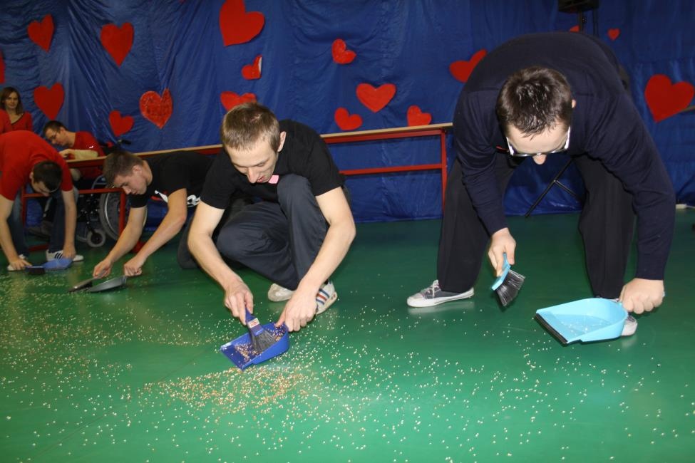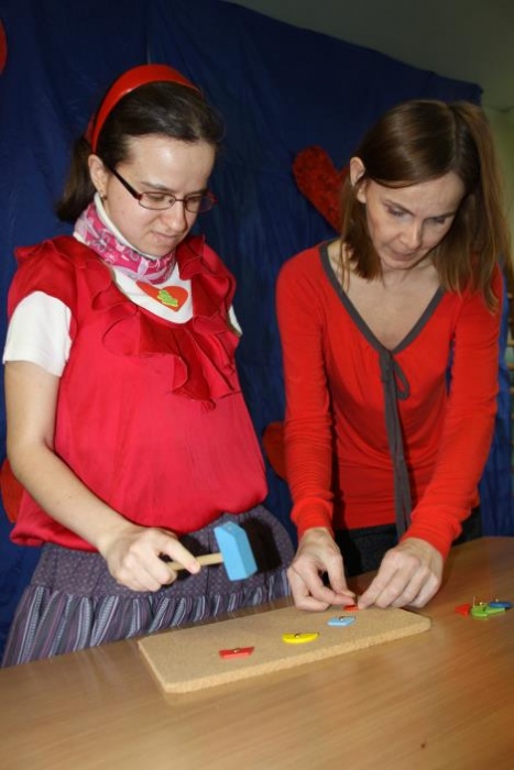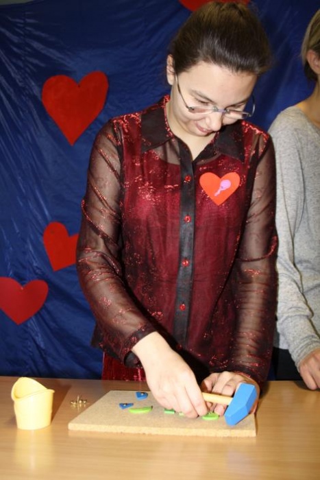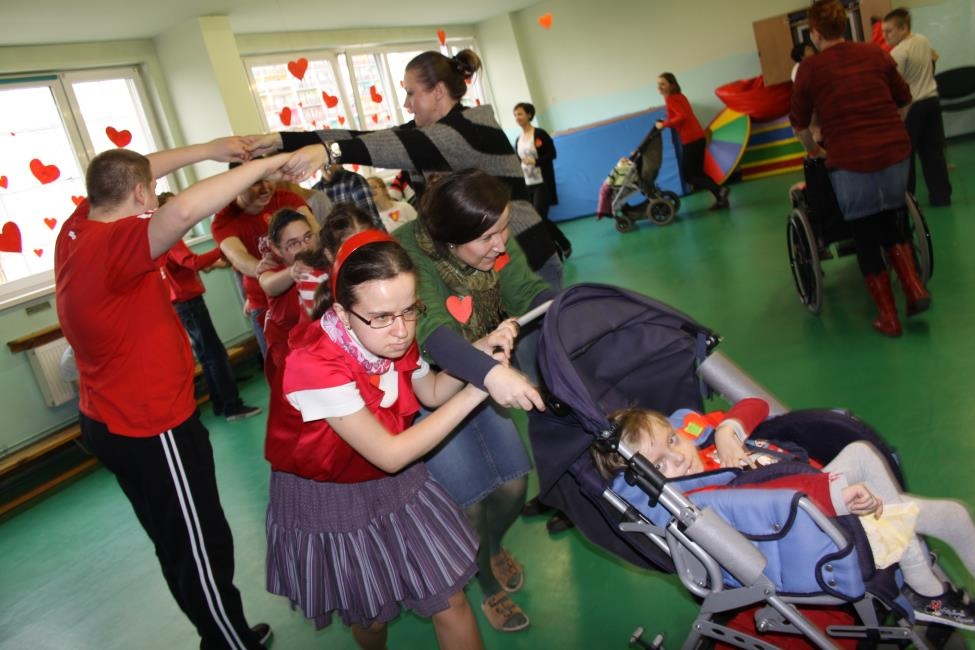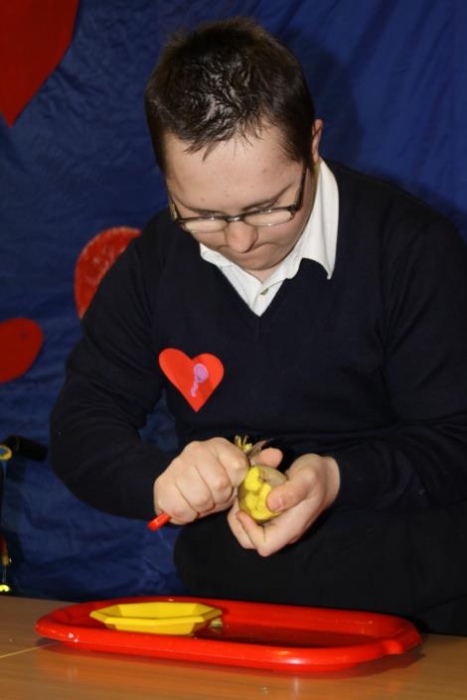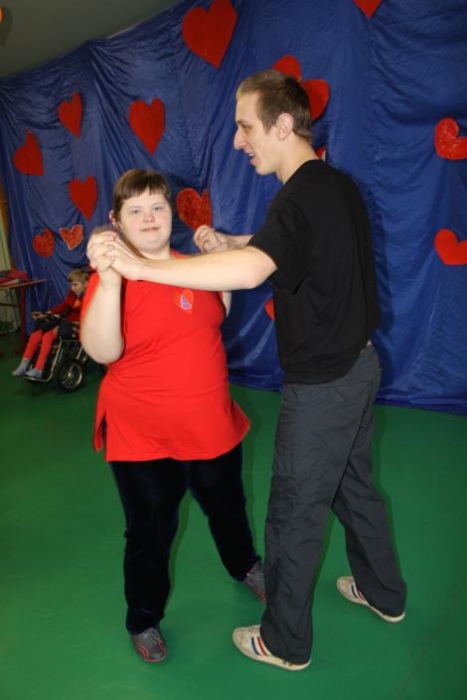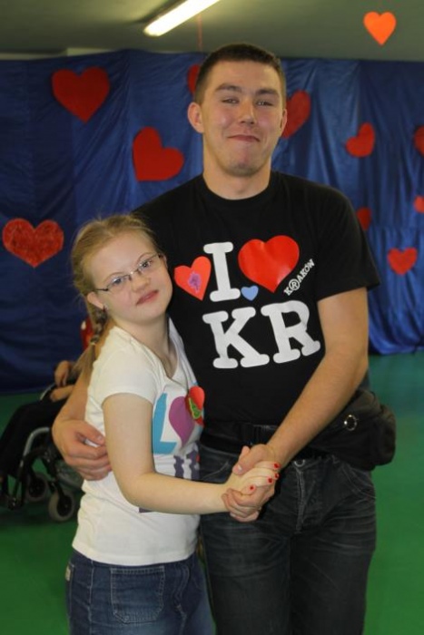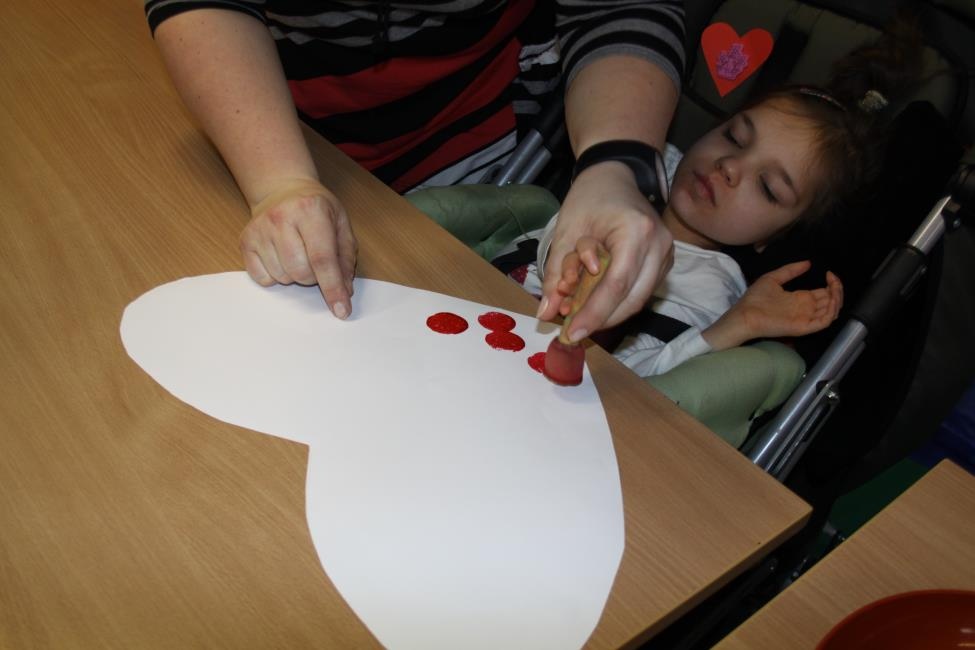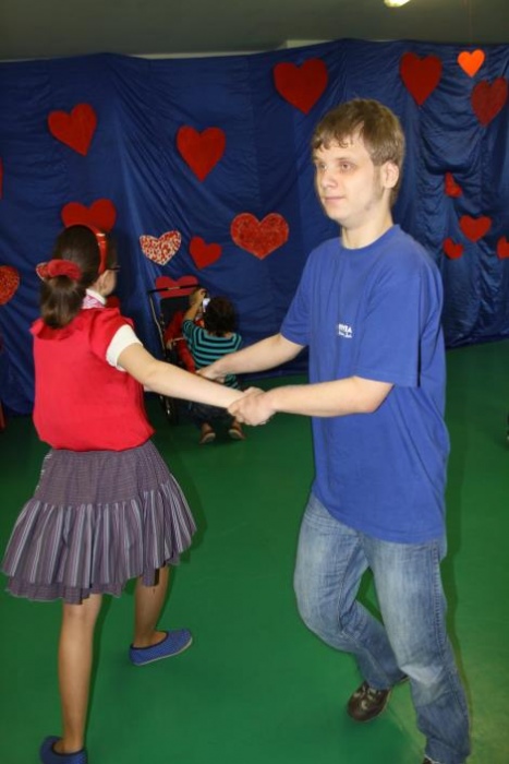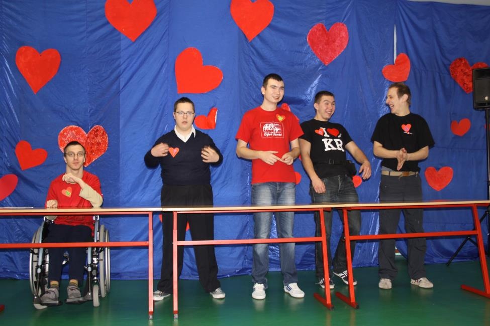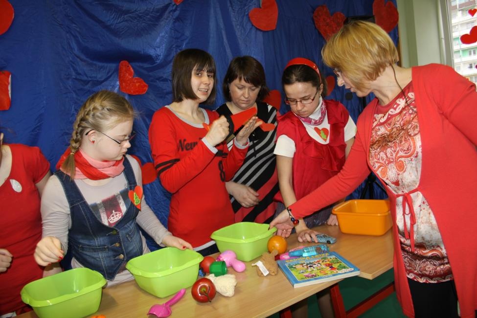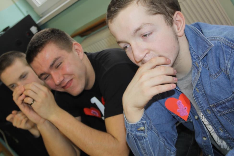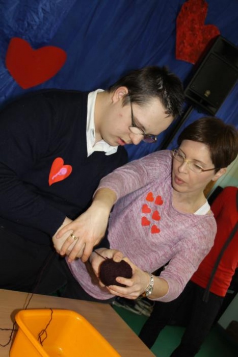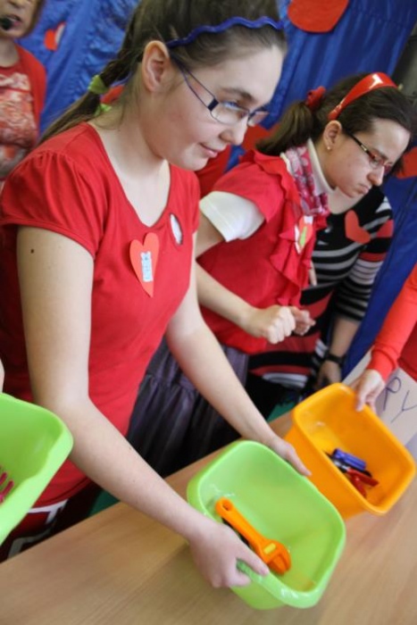 Czoła wyzwaniom musieli stawić także przedstawiciele zespołów rewalidacyjno - wychowawczych, którzy malowali czerwone serca gąbkami i segregowali przedmioty według kolorów. Uwieńczeniem „walentynkowych” zmagań na „Prawdziwą Dziewczynę” i „Prawdziwego Chłopaka” był słodki poczęstunek oraz to, co nasi uczniowie lubią najbardziej - dyskoteka w rytmie największych i najpopularniejszych szlagierów.