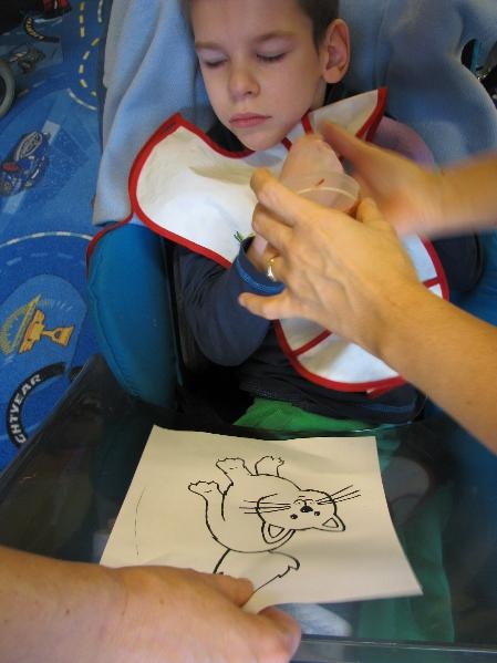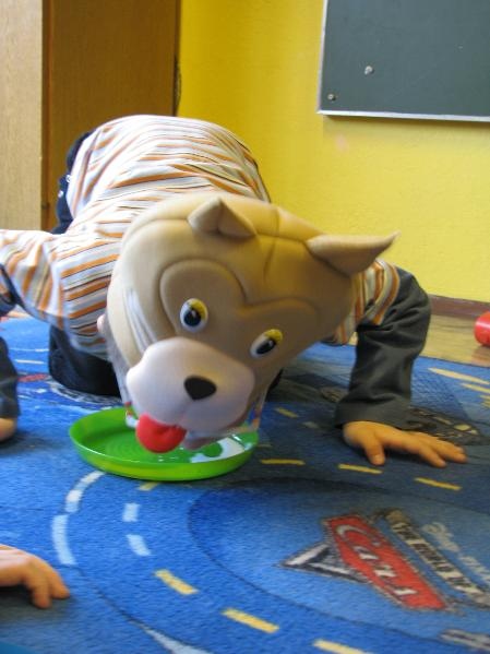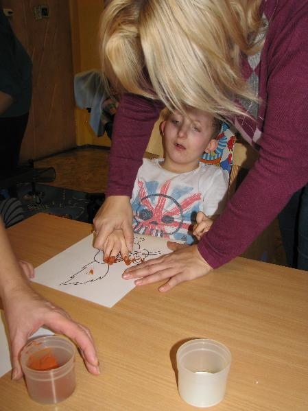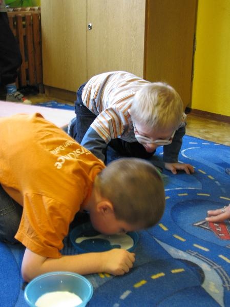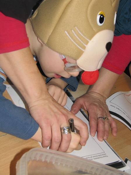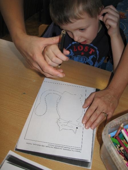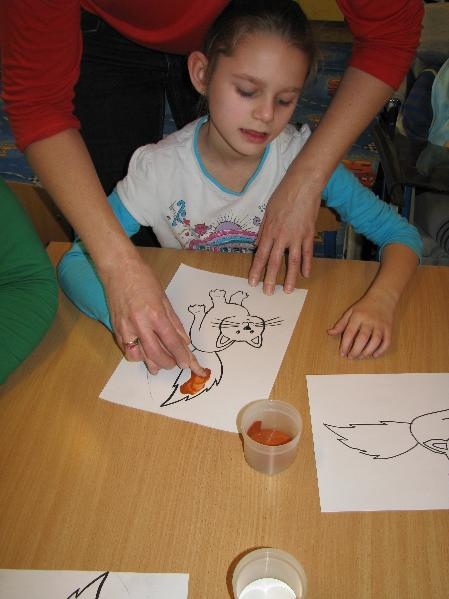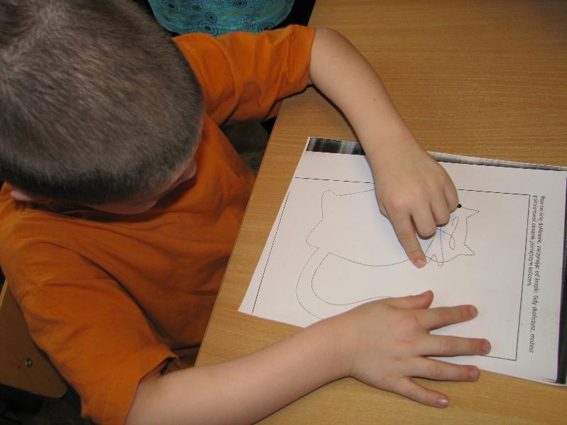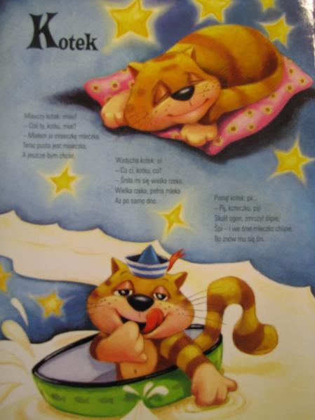 Młodzi czytelnicy mogli posłuchać wiersza Juliana Tuwima „Kotek”. Podczas czytania dzieci poznawały i naśladowały odgłosy i ruchy kota np. chodzenie na czworaka, przeciąganie się, mruczenie ,miałczenie oraz picie mleka z miseczek. Wspólnie bawiliśmy się w „Kotka i myszkę” a na zakończenie w ramach stopniowania trudności wykonaliśmy prace plastyczną , gdzie pierwsza grupa dzieci najpierw pisała po śladzie a potem zakolorowywała a druga grupa zamalowywała paluszkami kontur kotka .
