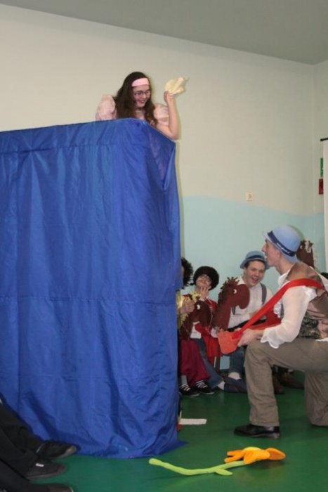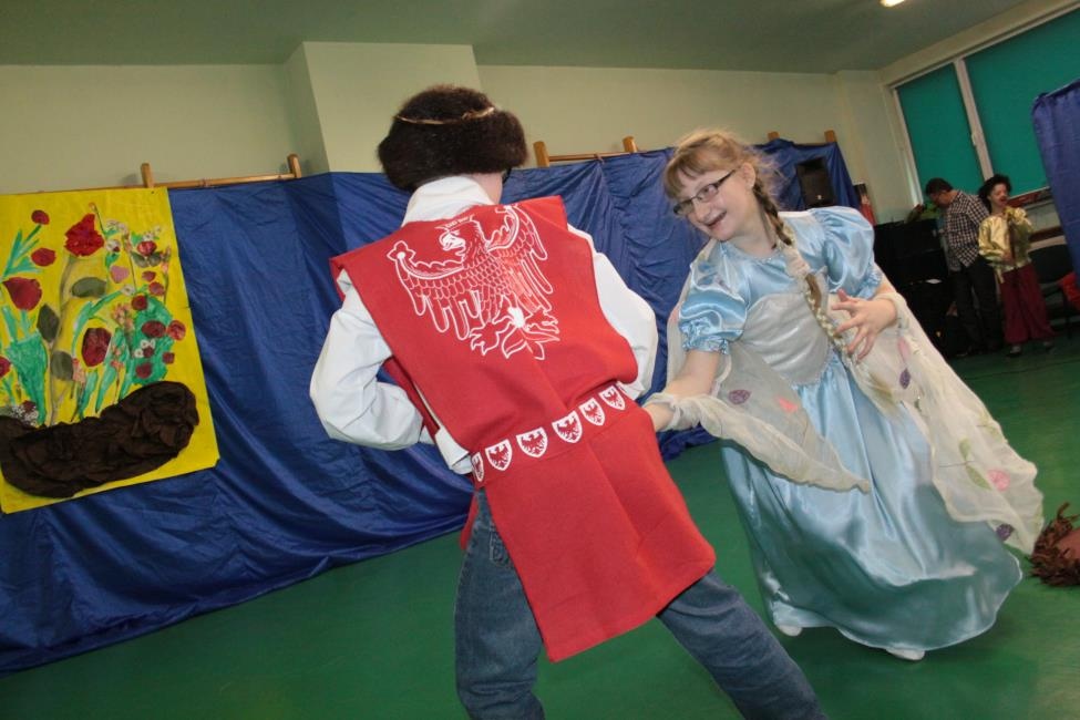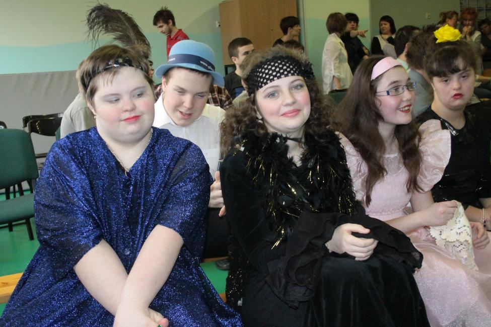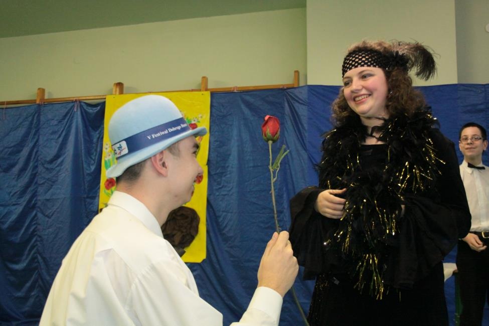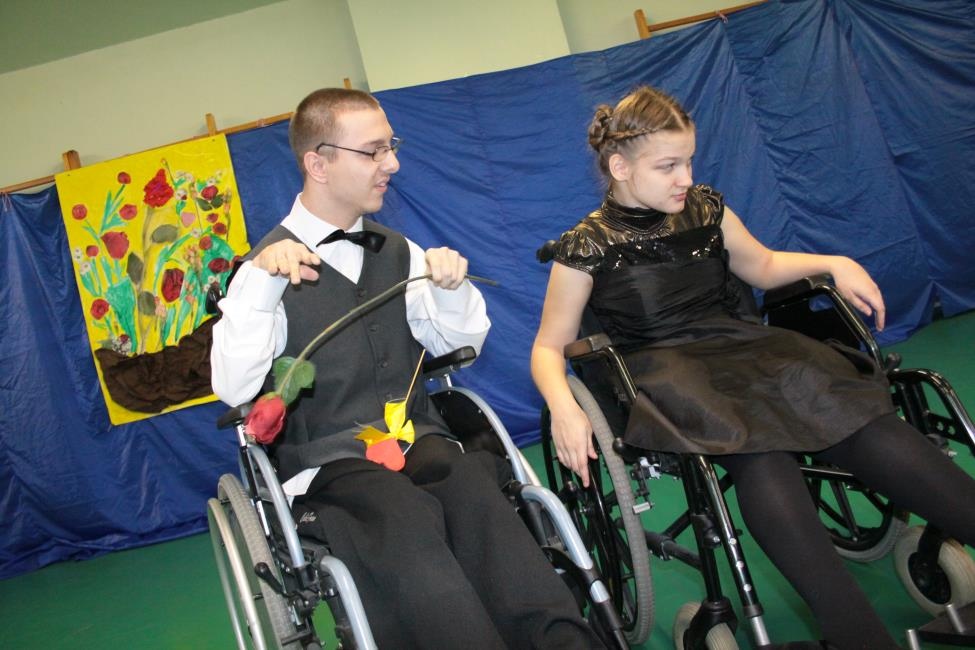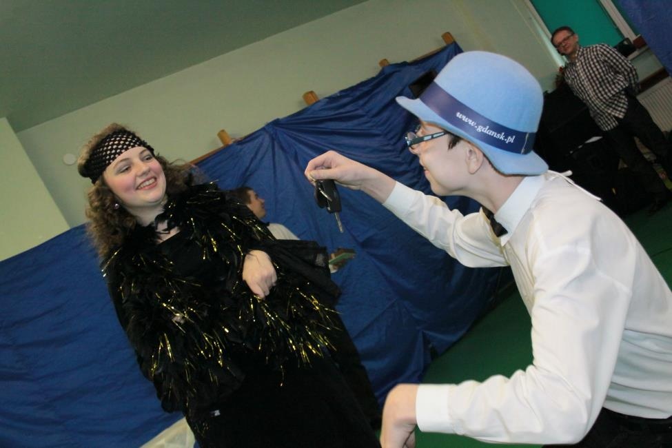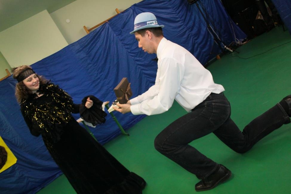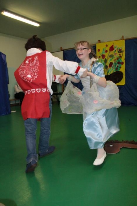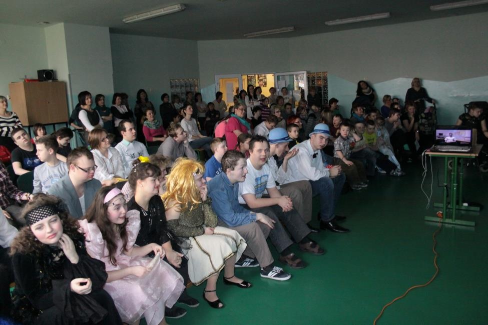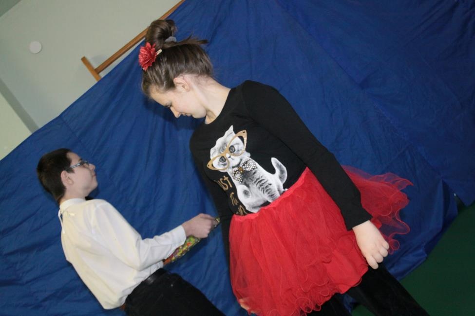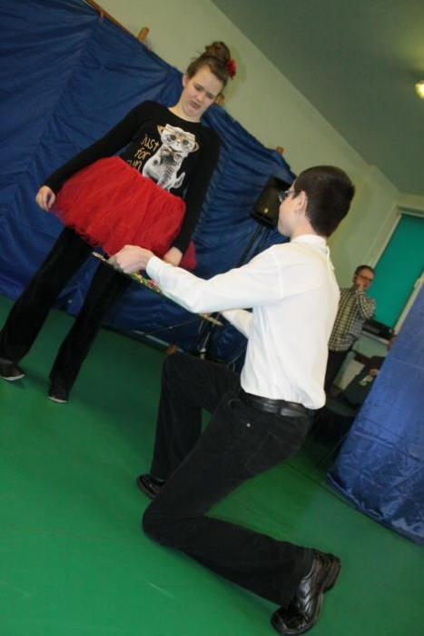 Przyszła również pora na występy naszych uczniów - członków zespołu wokalno - teatralnego BAJ, pod kierownictwem pani Moniki Ryszki. Uczniowie zainscenizowanymi utworami muzycznymi wprowadzili nas w romantyczny nastrój. Odegrane i wytańczone utwory prezentowały różne "sposoby" na to, jak mężczyna może zabiegać o kobietę. Zarówno gorące tango, romantyczna serenada pod balkonem ukochanej, sposób na "cukierka", zachwyt nad tańcem (w rytm "Ona tańczy dla mnie"), czy róża dla ukochanej, okazały się skuteczne. Wśród zgromadzonej publiczności największą sympatię i uznanie wzbudził jednak sposób zdobywania kobiety staropolskim obyczajem. (Nie ma to jak rycerz na białym koniu...). Nasi podopieczni, prezentowali się niezwykle elegancko, szczególnie dziewczyny, które z tej okazji odwiedziły "salon" fryzjerski i kosmetyczny. Jeden z naszych panów, również postanowił odegrać scenkę - i zdobyć panie na "cztery kółka"....